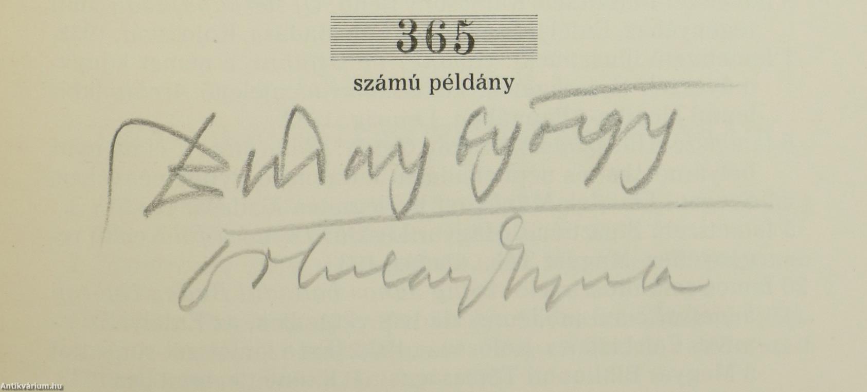 A könyv kolofont tartalmazó lapoldalán Buday György és Ortutay Gyula ceruzával beírt, jól olvasható aláírása látható.