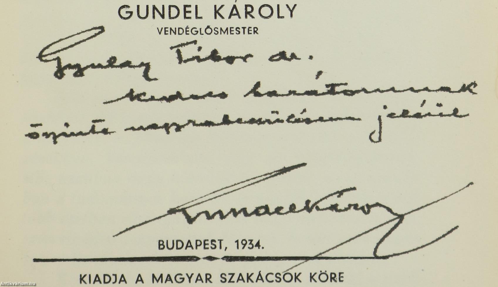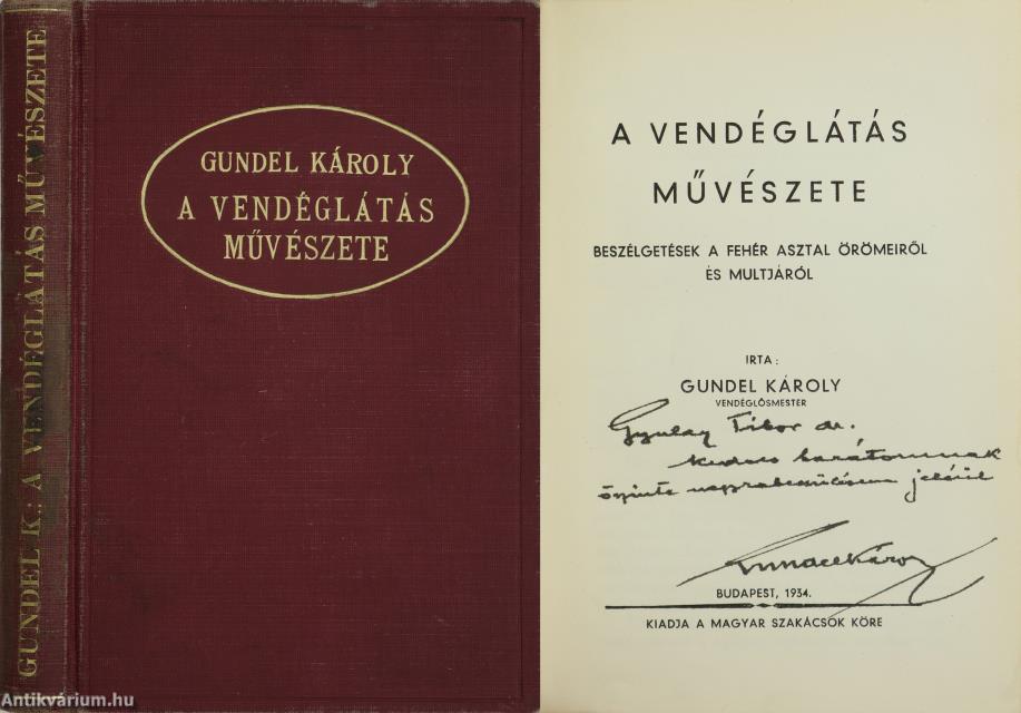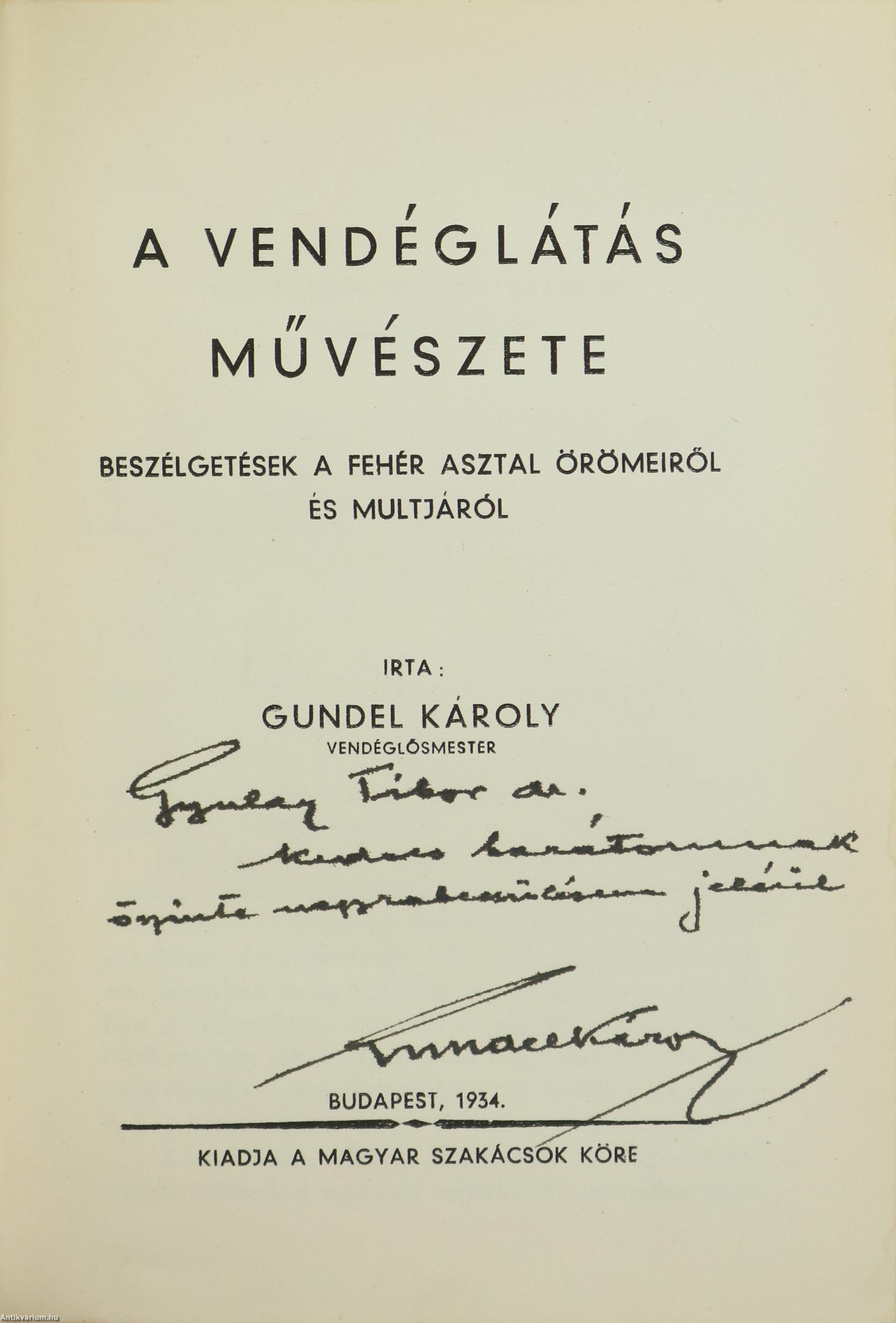 Szerző által dedikált példány.Gasztronómiai Könyvtár, no.: 1. Szerkesztik: Ballai Károly és Gundel Károly. Első kiadás. A vendéglátás művészete. Beszélgetések a fehér asztal örömeiről és multjáról. Írta: Gundel Károly. A címlapon a szerző, Gundel Károly tollal beírt, névre szóló dedikációja olvasható: "Gy. T. dr. kedves barátomnak őszinte nagyrabecsülésem jeléül Gundel Károly".