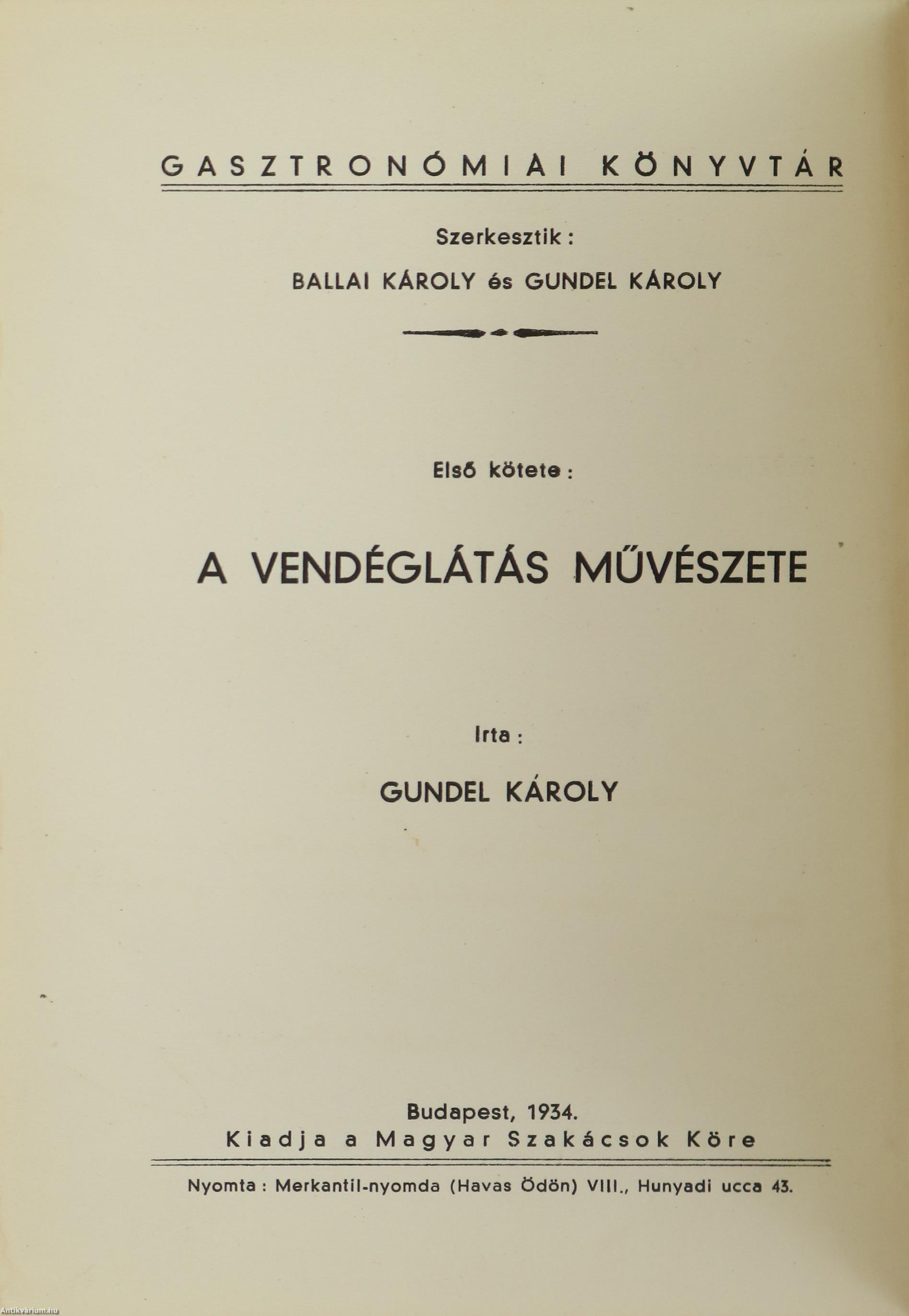 A kötet szerzője Gundel Károly (Budapest, 1883. szeptember 23. – Budapest, 1956. november 28.) vendéglős, gasztronómiai szakíró. A népszerű városligeti „Wampetics” éttermet 1910-ben vette bérbe és nevezte át a „Gundel” névre. 1920–1925 között a Royal Szálló, 1927-től a Gellért Szálló éttermeinek bérlője lett. Gasztronómiai könyvei a legjobb és legismertebb ilyen tárgyú munkák közé tartoznak. A magyar vendéglős és szállodás szakma egyik vezető egyénisége volt, idegen nyelvű munkáival szakácskiállításokon és bemutatókon népszerűsítette a magyar konyhát. Étterme az 1939-es a New York-i világkiállítás magyar pavilonjának hivatalos étterme volt. „A Gundel-vendéglő nagyobb, jobb hírverést biztosít Budapest számára, mint egy hajórakomány turista prospektus.” – írta róla a New York Times. "Ha van Budapesten, ami tökéletesen és hiánytalanul európai, akkor az az asztal, amelyet Gundel Károly megterít és amelyet Gundel Károly lát el a legremekebb fogásokkal. Ízlés, ötletesség, a vendég megbecsülése, mind olyasmi, amelyekkel ebben az országban igazán Gundel Károly rendelkezik legjobban." – írta Gundel Károlyról a "Fővárosi Hírlap" 1935-ben.