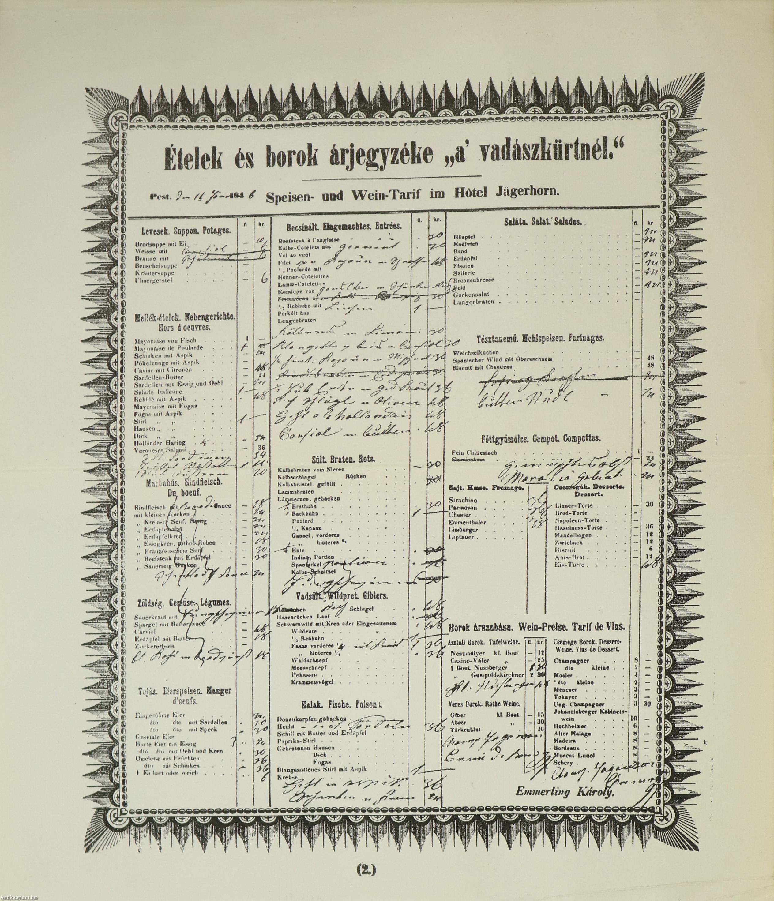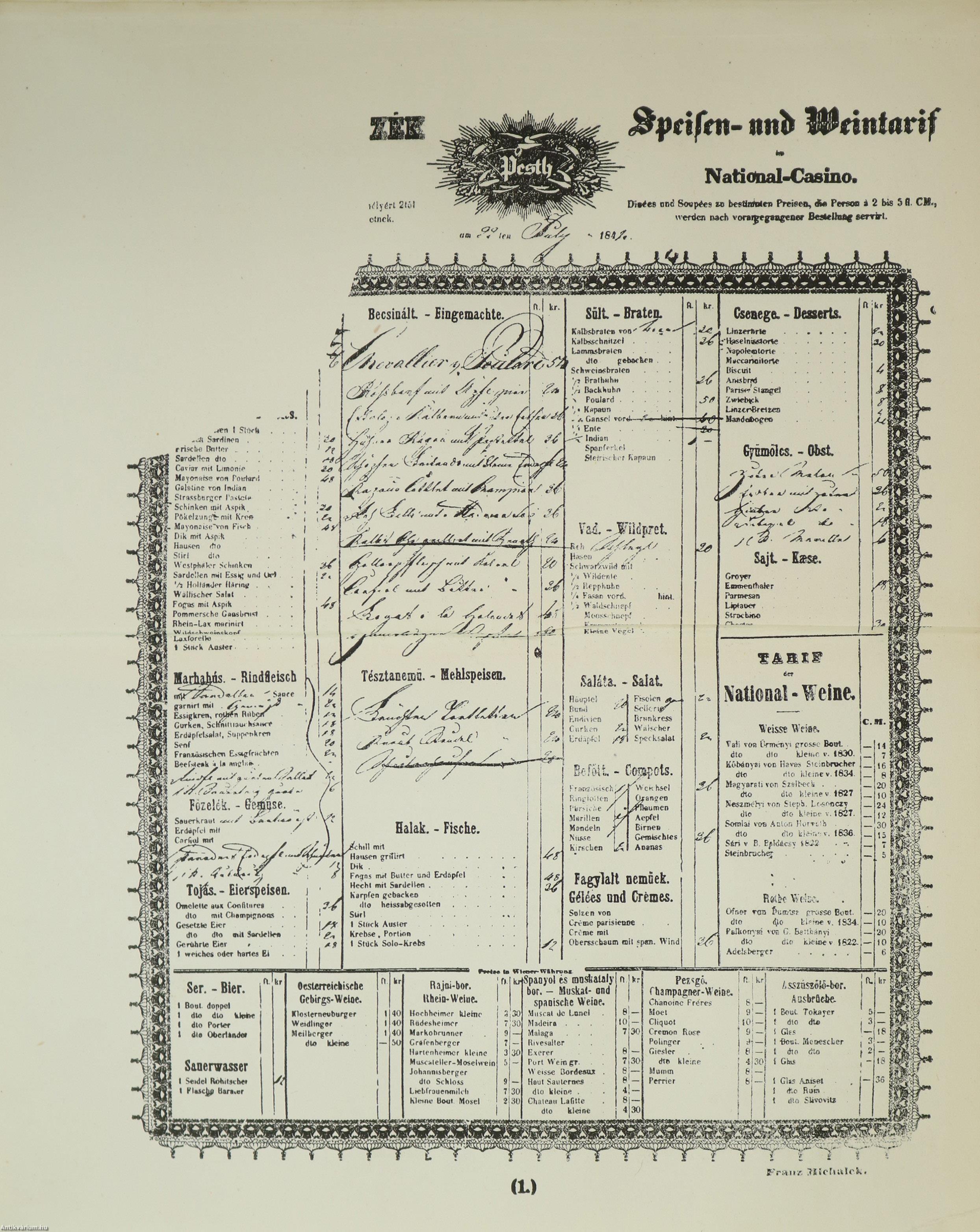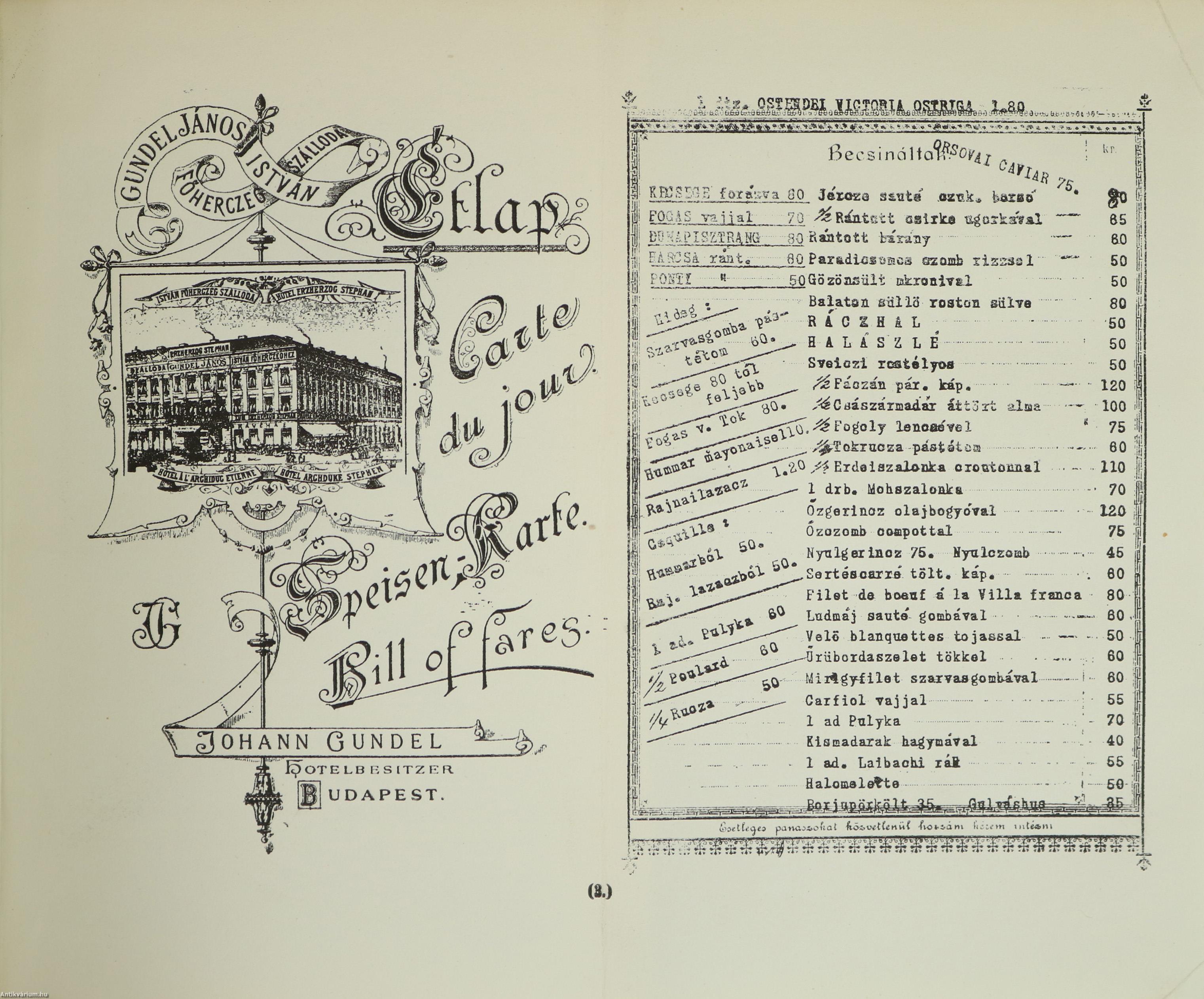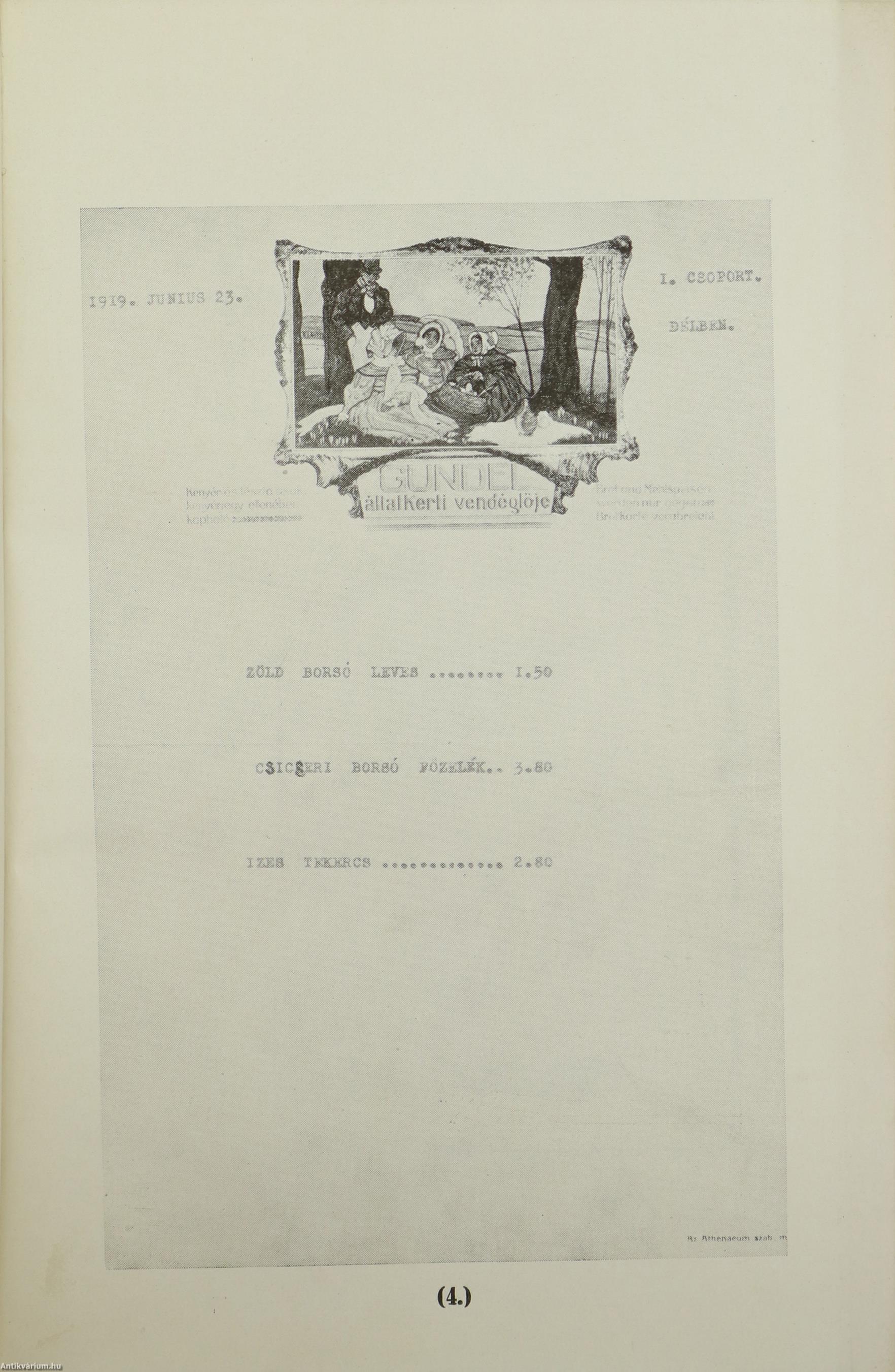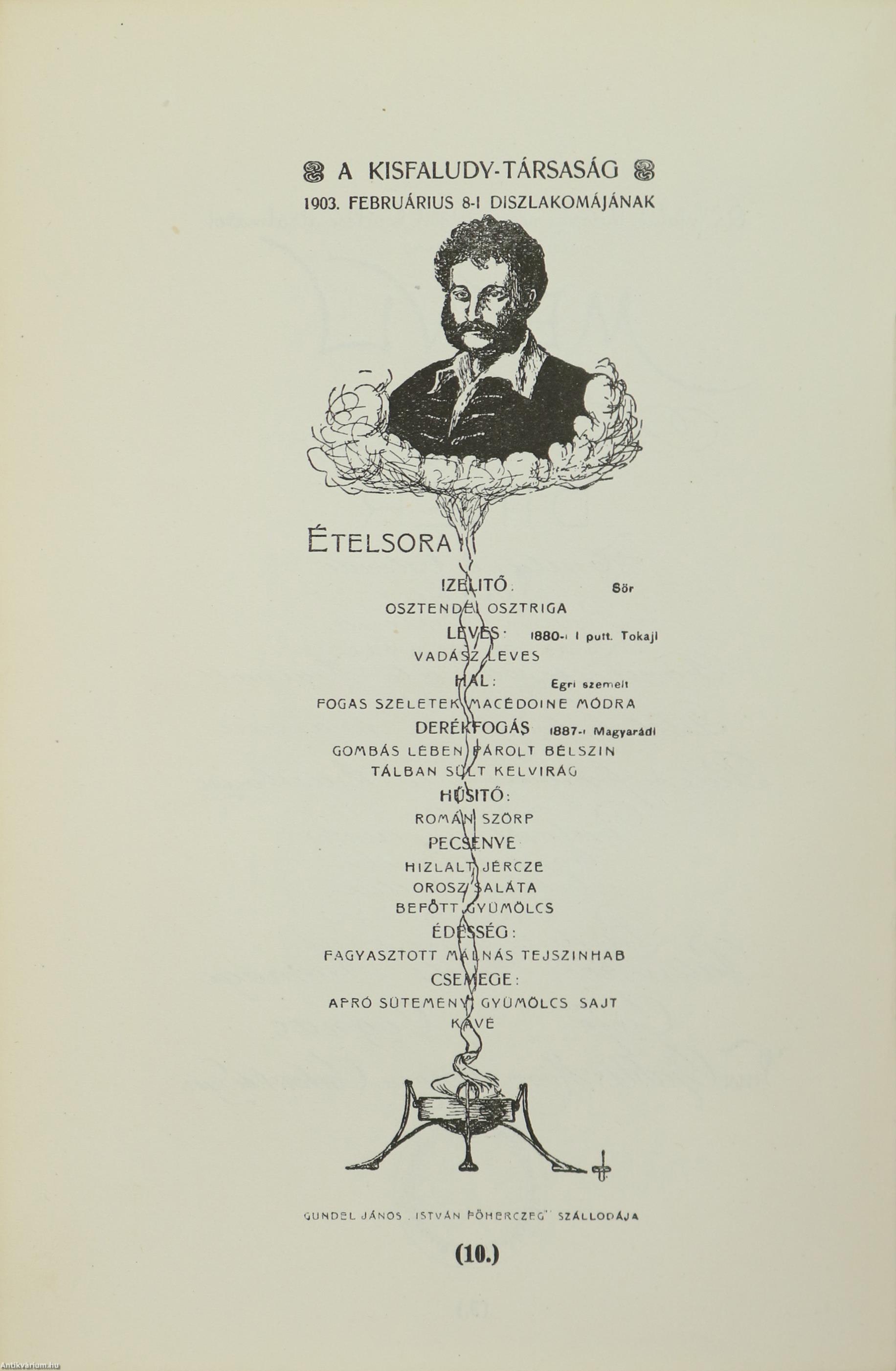 17 étlap és ételsor hasonmását közlő függelékkel (a hasonmások közül 3 kihajtható) és tartalomjegyzékkel. Nyomtatta a Merkantill-nyomda Budapesten. Kiadói egészvászon kötésben lévő példány aranyozott feliratos címfedéllel és könyvgerinccel, színes előzéklapokkal, tiszta belívekkel, hiánytalan, jó állapotban.