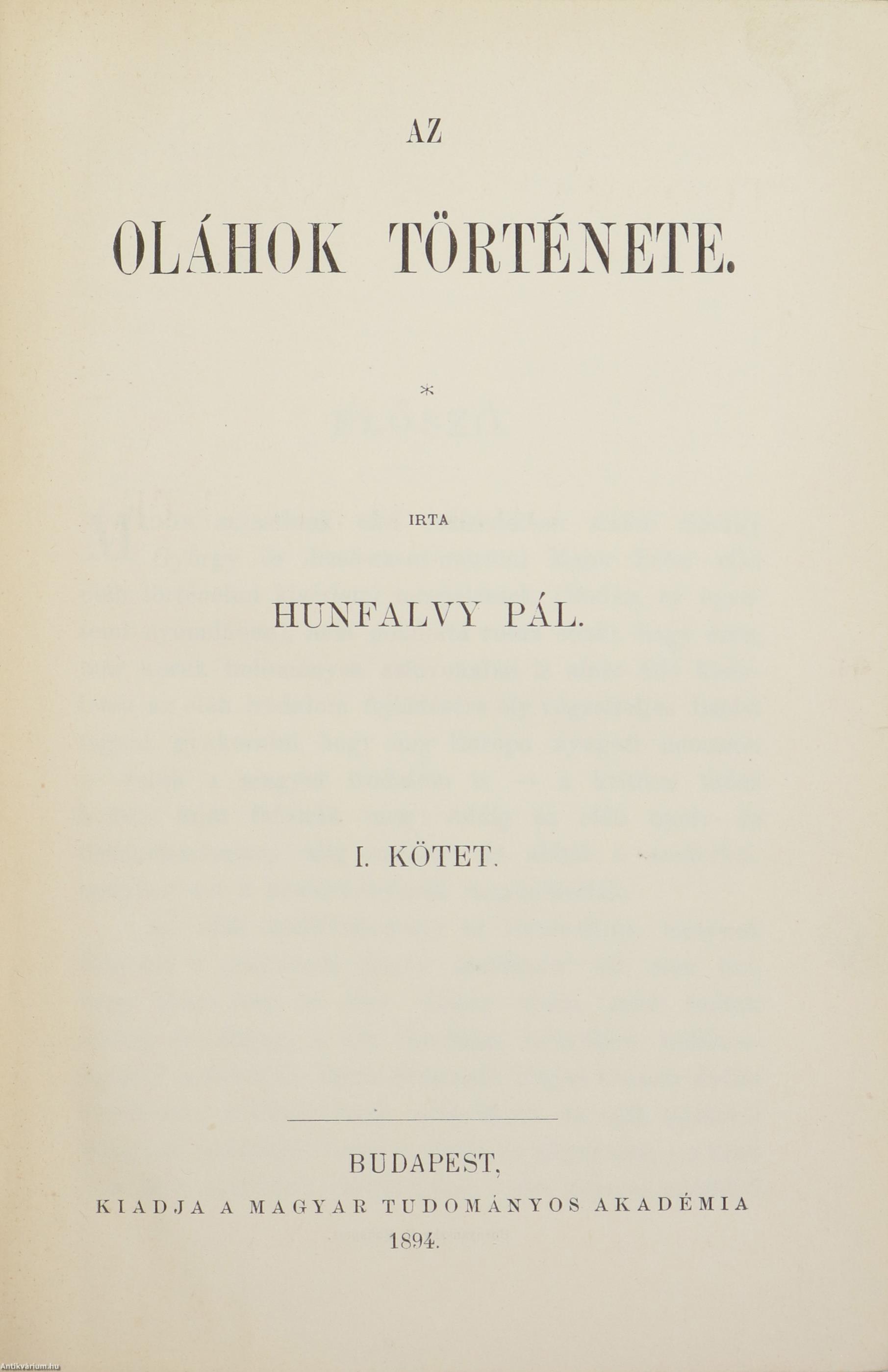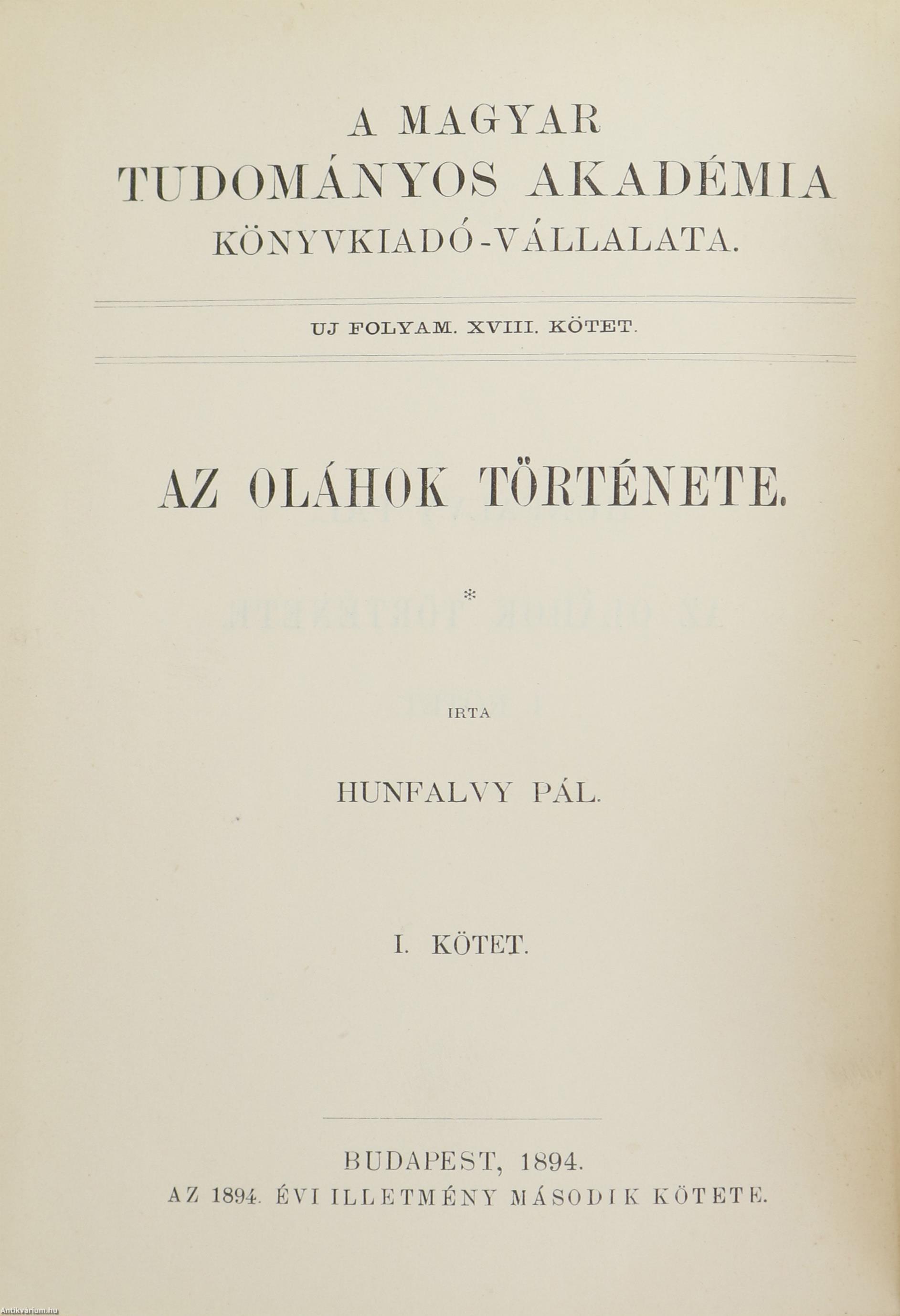 Az oláhok története. I-II. (Egységes külön kötetekben.) Írta: Hunfalvy Pál.