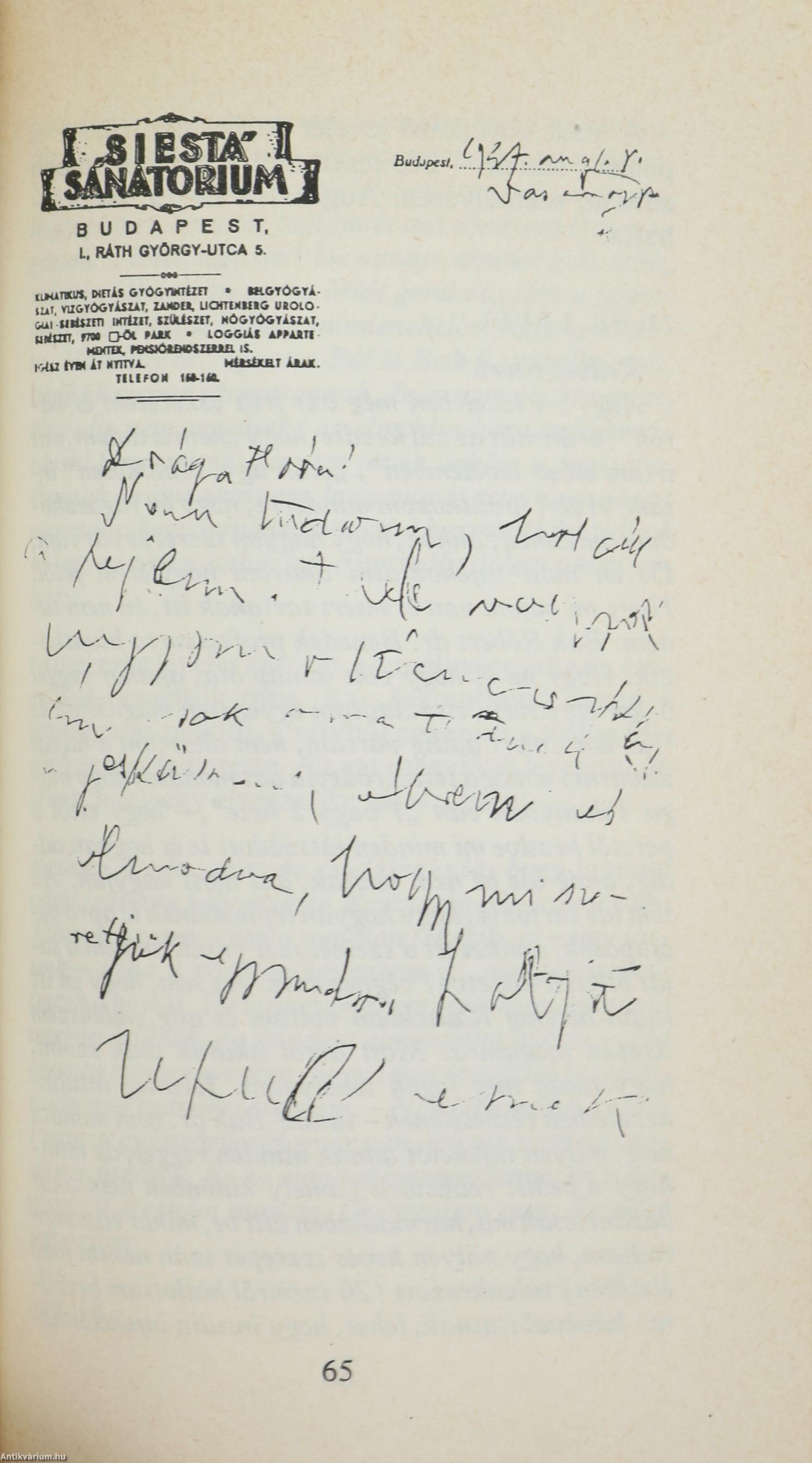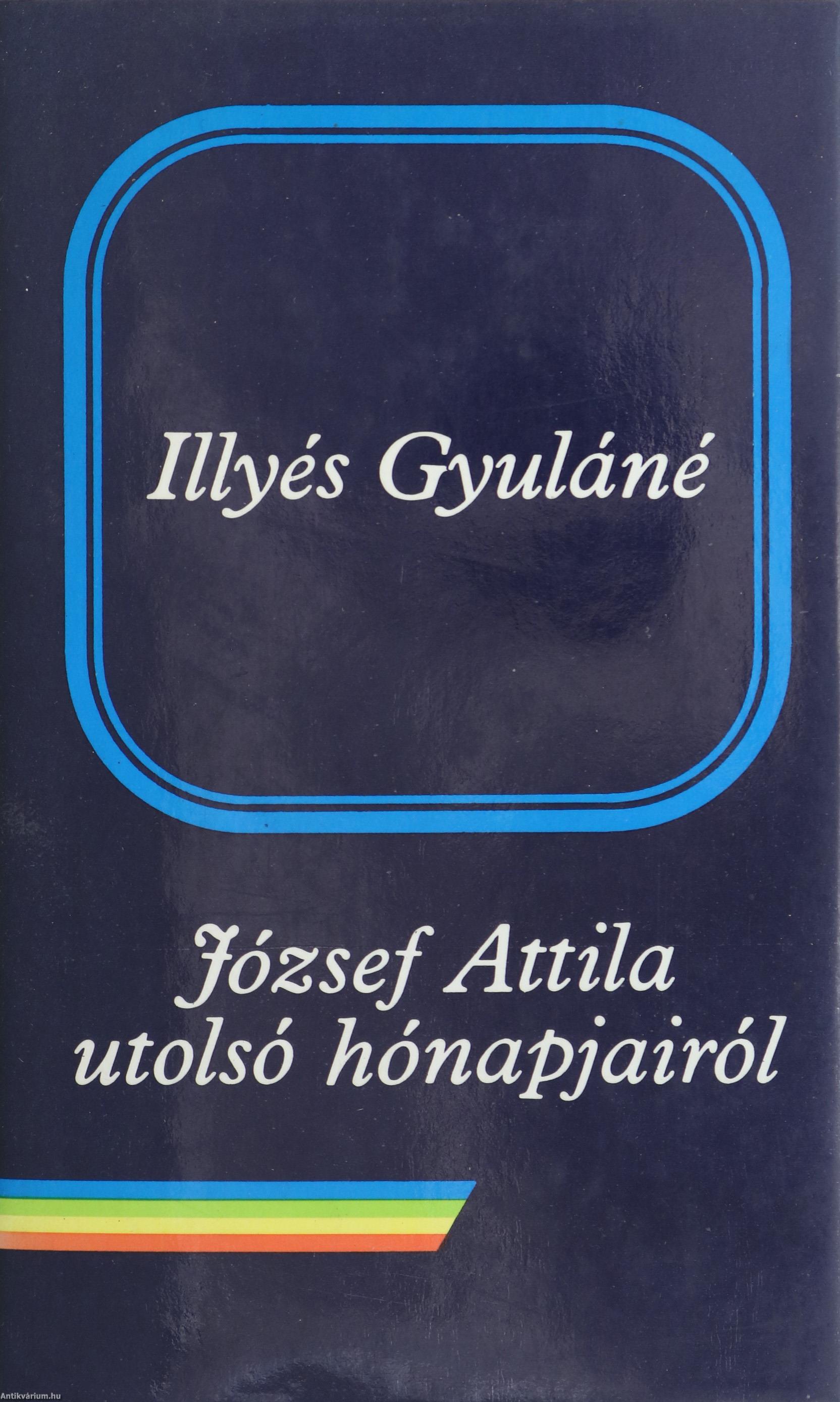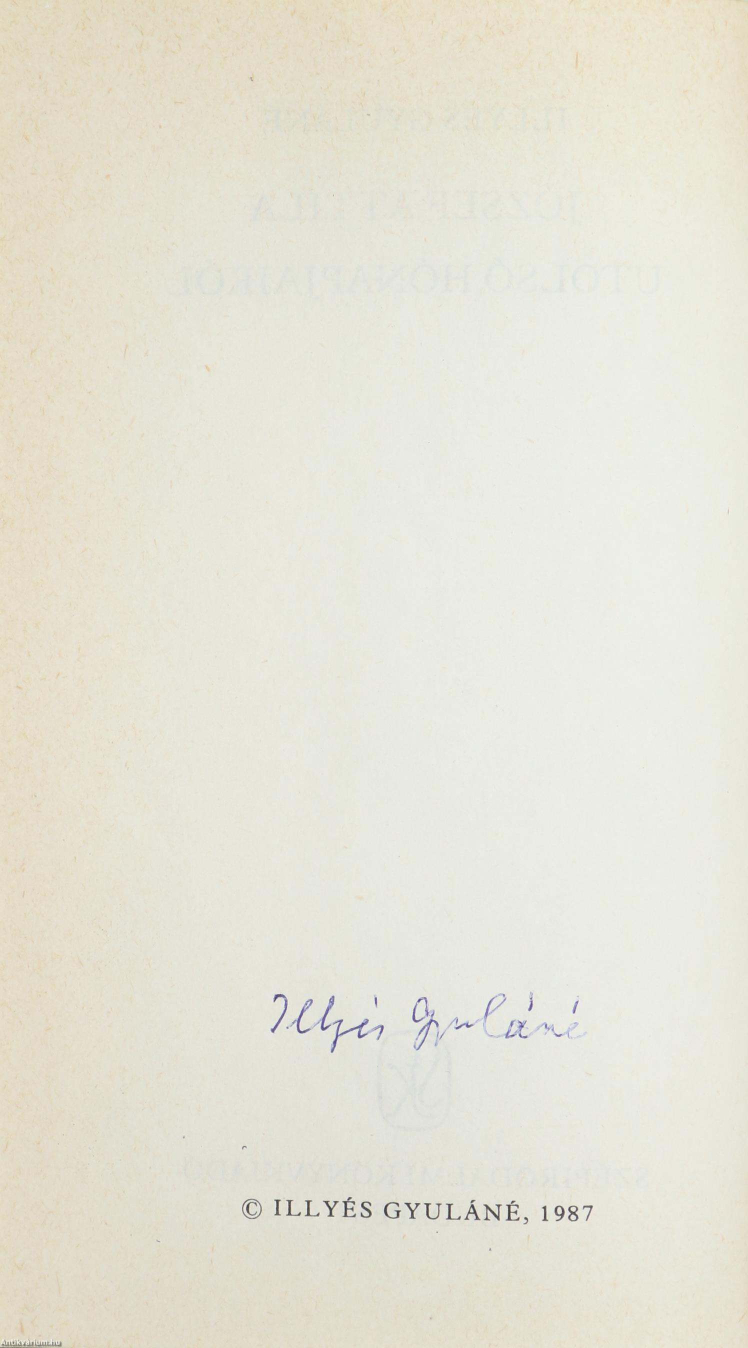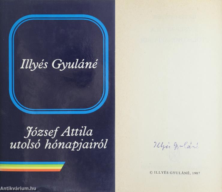 Szerző által aláírt példány. József Attila utolsó hónapjairól. Írta: Illyés Gyuláné. A címlap verzóján a szerző, Illyés Gyuláné tollal beírt, jól olvasható aláírása látható. Néhány szöveg közti dokumentummásolattal ellátott kötet. A borító- és a kötésterv Kolosváry Bálint munkája. Nyomtatta az Alföldi Nyomda, Debrecenben. Kiadói fűzött kemény papírkötésben lévő példány feliratos címfedéllel és könyvgerinccel, tiszta belívekkel, hiánytalan, jó állapotban, feliratozott, színes, a szerző fekete-fehér portréjával ellátott kiadói borítófedélben. A kötet szerzője, Illyés Gyuláné /dr. Kozmutza Flóra Emília/ (Budapest, 1905. november 21. – Budapest, 1995. május 14.) gyógypedagógus, pszichológus, francia-német-magyar szakos középiskolai tanár. A magyar gyógypedagógiai pszichológia művelője, megújítója, működési körének kiszélesítője, rendszerbe foglalója, az író Illyés Gyula felesége. Tanulmányait a Pázmány Péter Tudományegyetemen és a párizsi Sorbonne-on végezte. 1932-1935 között recenziókat írt az Athenaeum című lapban. 1931-ben jelentkezett a Gyógypedagógiai Tanárképző Főiskolára (Tanárai: Szondi Lipót, Tóth Zoltán, Bárczi Gusztáv). Főiskolai gyakornok, igazgatói asszisztens. 1936 és 1940 között a Szondi Lipót vezette Gyógypedagógiai Kórtani és Gyógytani Laboratórium munkatársa. Kollégáival együtt a Lipótmezei Elmegyógyintézetben végzett lélektani vizsgálatokat.