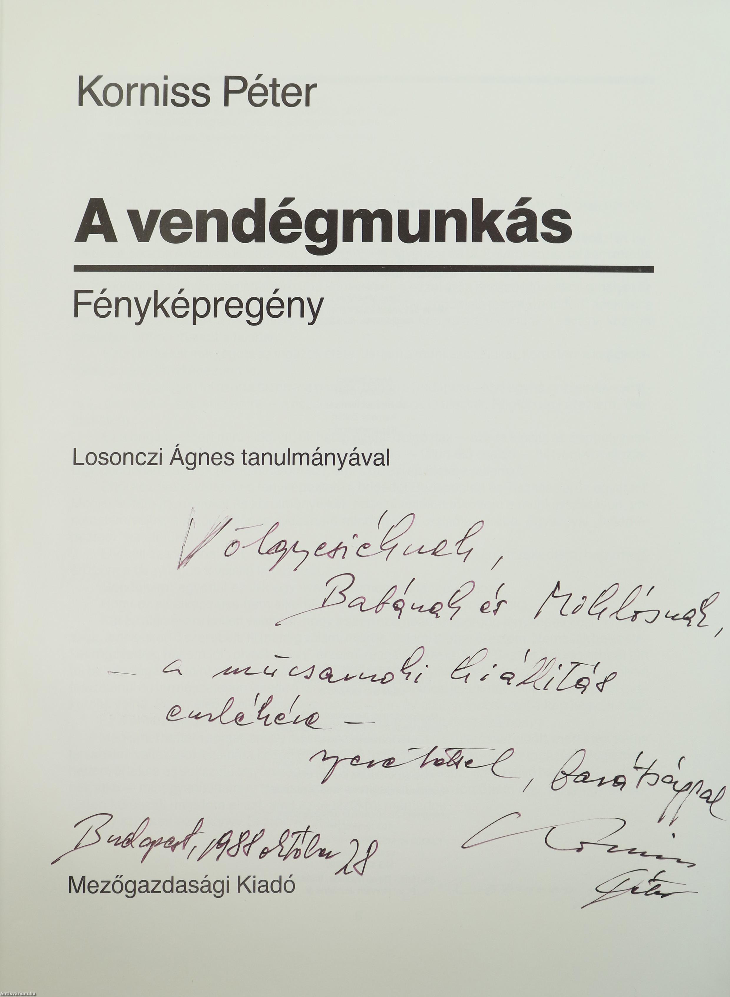 Korniss Péter által dedikált példány. Első kiadás. A vendégmunkás. Fényképregény. Losonczi Ágnes tanulmányával. / The Guest Worker. A novel of photographs. Essay by Ágnes Losonczi. Fotózta: Korniss Péter.