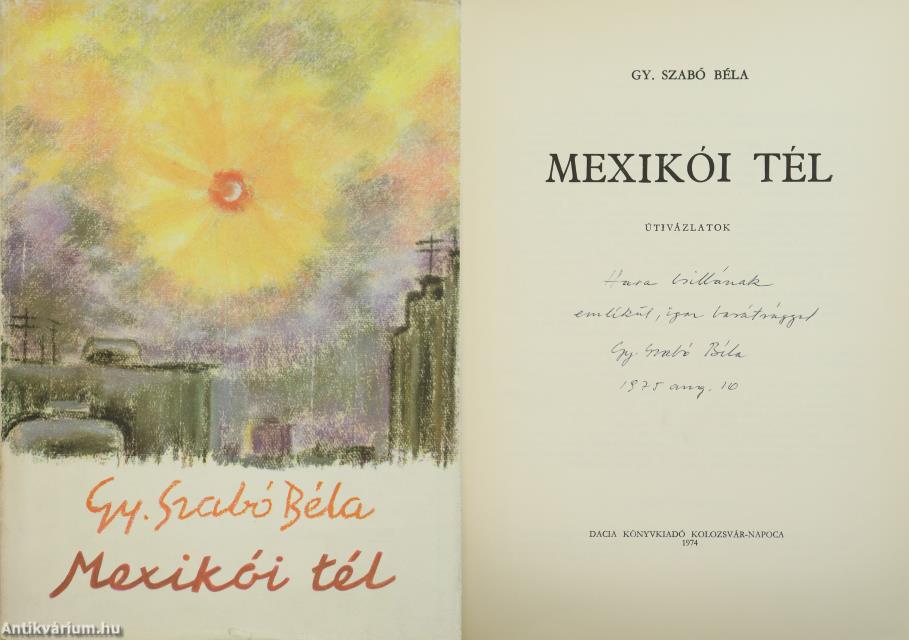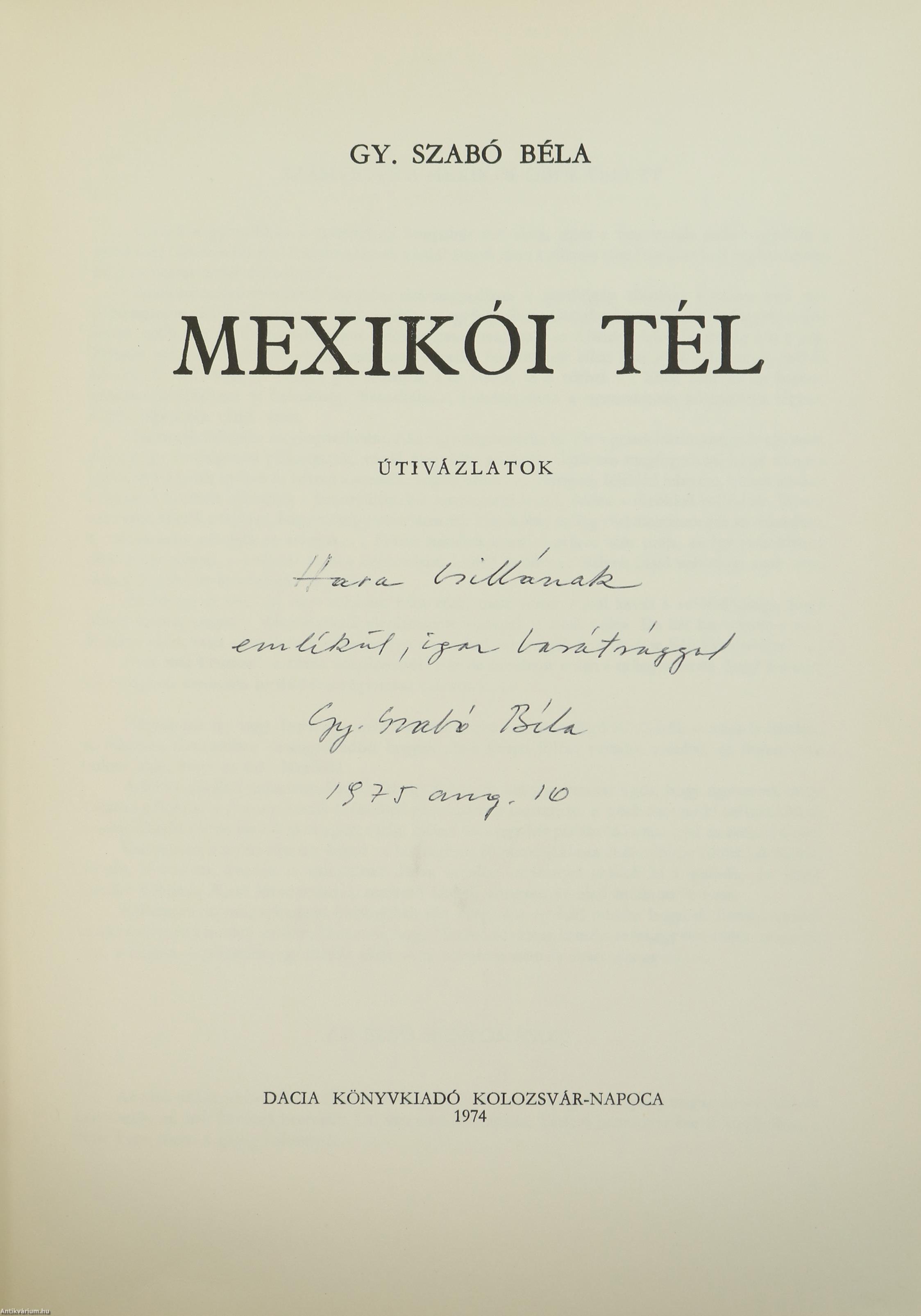 Gy. Szabó Béla szerző, egyben a kötet grafikusa által dedikált példány. Mexikói tél. Útivázlatok. Írta: Gy. Szabó Béla.