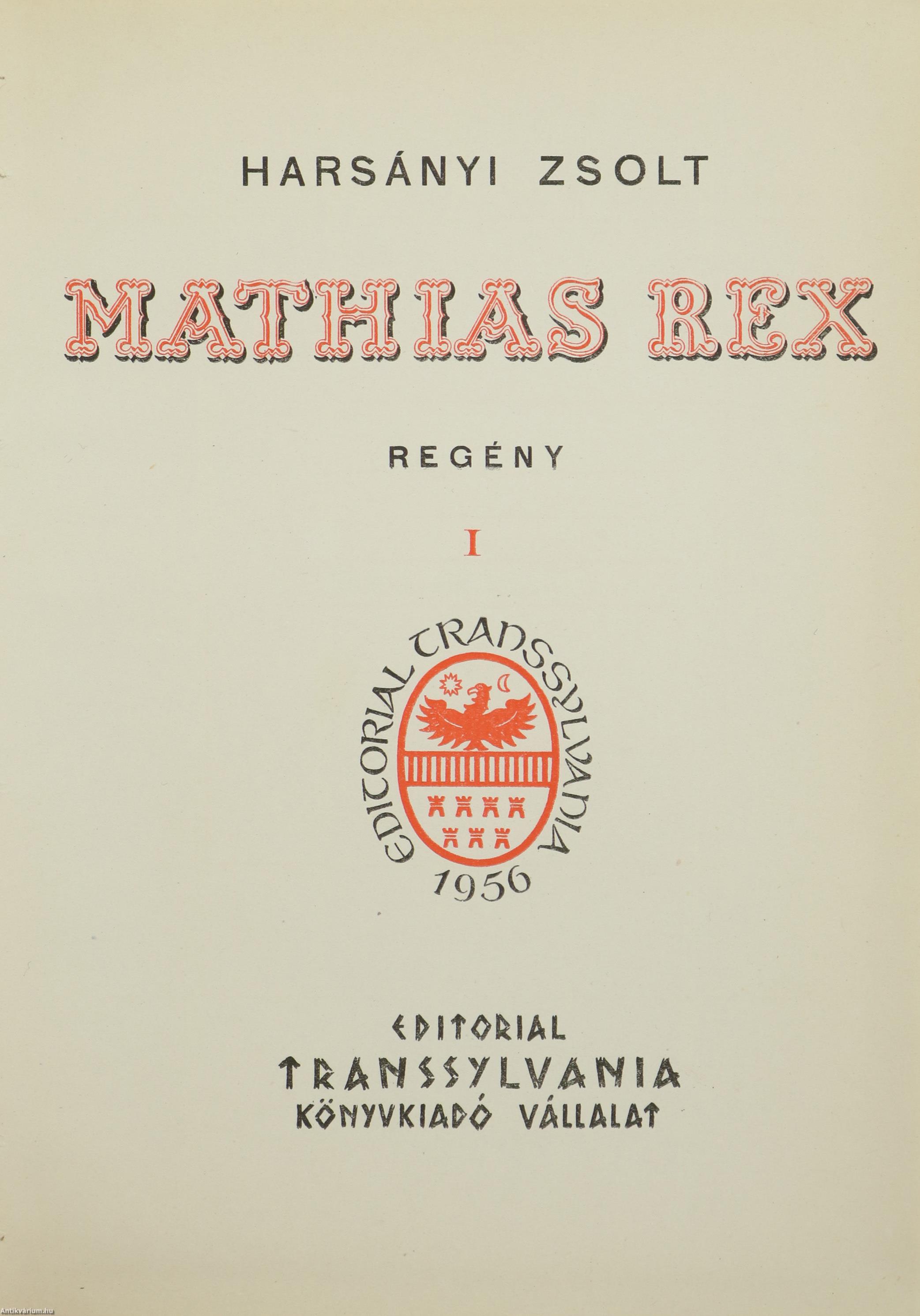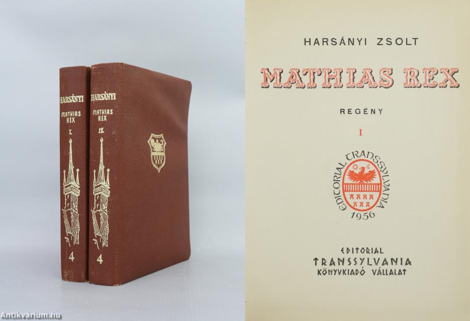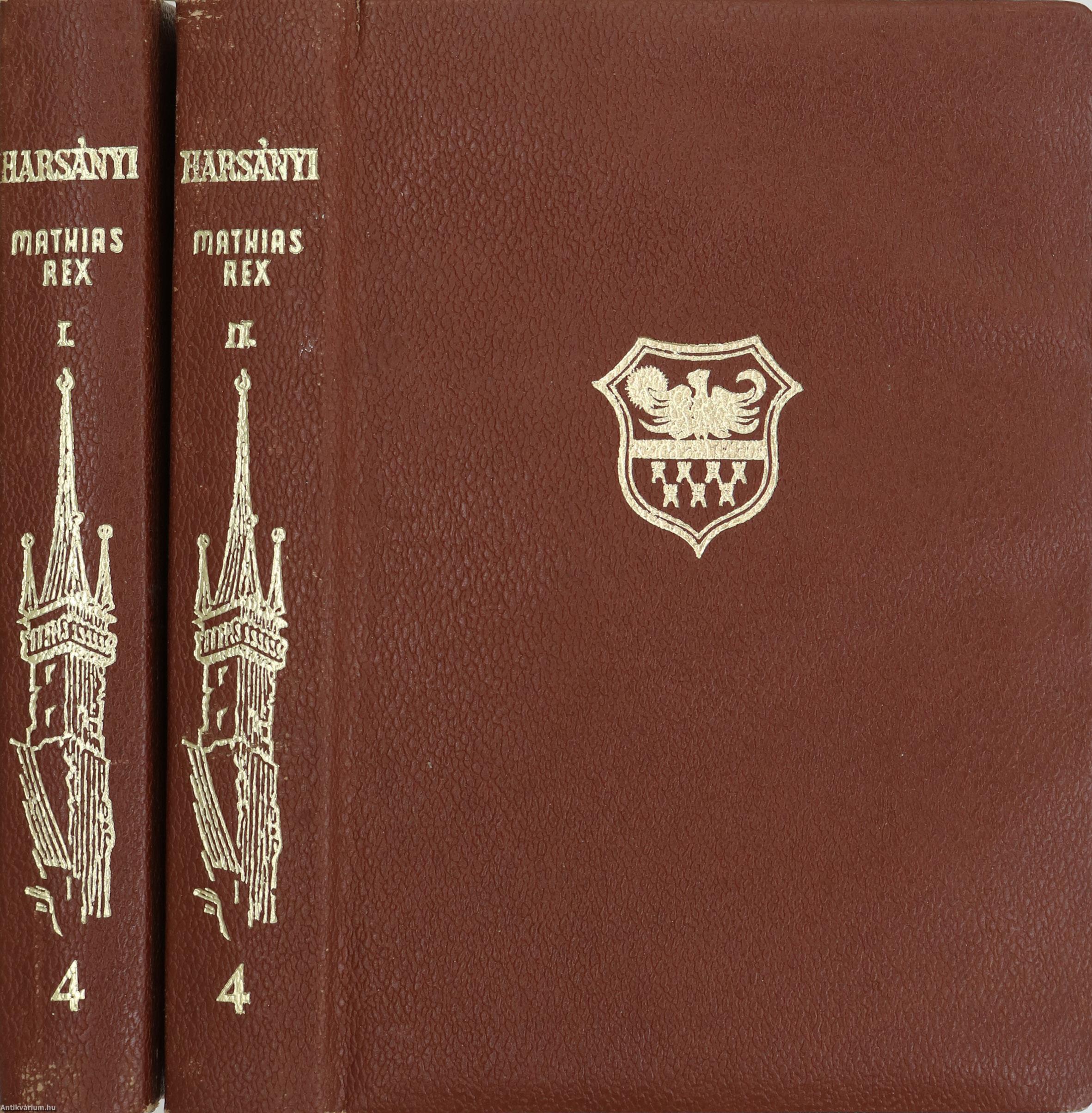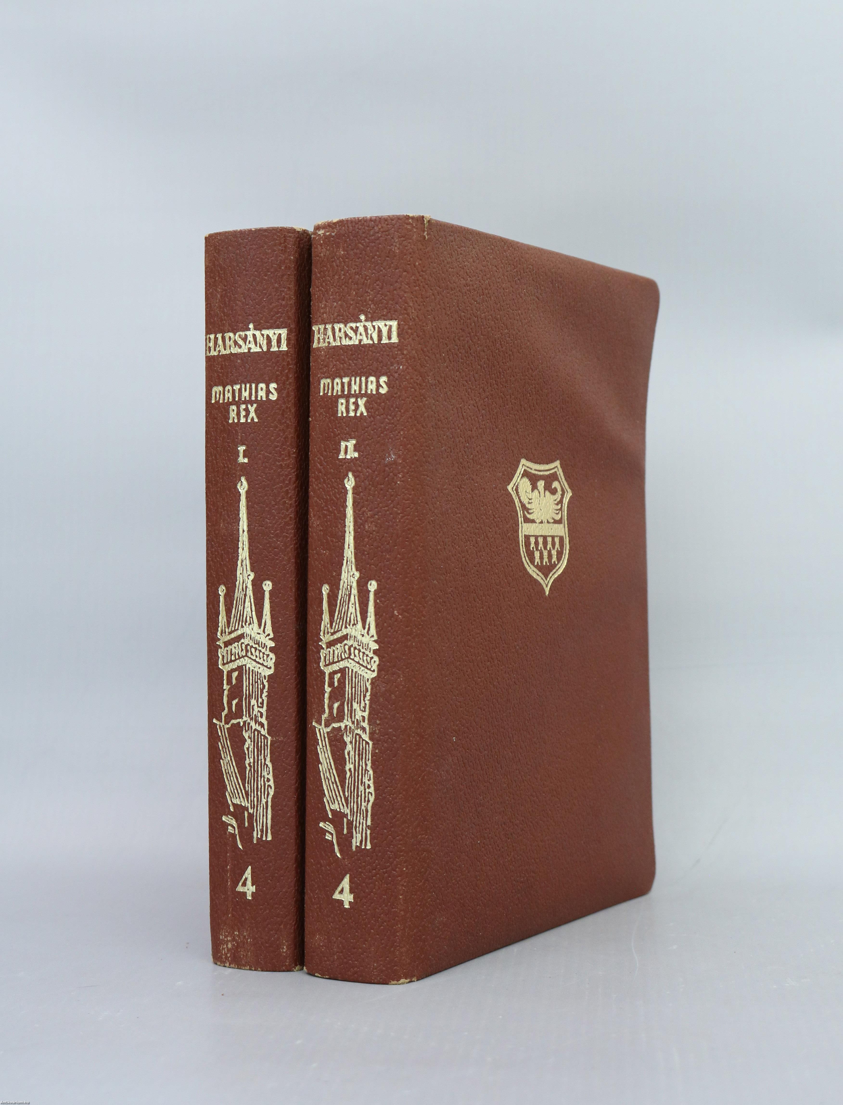 Emigrációs kiadás. Magyar történelmi regénysorozat, No.: 4. sz. Mathias Rex I-II. (Különálló egységes kötetekben.) Regény. Írta: Harsányi Zsolt. A könyvek 1958 augusztus és október havában készültek a Danubio Magyar Nyomdavállalat Műhelyében, Buenos Aires-ben. Kiadói egészbőr kötésben lévő kötetek aranyozott címerrel díszített címfedéllel, aranyozott feliratozású, illusztrált könyvgerinccel, színes, növénymotívumokkal díszített kiadói előzéklapokkal, hiánytalan állapotban. A kötet szerzője, Harsányi Zsolt (Korompa, 1887. január 27. – Budapest, 1943. november 29.) író, újságíró, műfordító, színigazgató. A két világháború közötti korszak népszerű, széles olvasóréteget megnyerő szerzője. Többek között a Budapesti Hirlap, a Pesti Hírlap és az Új Idők állandó munkatársa, a Vígszínház igazgatója, a Kisfaludy és a Petőfi Társaság tagja.