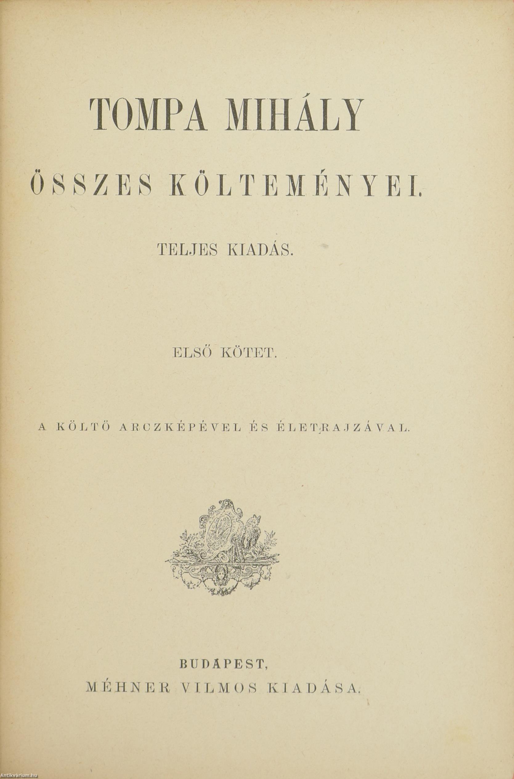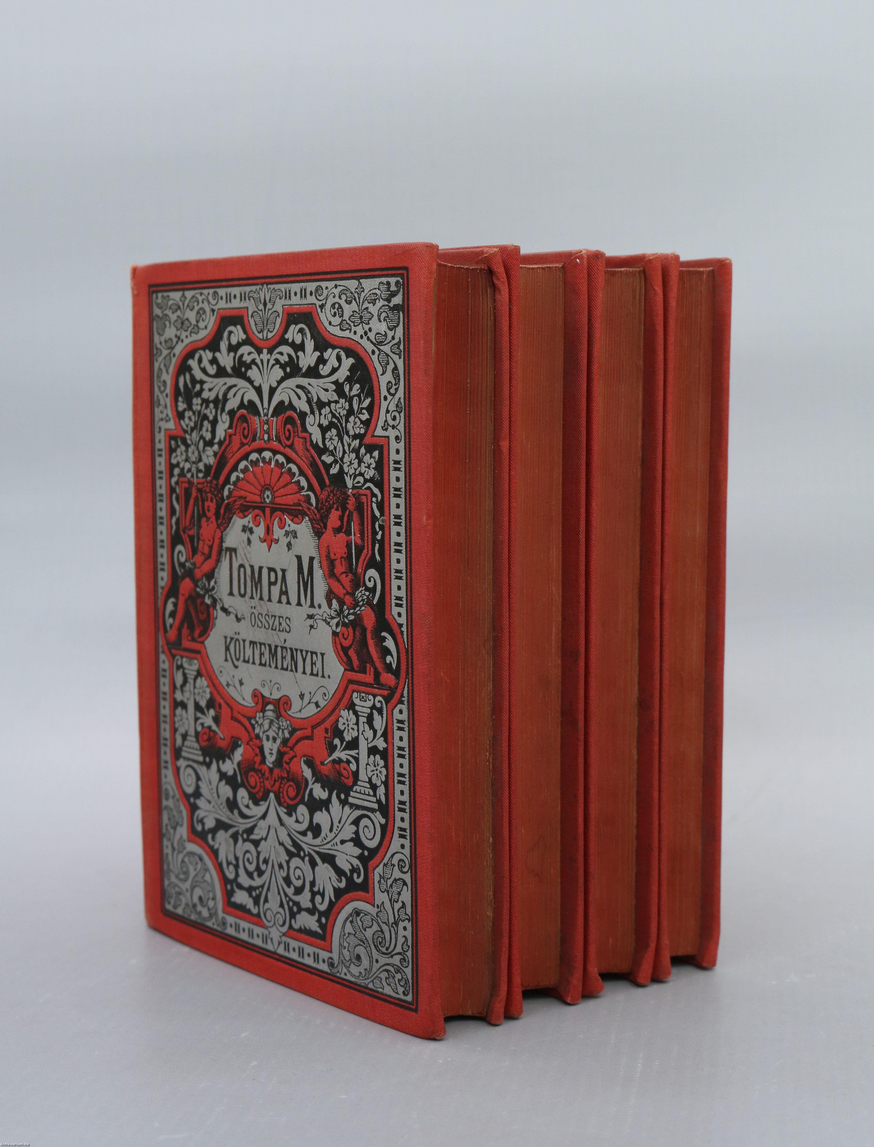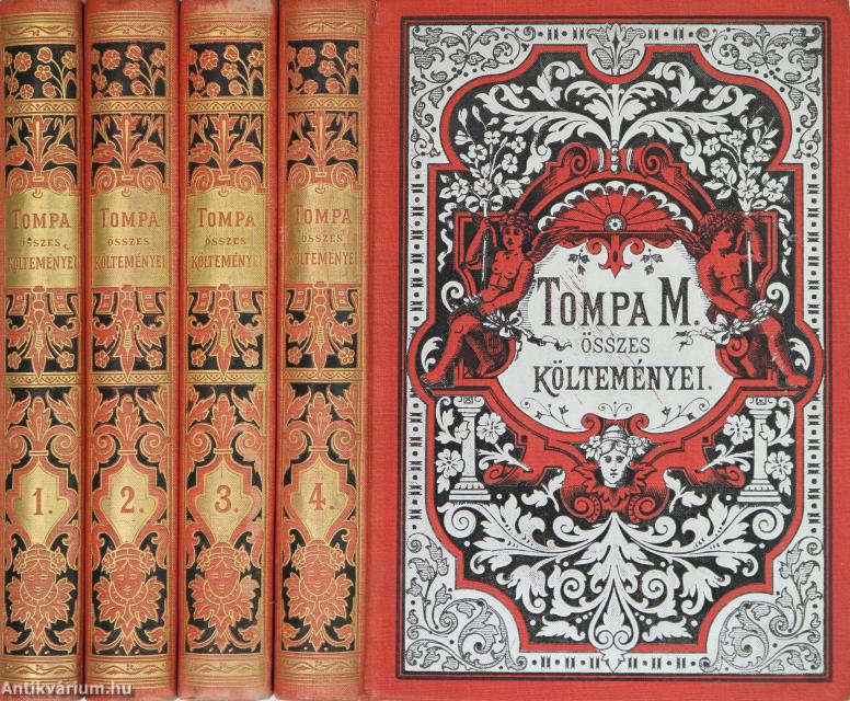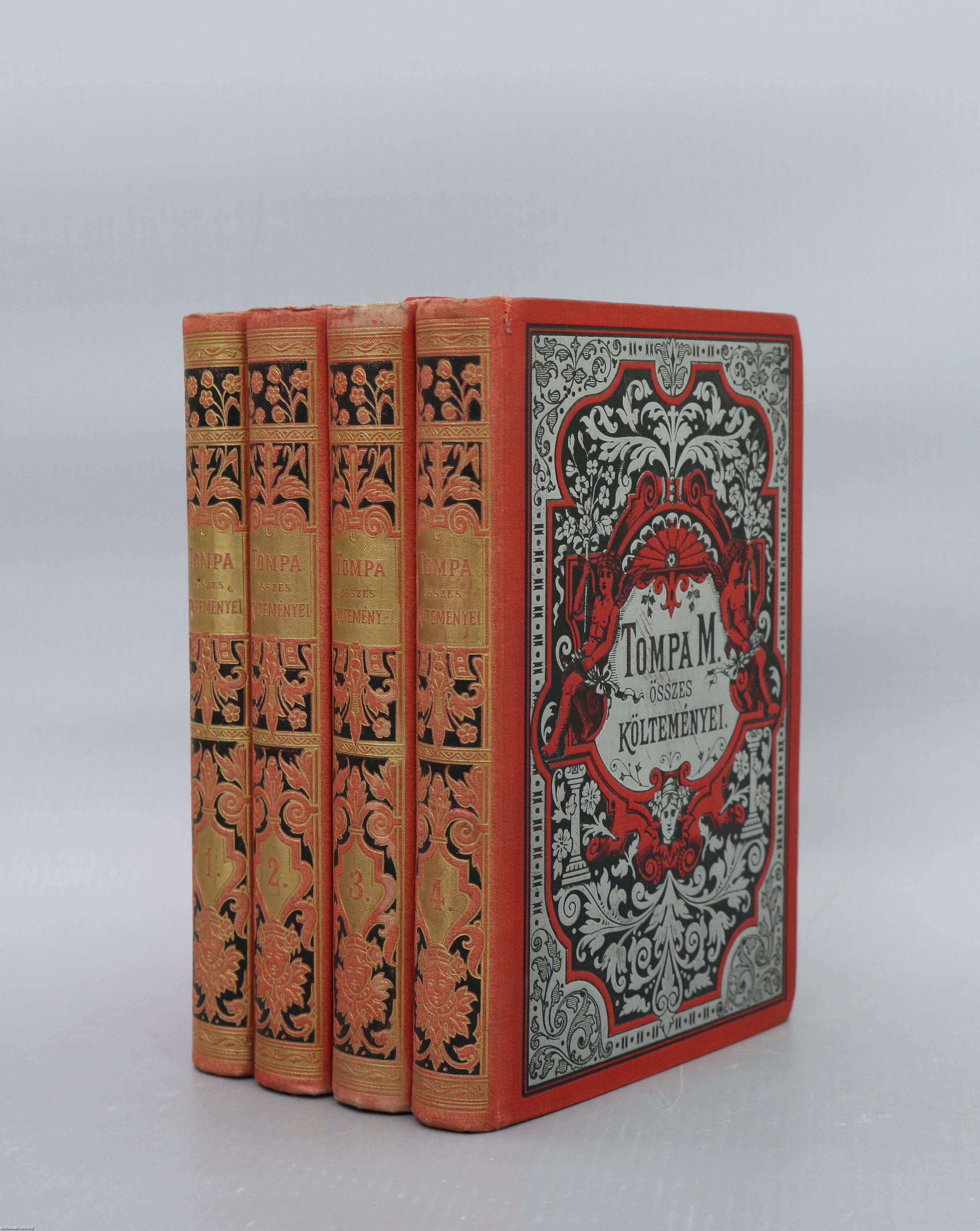 I. kötet: Tompa Mihály életrajz. / Dalok, ódák. 355 p. + [1] t.: ill. II. kötet: Dalok. Ódák. 415 p. III. kötet: Balladák, beszélyek. / Regék. 420 p. IV. kötet: Népregék. / Virágregék. 382 p.