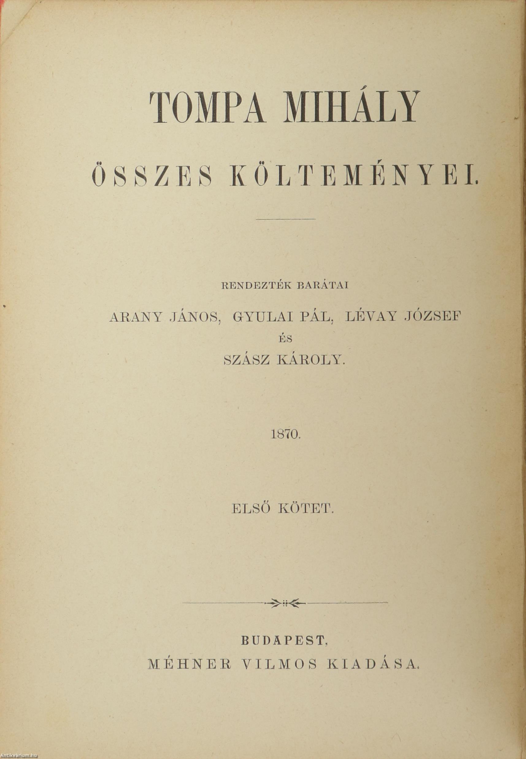 Tompa Mihály összes költeményei I-IV. (Egységes külön kötetekben.) Teljes kiadás. Írta: Tompa Mihály. Rendezték barátai: Arany János, Gyulai Pál, Lévay József és Szász Károly.