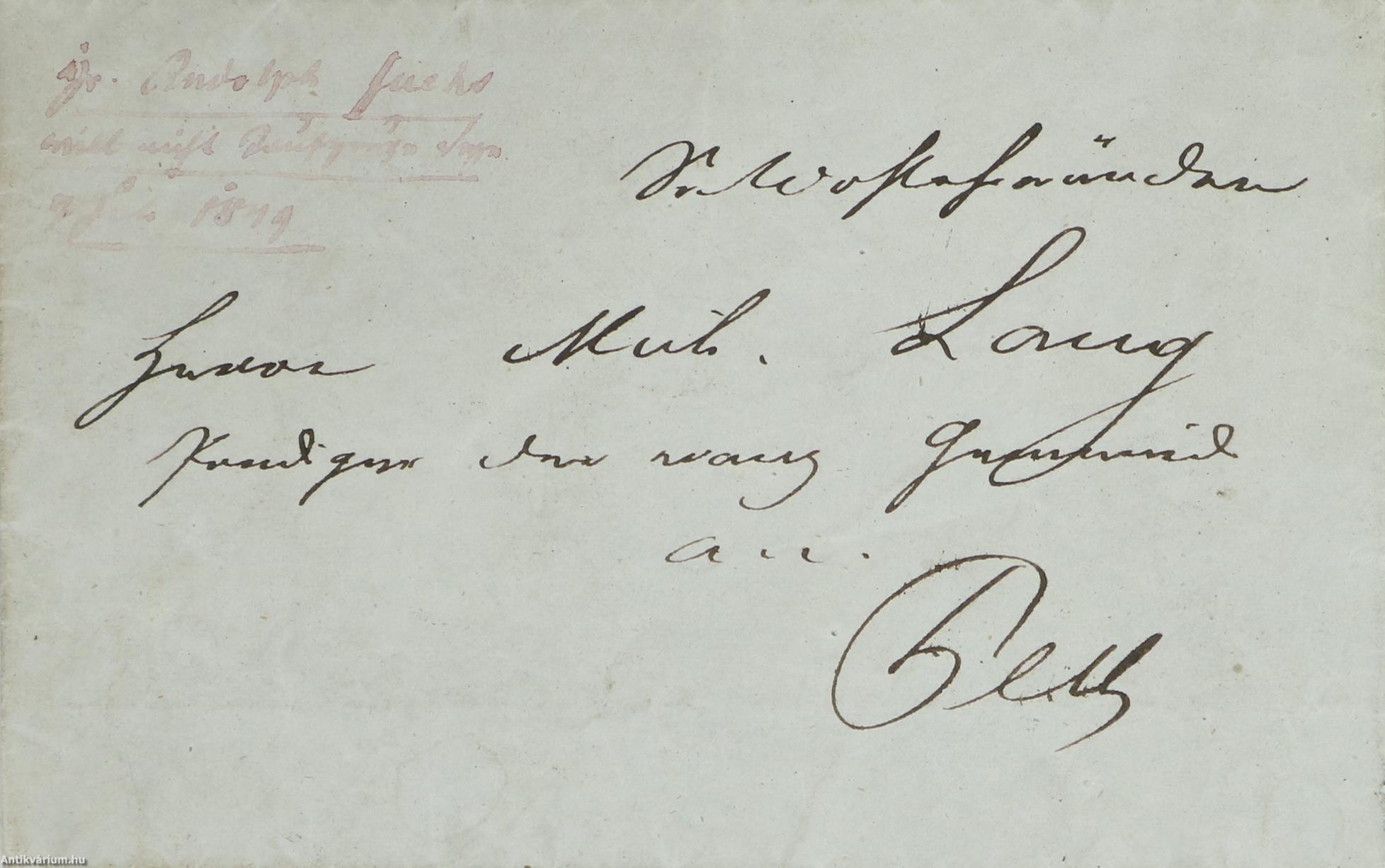 Tollal írt, német nyelvű kézirat. A dokumentum bal felső sarkán a Fuchs-féle dohány- és szivargyár szárazbélyegzője („Fuchs Philips és Társok Pesten”) látható. A levél hátoldalának közepén, a feladóra vonatkozó, elhalványult bejegyzések mellett látható a korabeli, német nyelvű címzés: „Sr. Wohlehrwürden Herrn Mich. Lang Prediger der evang. Gemeinde Pest.” Azaz: „Őtisztelendőségének, Mich[ael] Lang úrnak, a pesti evangélikus gyülekezet prédikátorának.”