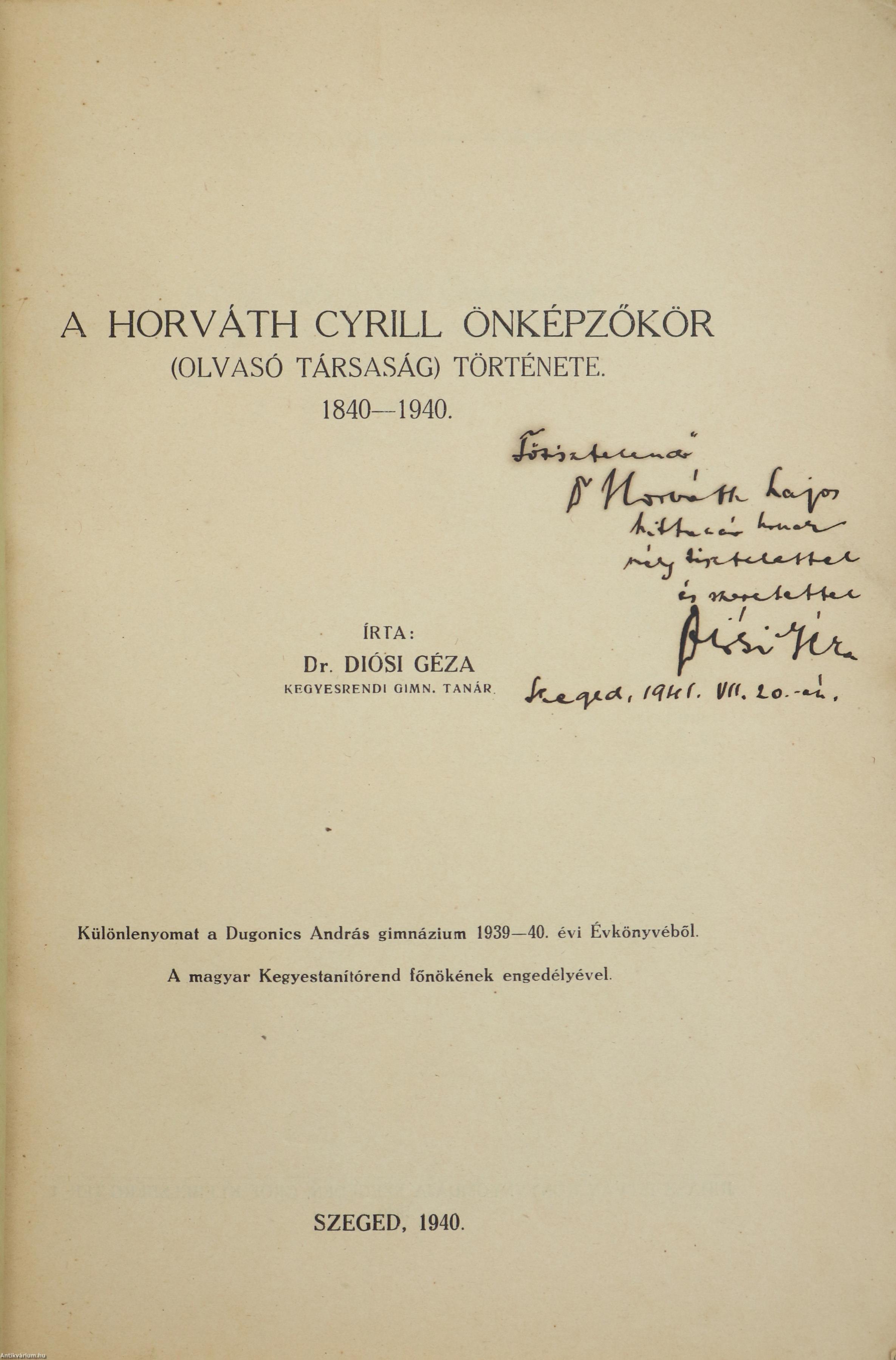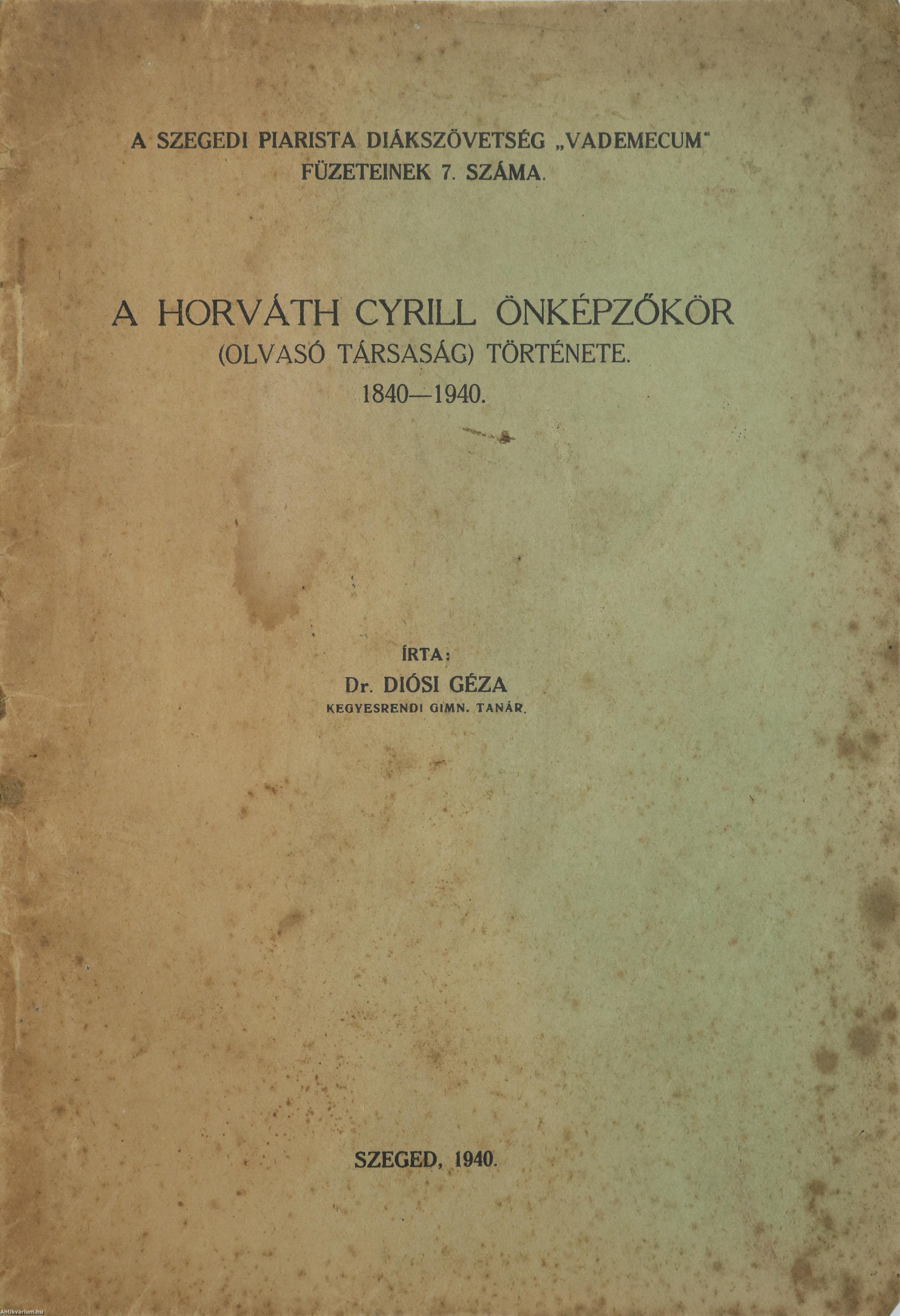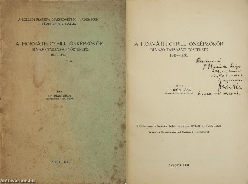 Szerző által dedikált példány. A Szegedi Piarista Diákszövetség "Vademecum" füzeteinek 7. száma. A Horváth Cyrill önképzőkör (Olvasó társaság) története. 1840-1940. Írta: Dr. Diósi Géza kegyesrendi gimn. tanár. A címlapon a szerző, Diósi Géza tollal beírt, névre szóló dedikációja olvasható: "Főtisztelendő Dr. H. L. hittanár úrnak mély tisztelettel és szeretettel Diósi Géza Szeged, 1941. VII. 20.-án." Különlenyomat a Dugonics András gimnázium 1939-40. évi Évkönyvéből. Nyomtatta Juhász István Könyvnyomdája Szegeden. Kiadói tűzött papírkötésben lévő példány feliratozott címfedéllel, feliratozatlan könyvgerinccel és hátlappal, hiánytalan állapotban. A szerző, Diósi Géza (Devecser, 1895. január 6. – Budapest, 1963. május 11.) irodalomtörténész, piarista szerzetes. 1919-től a piarista rend nagykanizsai, 1923-tól szegedi, 1941-től kolozsvári, 1943-tól pedig kecskeméti gimnáziumában tanított. 1947-ben kinevezték a rendi növendékek elöljárójának Budapesten, majd 1950-től különböző templomokban mint lelkipásztor működött. Ezenkívül a nagykanizsai Zrínyi Miklós Irodalmi Társaságnak és a szegedi Dugonics Társaságnak a titkári tisztségét is betöltötte. Irodalomtörténeti tanulmányait számos korabeli periodika közölte.