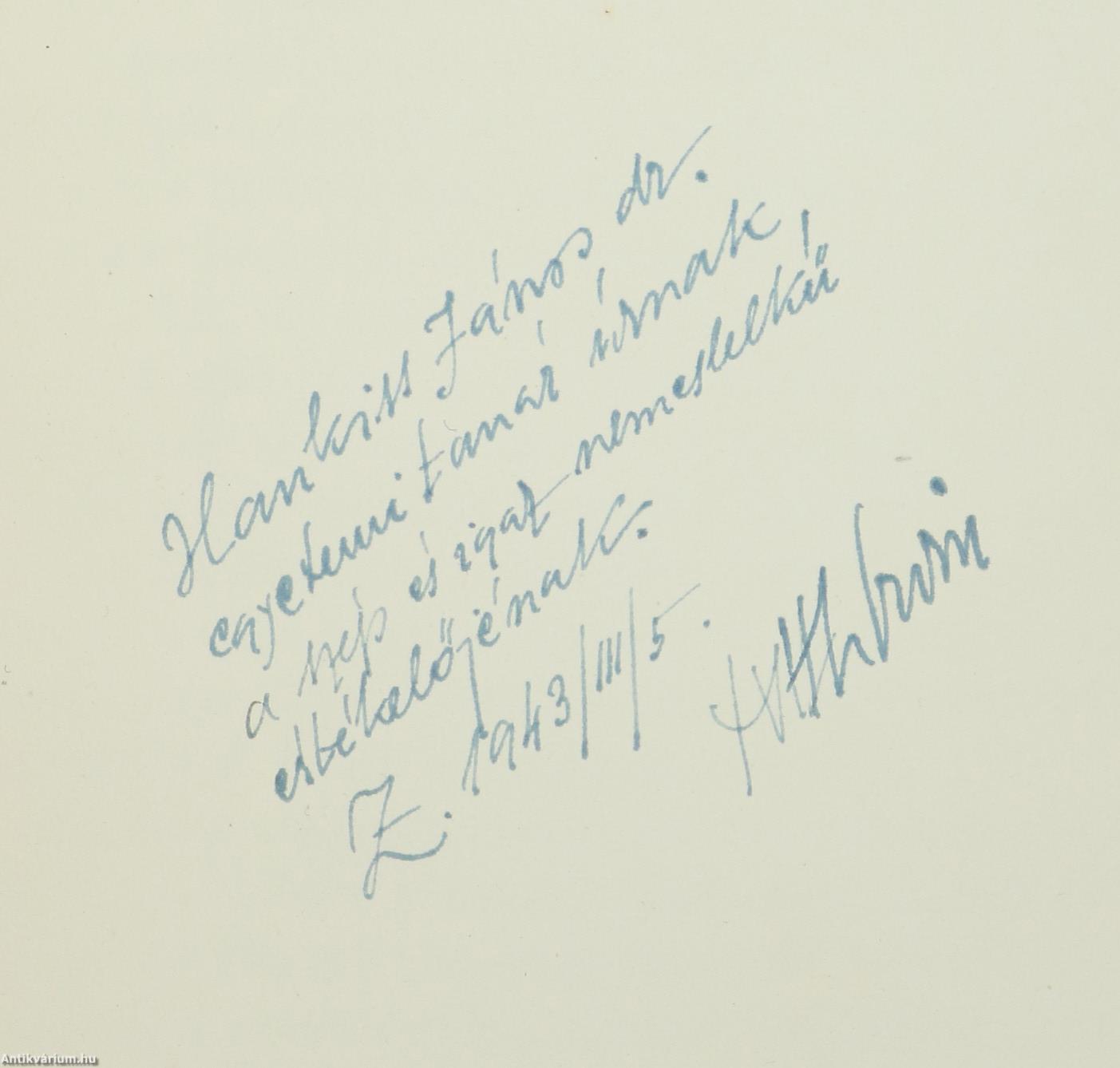 A számozás alatt a szerző, Tóth Ervin tollal beírt aláírása, a címlapon ugyanő tollal beírt, névre szóló dedikációja olvasható: "Hankiss János dr. egyetemi tanár úrnak, a szép és igaz nemeslelkű értékelőjének. Z. 1943/III/5. Tóth Ervin"