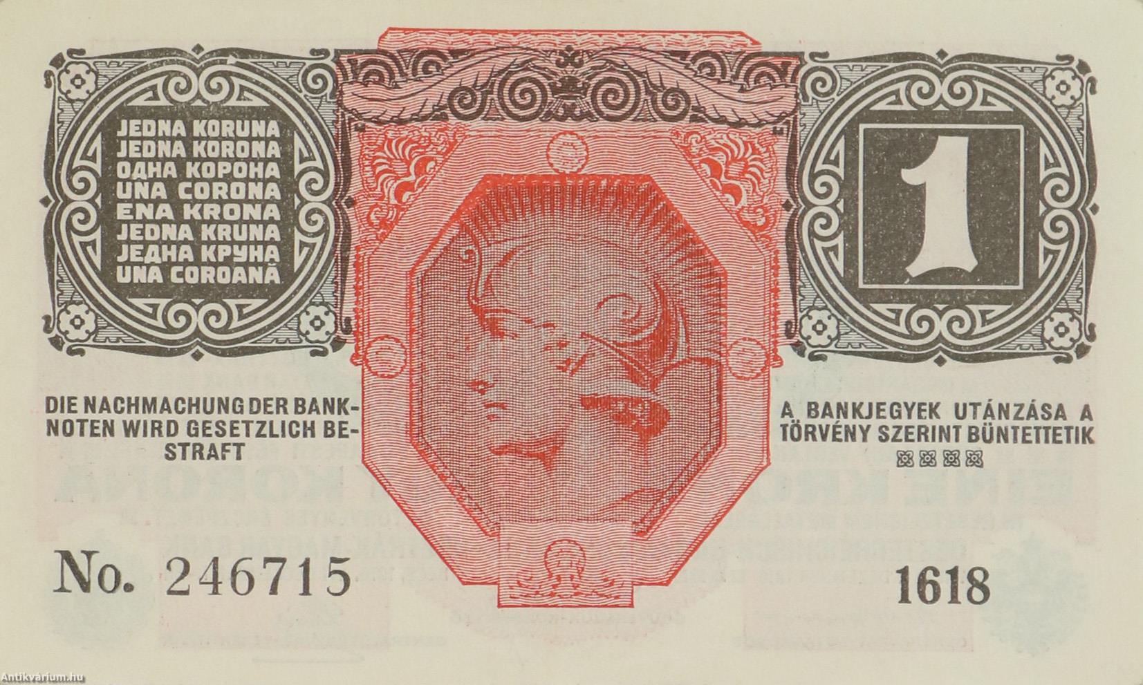 - 1 korona névértékű forgalmi bankjegy. Kibocsátotta: Osztrák-Magyar Bank. Kibocsátás ideje: Bécs, 1916. évi deczember 1-én. Mérete: 113 mm x 67 mm.