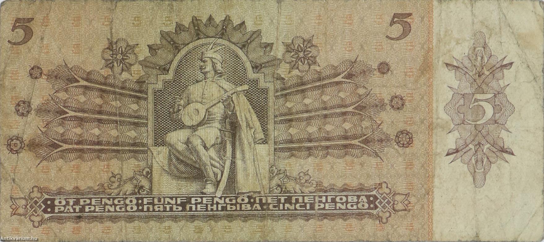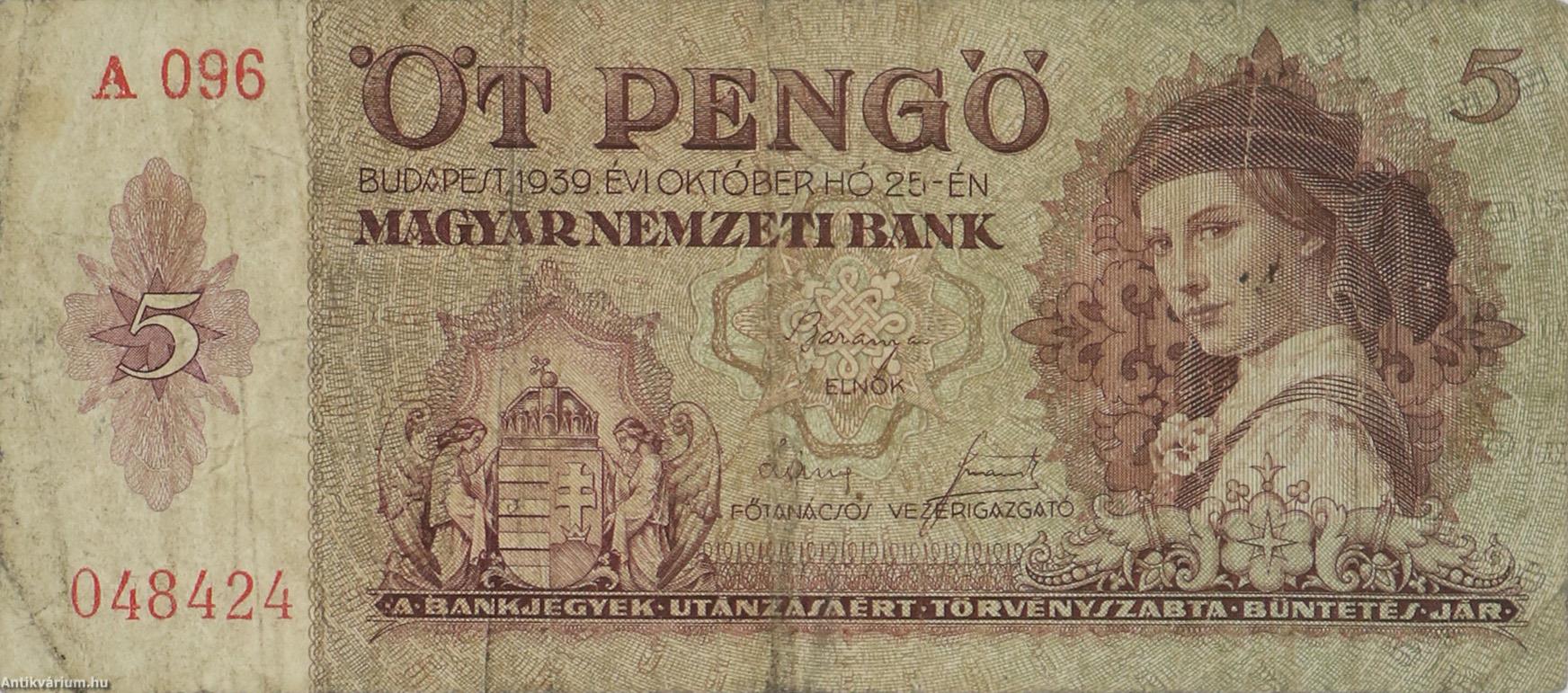 - 5 pengő névértékű forgalmi bankjegy. Kibocsátotta: Magyar Nemzeti Bank. Kibocsátás ideje: Budapest, 1939. évi október hó 25-én. Tervezte: Horváth Endre. Mérete: 120 mm x 53 mm.