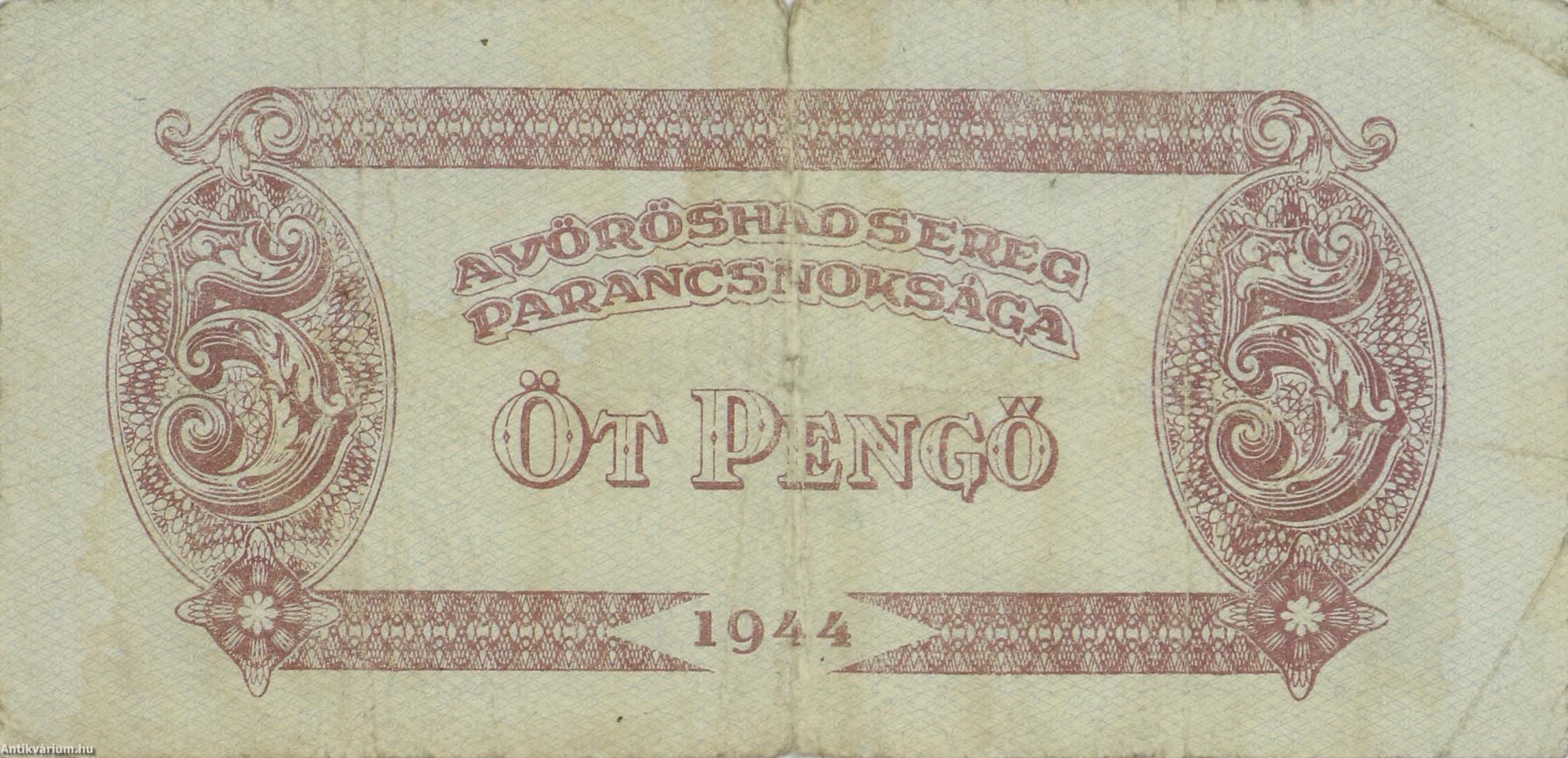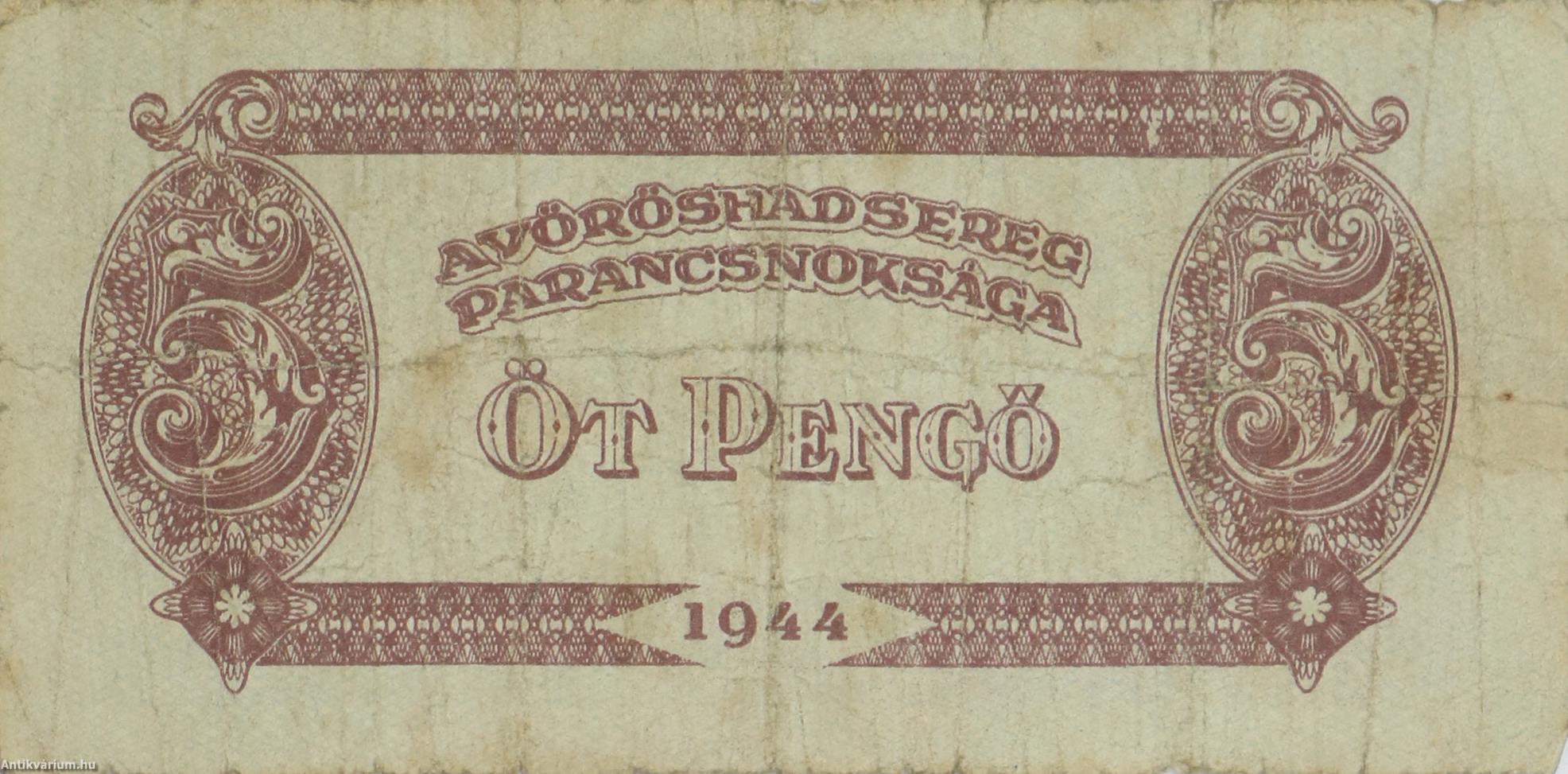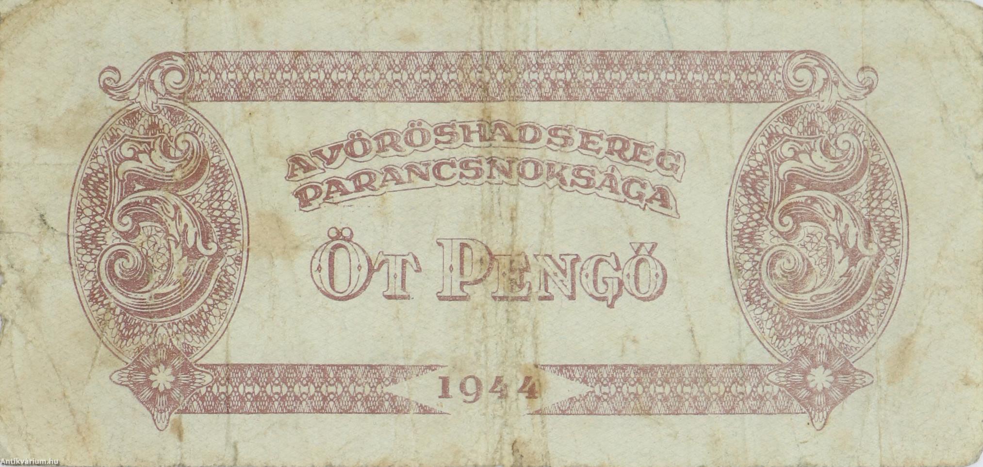- 5 pengő névértékű forgalmi bankjegy. - 3 példányban. Kibocsátotta: Vöröshadereg Parancsnoksága. Kibocsátás ideje: 1944. Mérete: 137 mm x 66 mm.