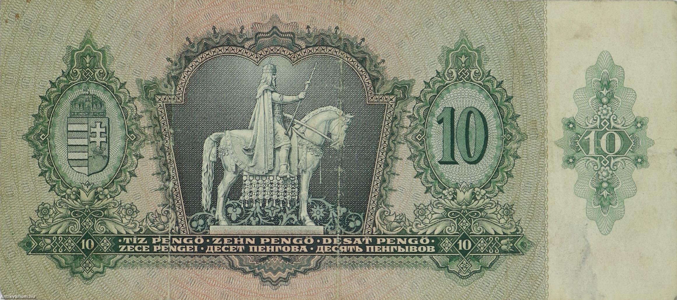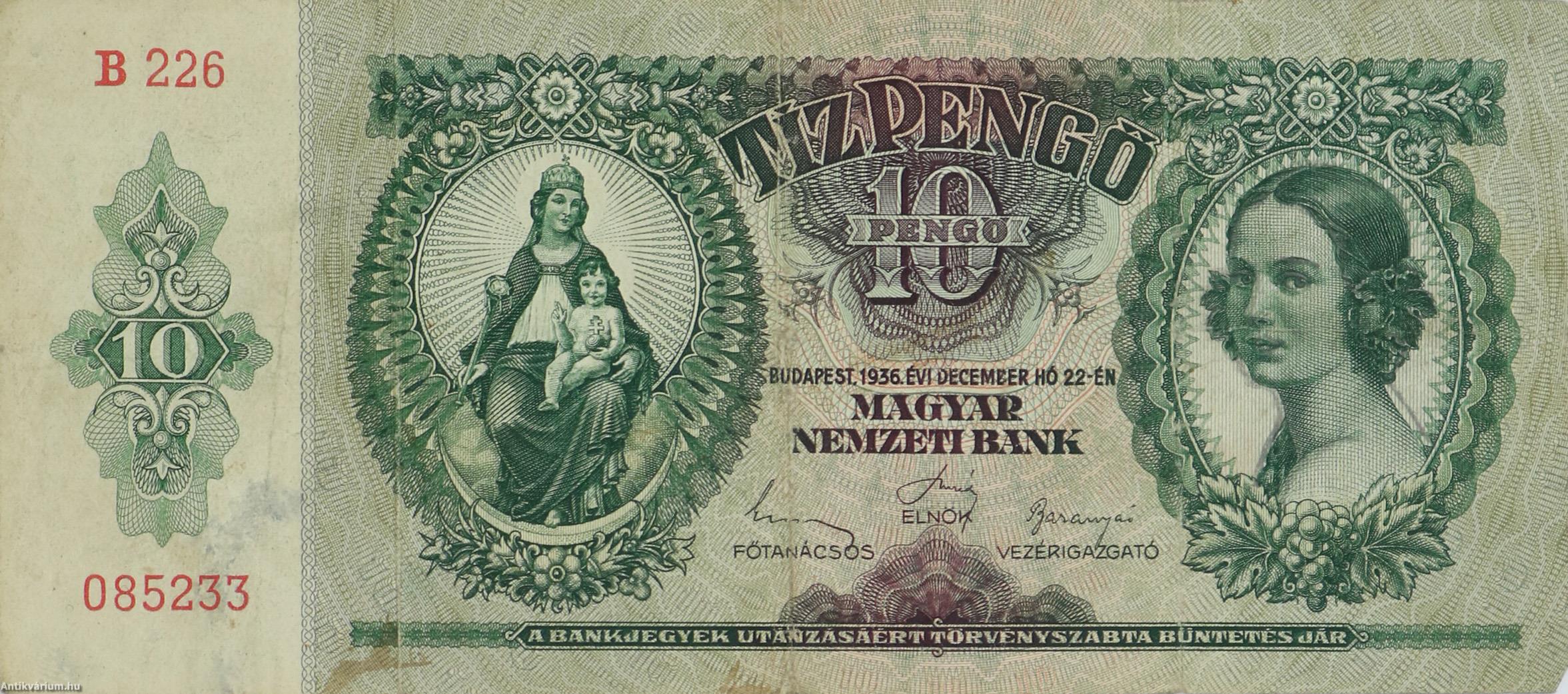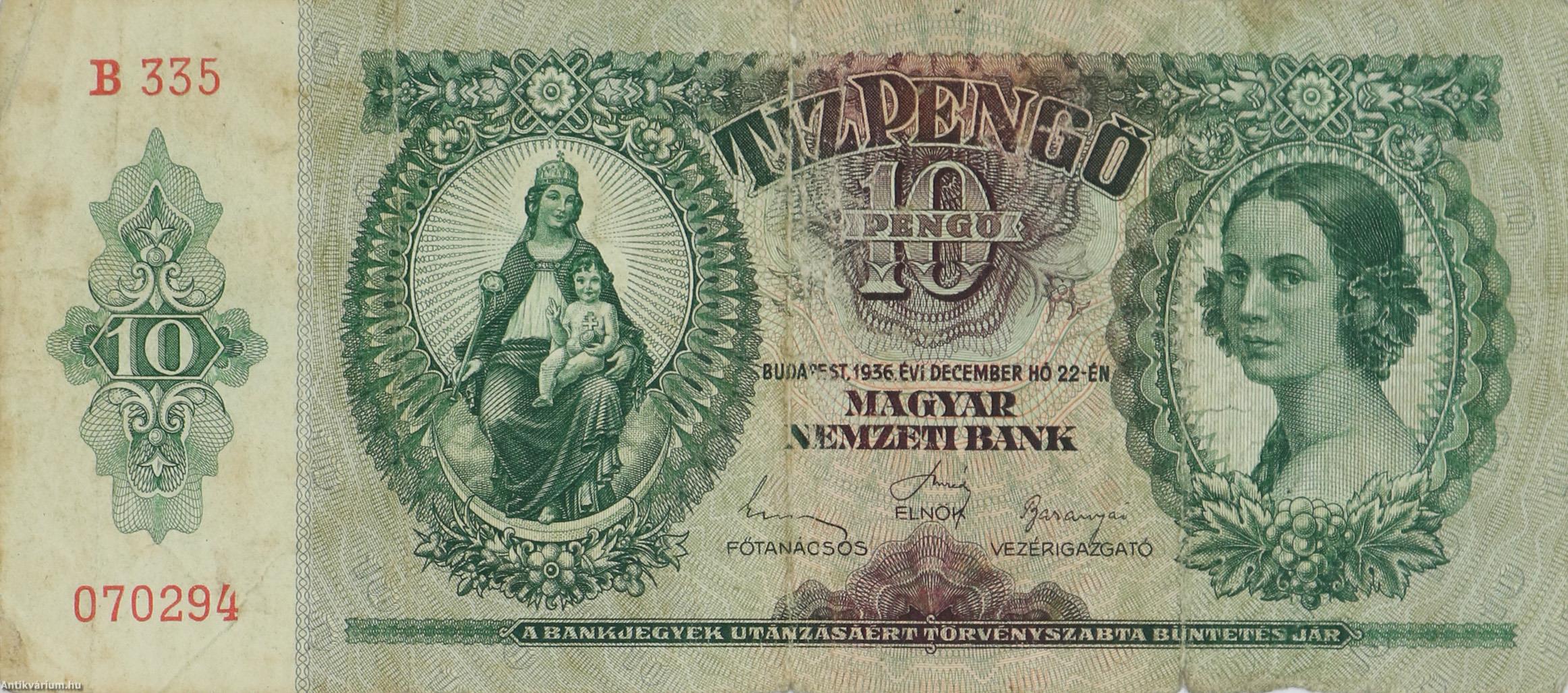 - 10 pengő névértékű forgalmi bankjegy. - 2 példányban. Kibocsátotta: Magyar Nemzeti Bank. Kibocsátás ideje: Budapest, 1936. évi december hó 22-én. Tervezte: Horváth Endre. Mérete: 160 mm x 71 mm.