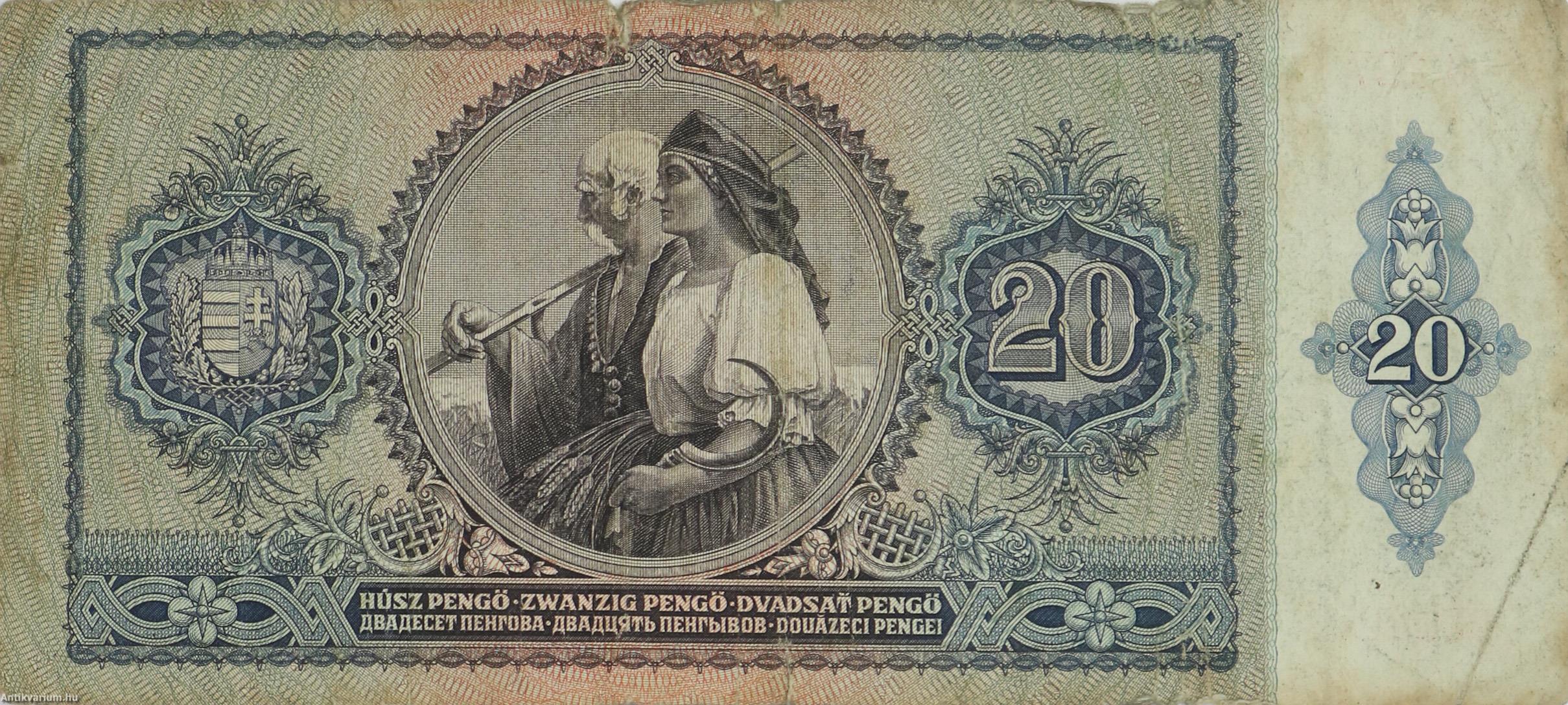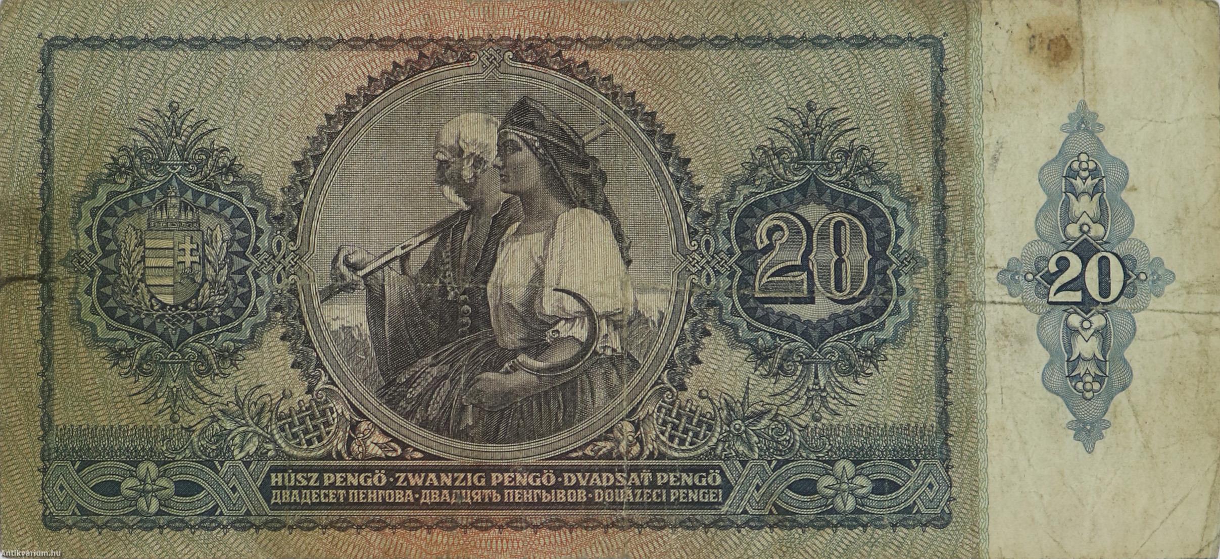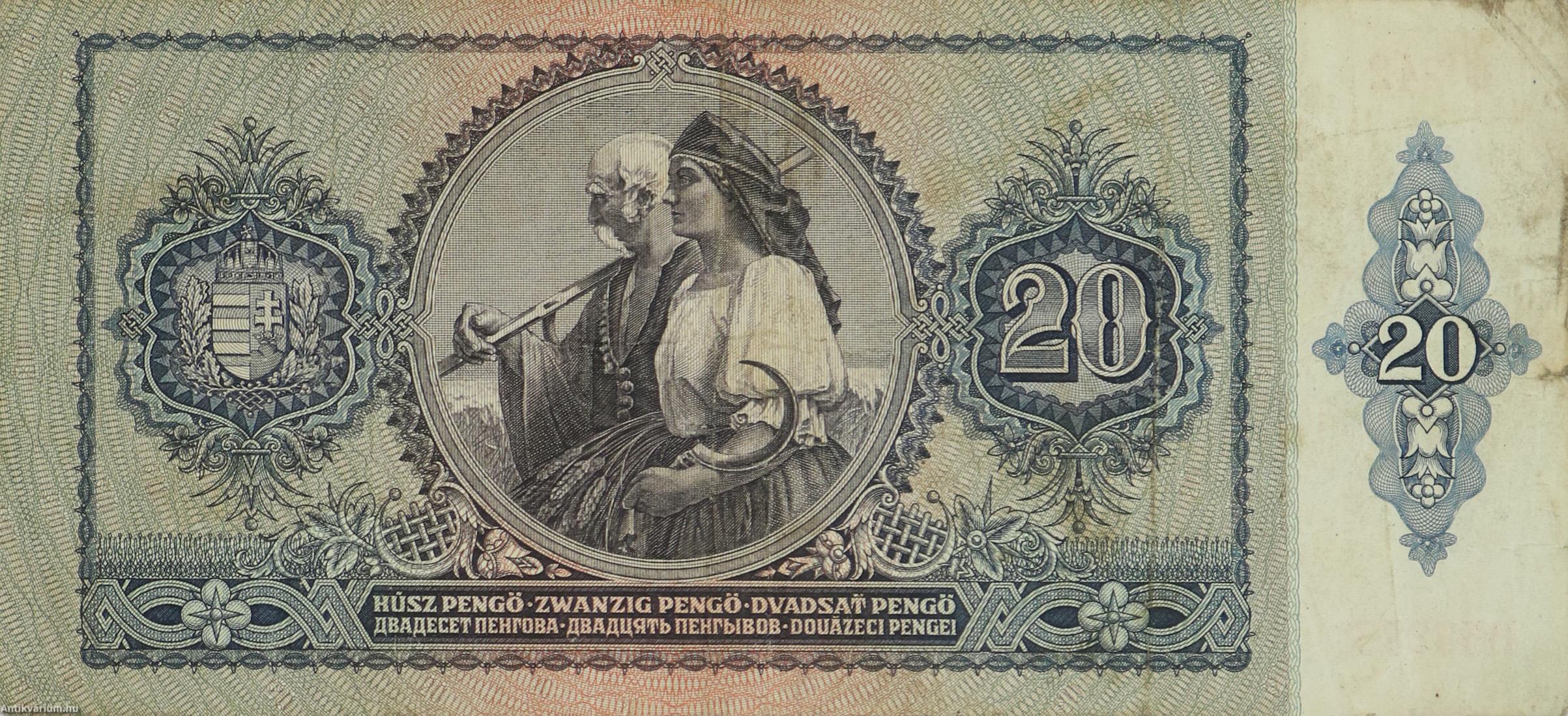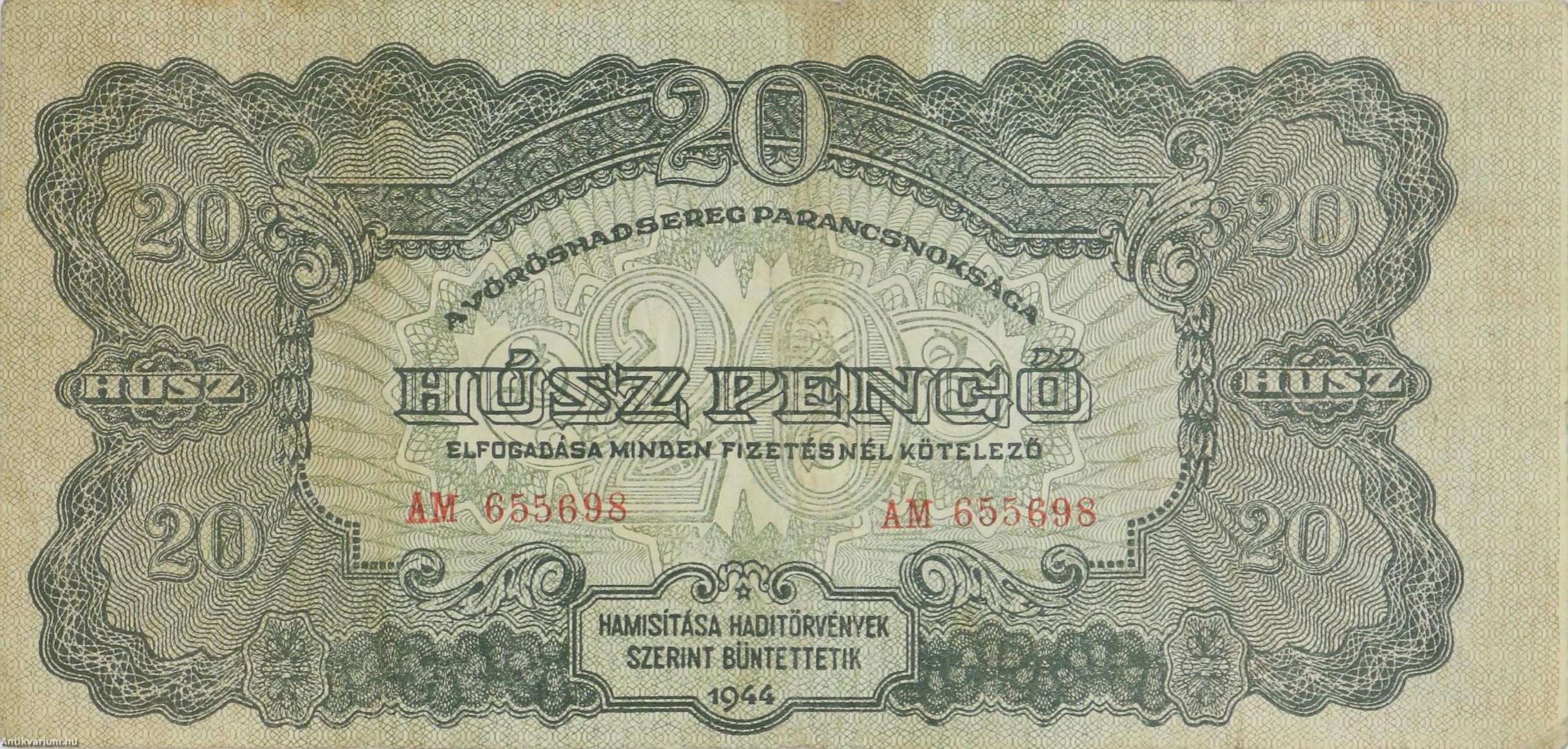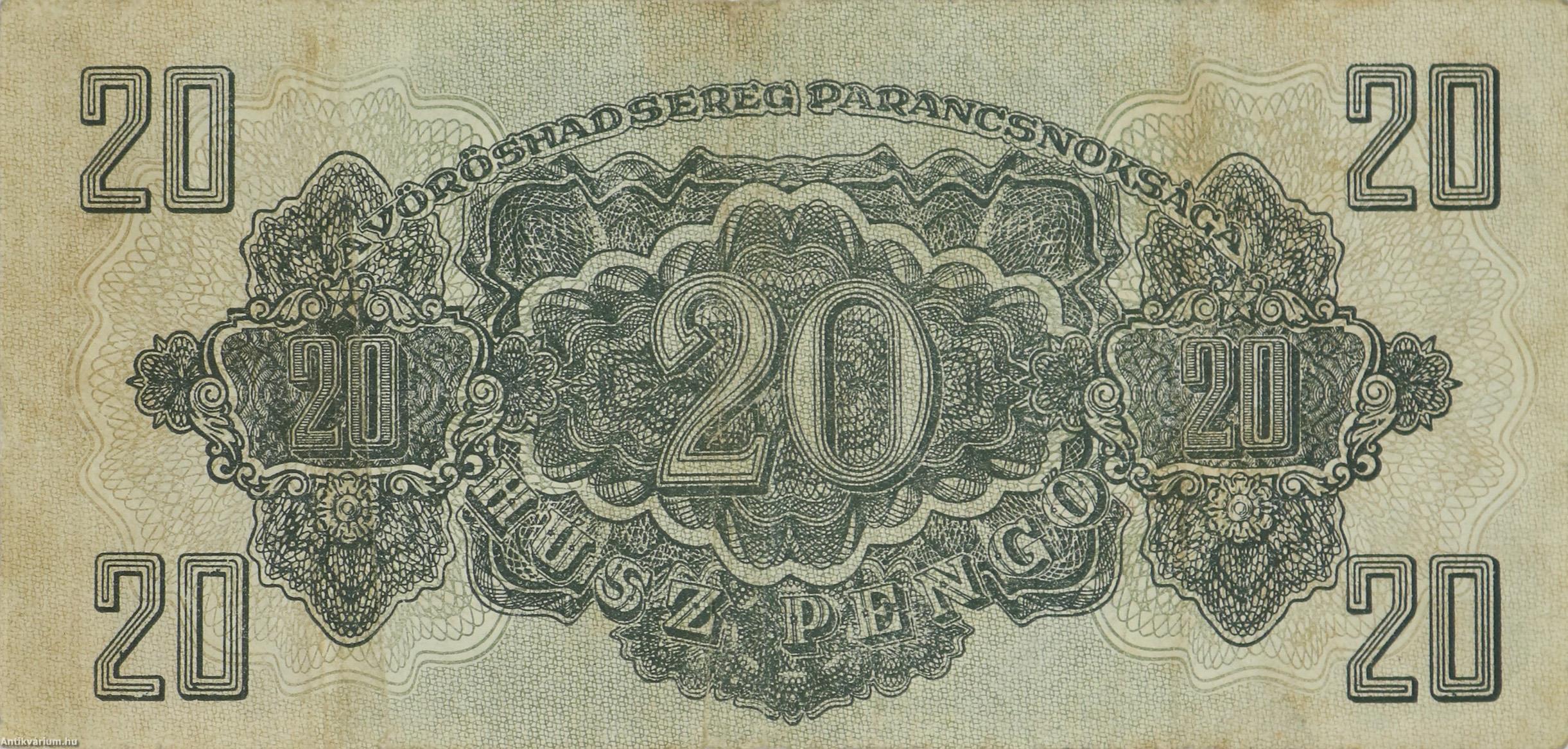 - 20 pengő névértékű forgalmi bankjegy. Kibocsátotta: Vöröshadereg Parancsnoksága. Kibocsátás ideje: 1944. Mérete: 167 mm x 86 mm.