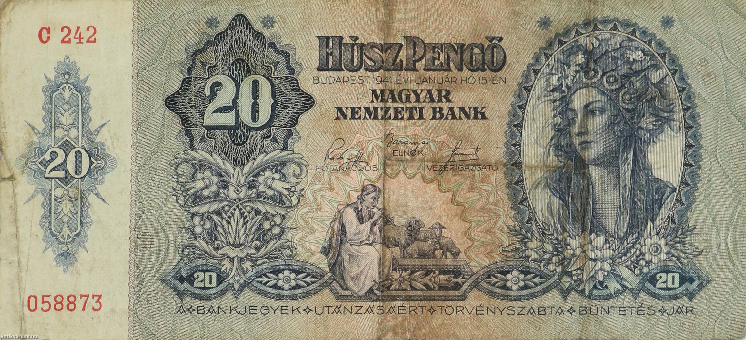 - 20 pengő névértékű forgalmi bankjegy. - 3 példányban. Kibocsátotta: Magyar Nemzeti Bank. Kibocsátás ideje: Budapest, 1941. évi január hó 15-én. Tervezte: Horváth Endre. Mérete: 165 mm x 76 mm.