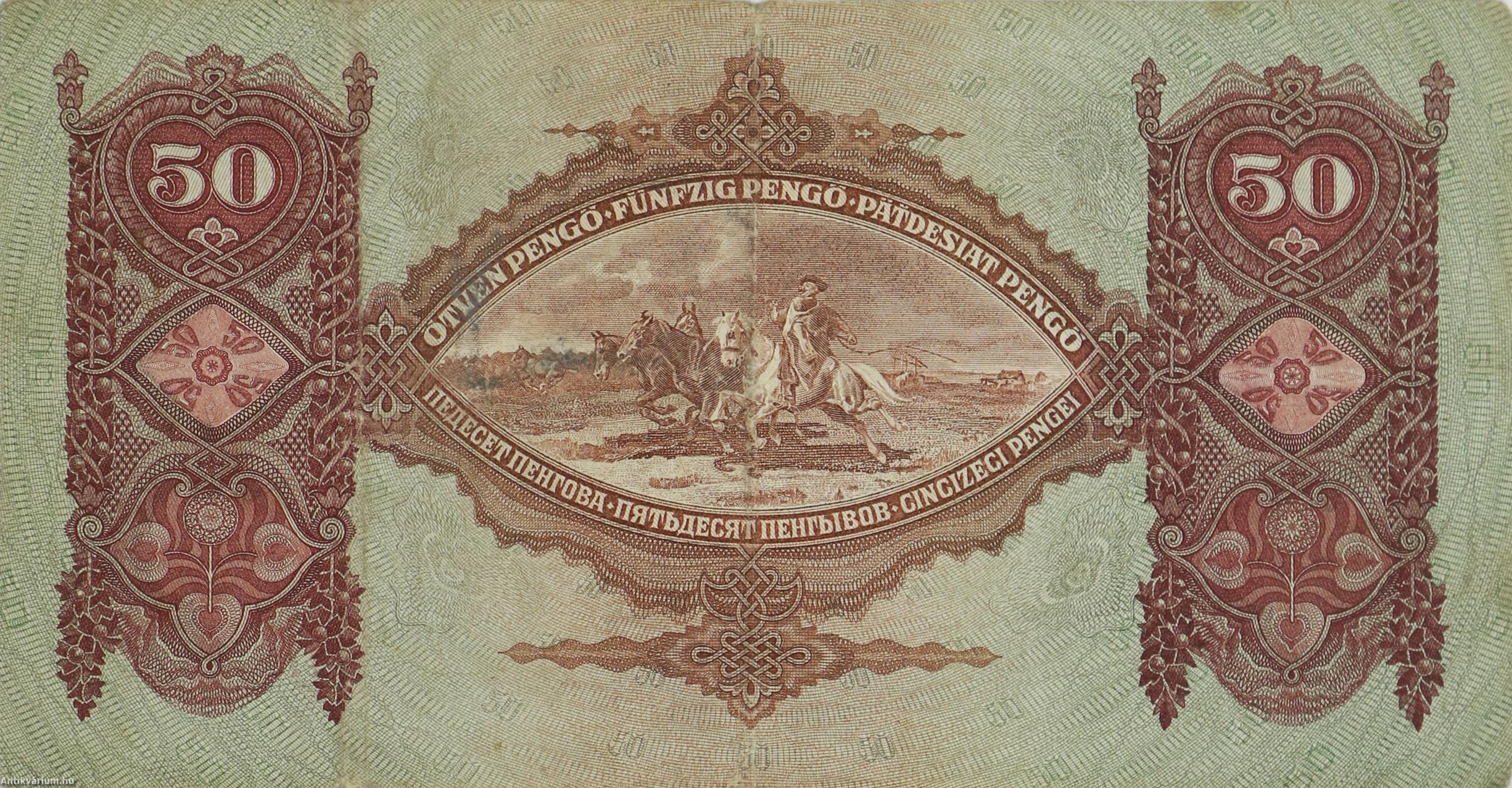 - 50 pengő névértékű forgalmi bankjegy. Kibocsátotta: Magyar Nemzeti Bank. Kibocsátás ideje: Budapest, 1932. évi október hó 1-én. Tervezte: Jaschik Ákos. Mérete: 168 mm x 87 mm.