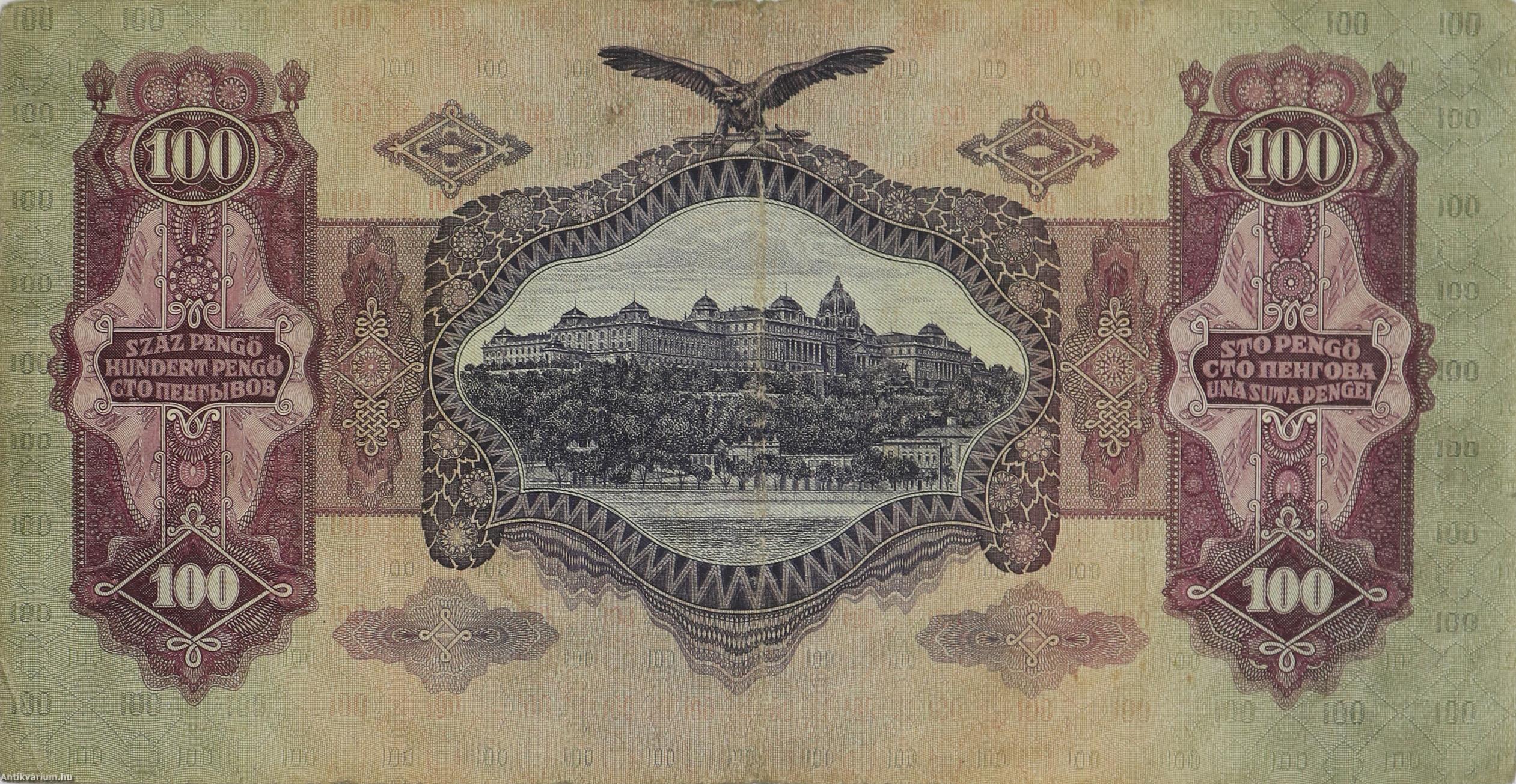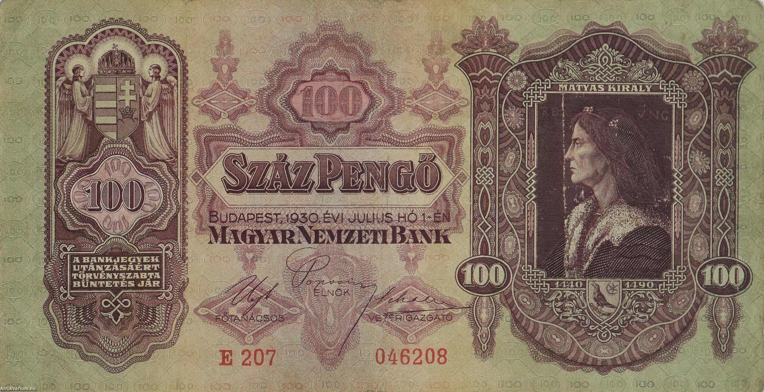 - 100 pengő névértékű forgalmi bankjegy. Kibocsátotta: Magyar Nemzeti Bank. Kibocsátás ideje: Budapest, 1930. évi július hó 1-én. Tervezte: Jaschik Álmos. Mérete: 177 mm x 91 mm.