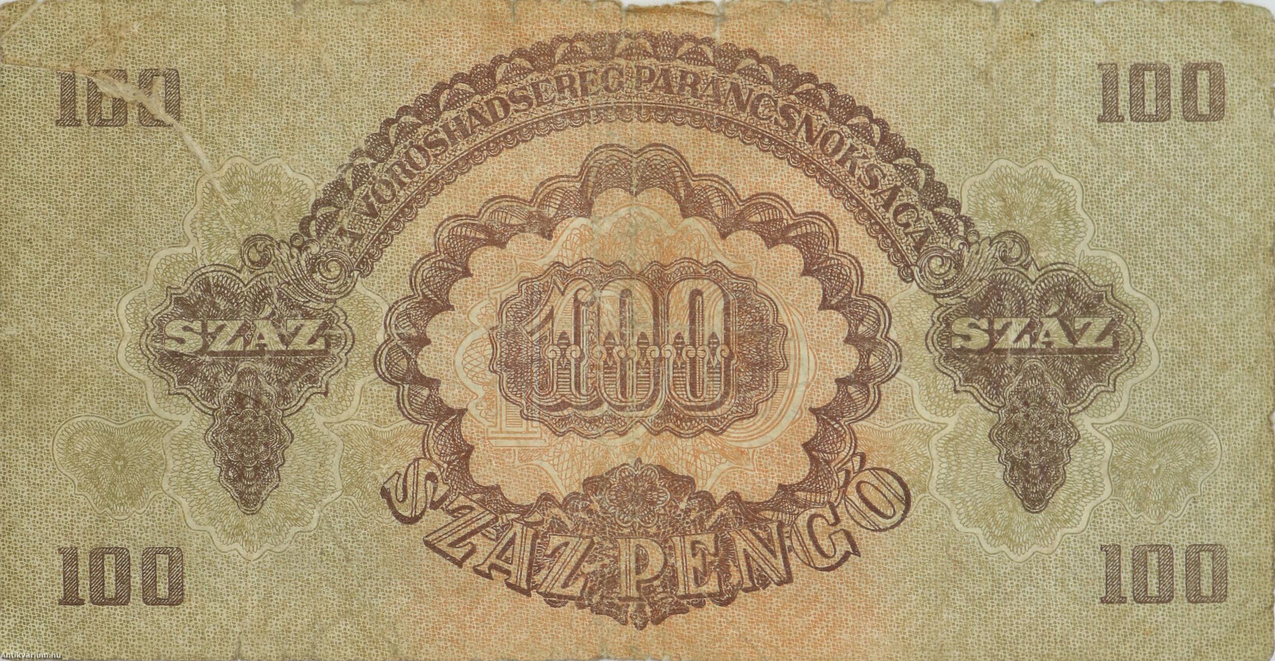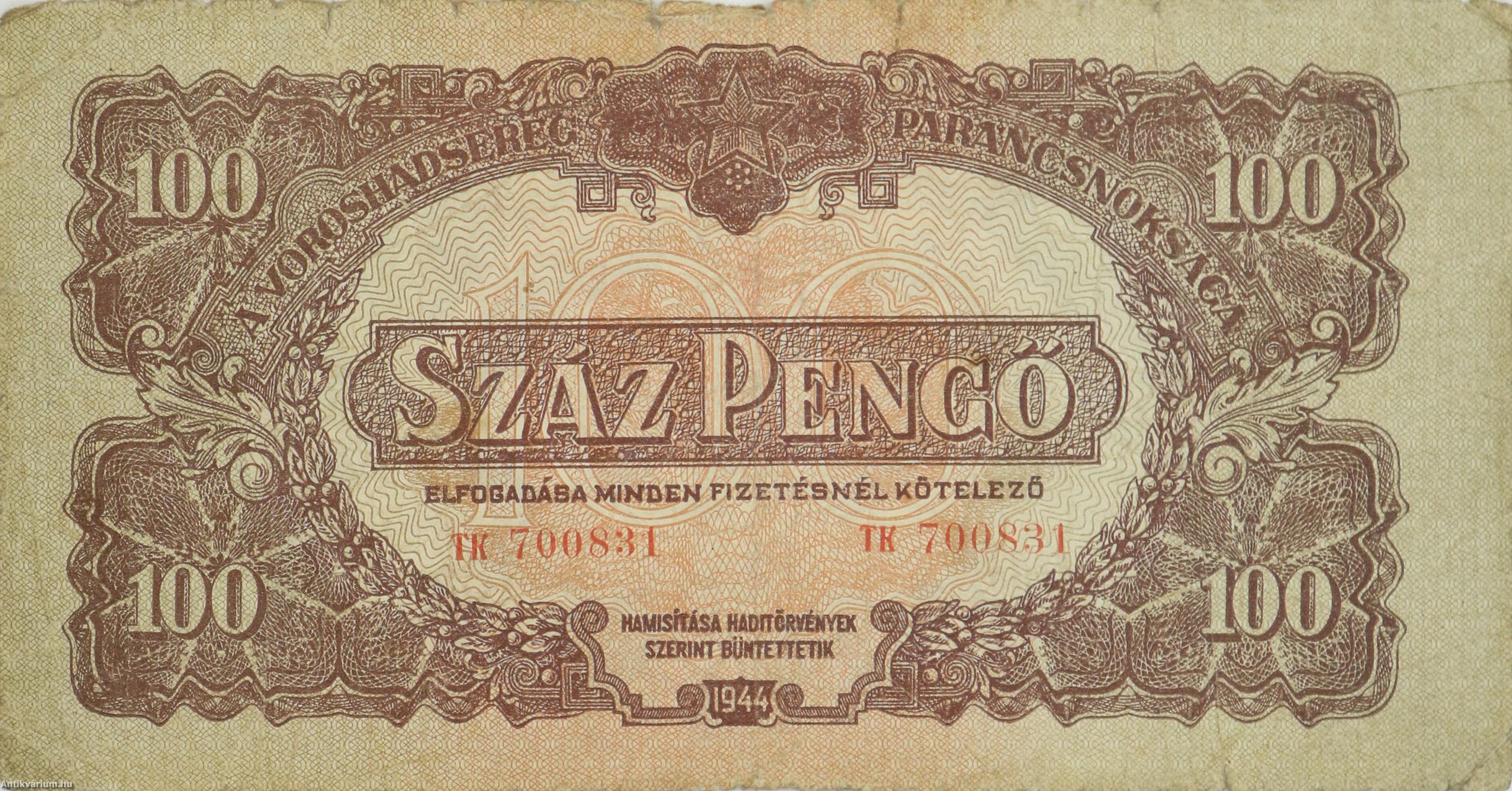 - 100 pengő névértékű forgalmi bankjegy. Kibocsátotta: Vöröshadereg Parancsnoksága. Kibocsátás ideje: 1944. Mérete: 187 mm x 99 mm.