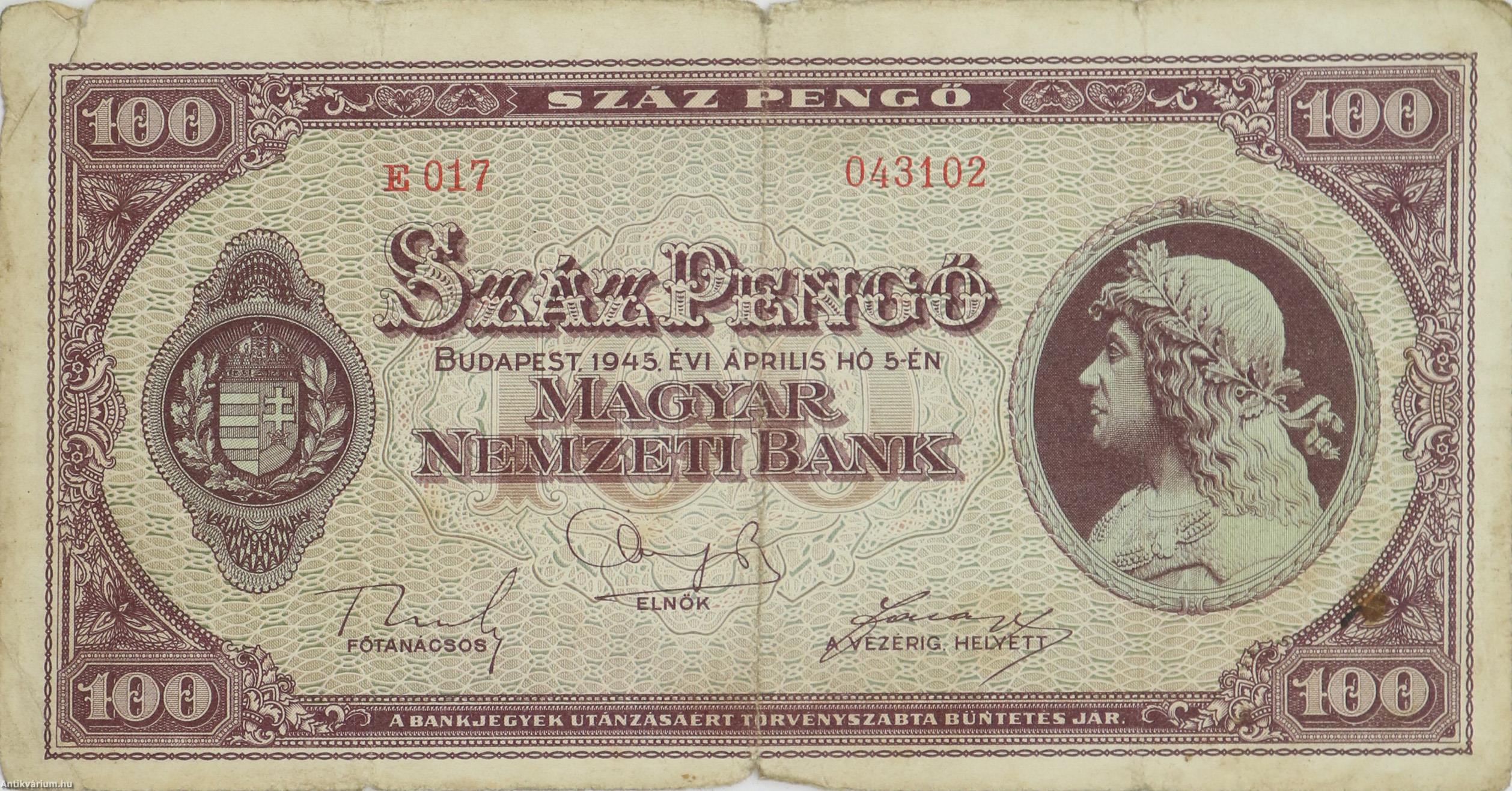 - 100 pengő névértékű forgalmi bankjegy. Kibocsátotta: Magyar Nemzeti Bank. Kibocsátás ideje: Budapest, 1945. évi április hó 5-én. Tervezte: Helbing Ferenc. Mérete: 183 mm x 97 mm.