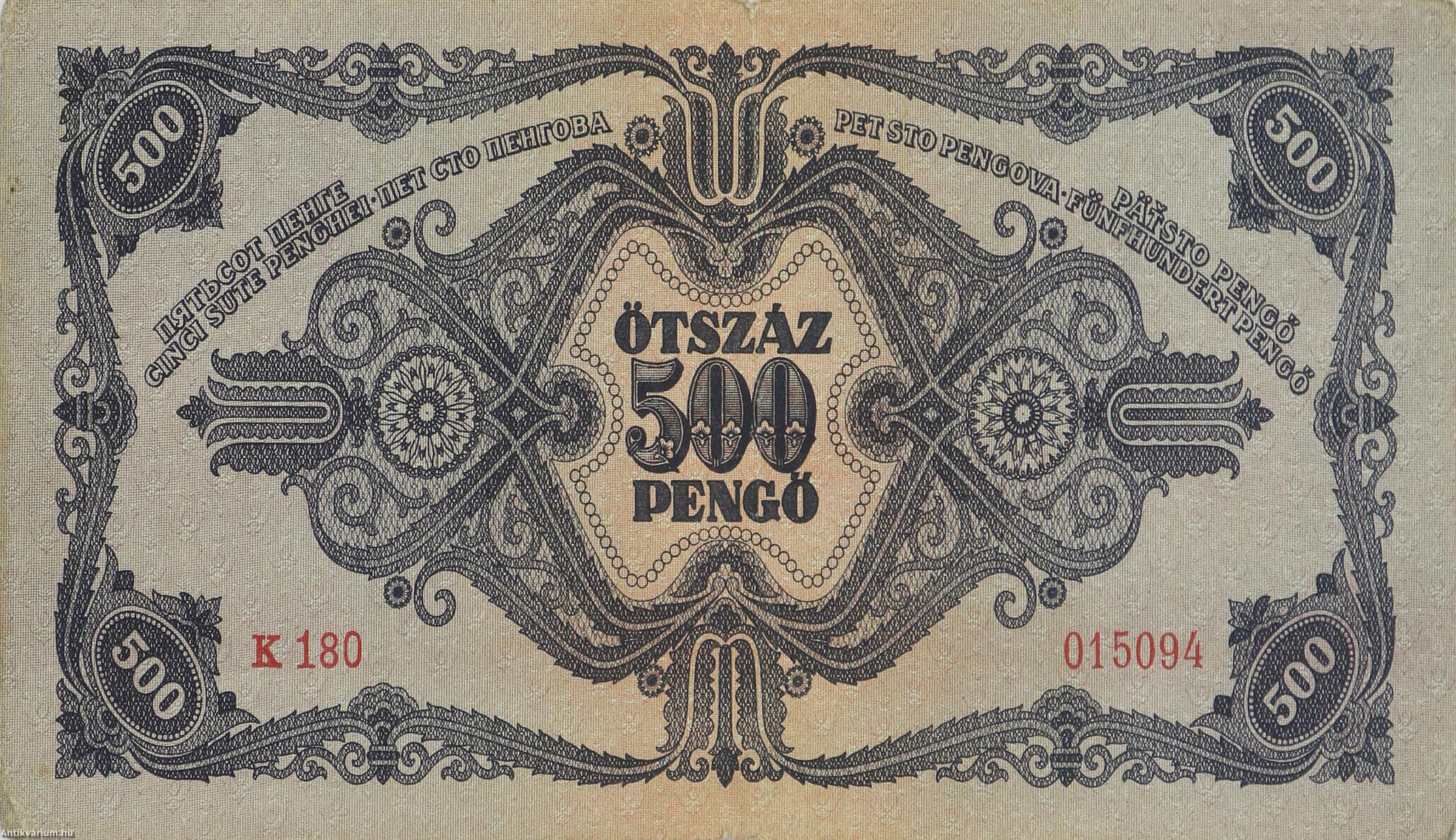 - 500 pengő névértékű forgalmi bankjegy. - 2 példányban. Kibocsátotta: Magyar Nemzeti Bank. Kibocsátás ideje: Budapest, 1945. évi május hó 15-én. Tervezte: Helbing Ferenc. Mérete: 177 mm x 86 mm.