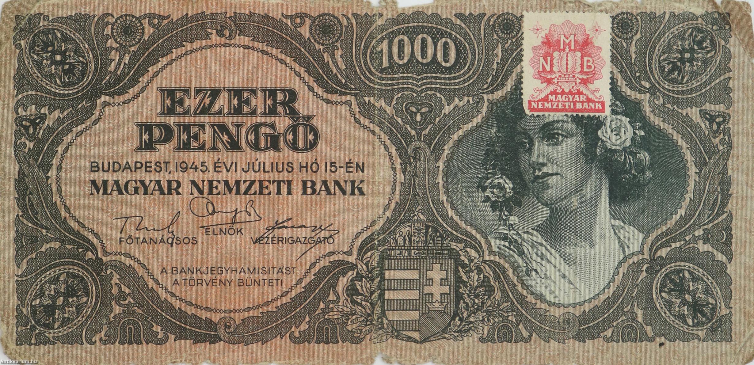 - 1000 pengő névértékű, Vagyondézsma bélyeggel ellátott forgalmi bankjegy. Kibocsátotta: Magyar Nemzeti Bank. Kibocsátás ideje: Budapest, 1945. évi július hó 15-én. Tervezte: Helbing Ferenc. Mérete: 185 mm x 90 mm.