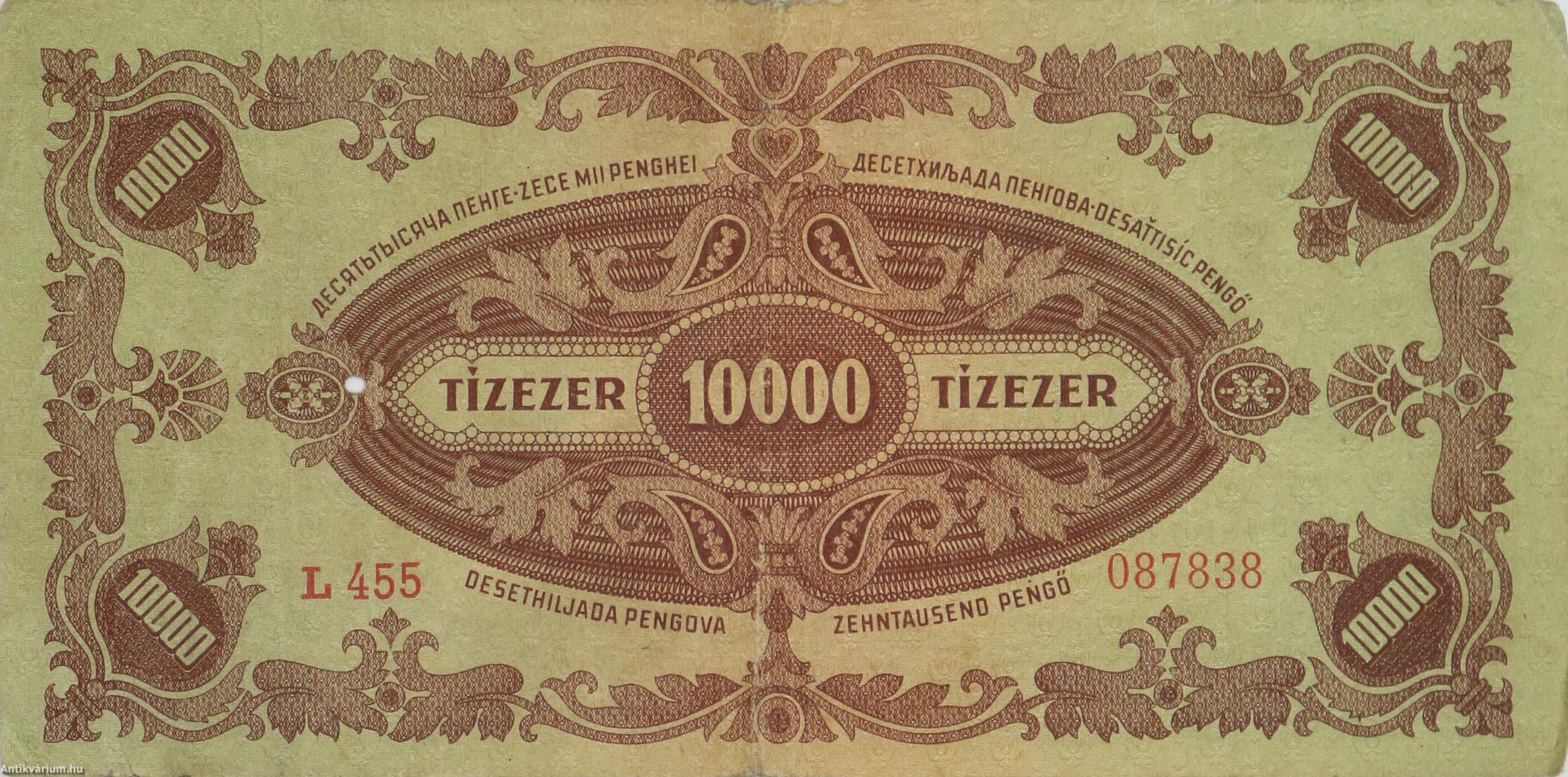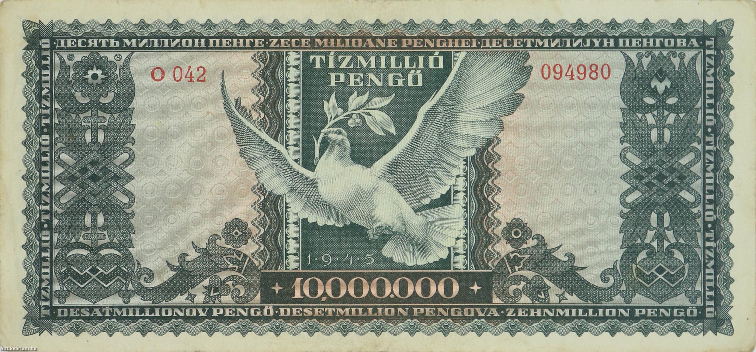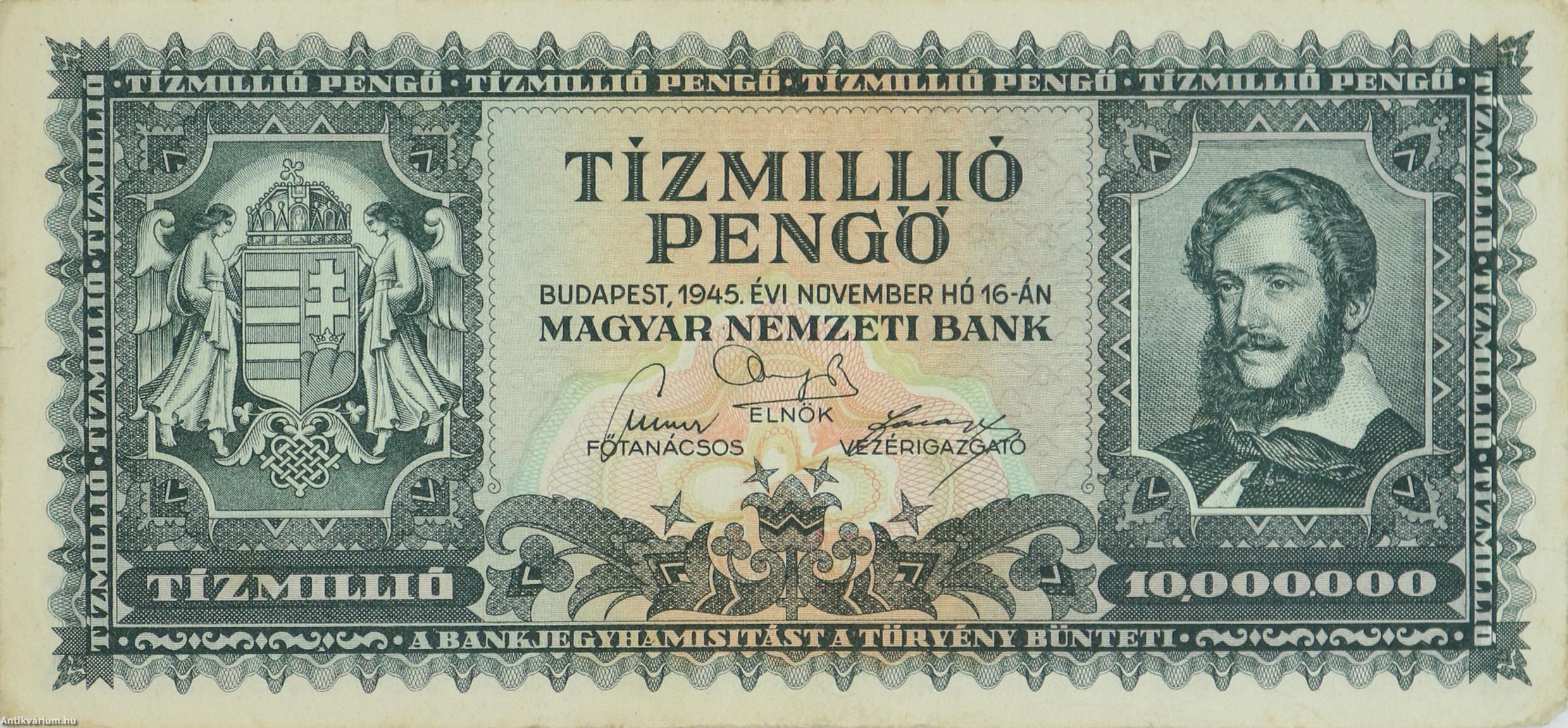 - 10.000.000 pengő névértékű forgalmi bankjegy. Kibocsátotta: Magyar Nemzeti Bank. Kibocsátás ideje: Budapest, 1945. évi november hó 16-án. Tervezte: Horváth Endre. Mérete: 184 mm x 84 mm.
