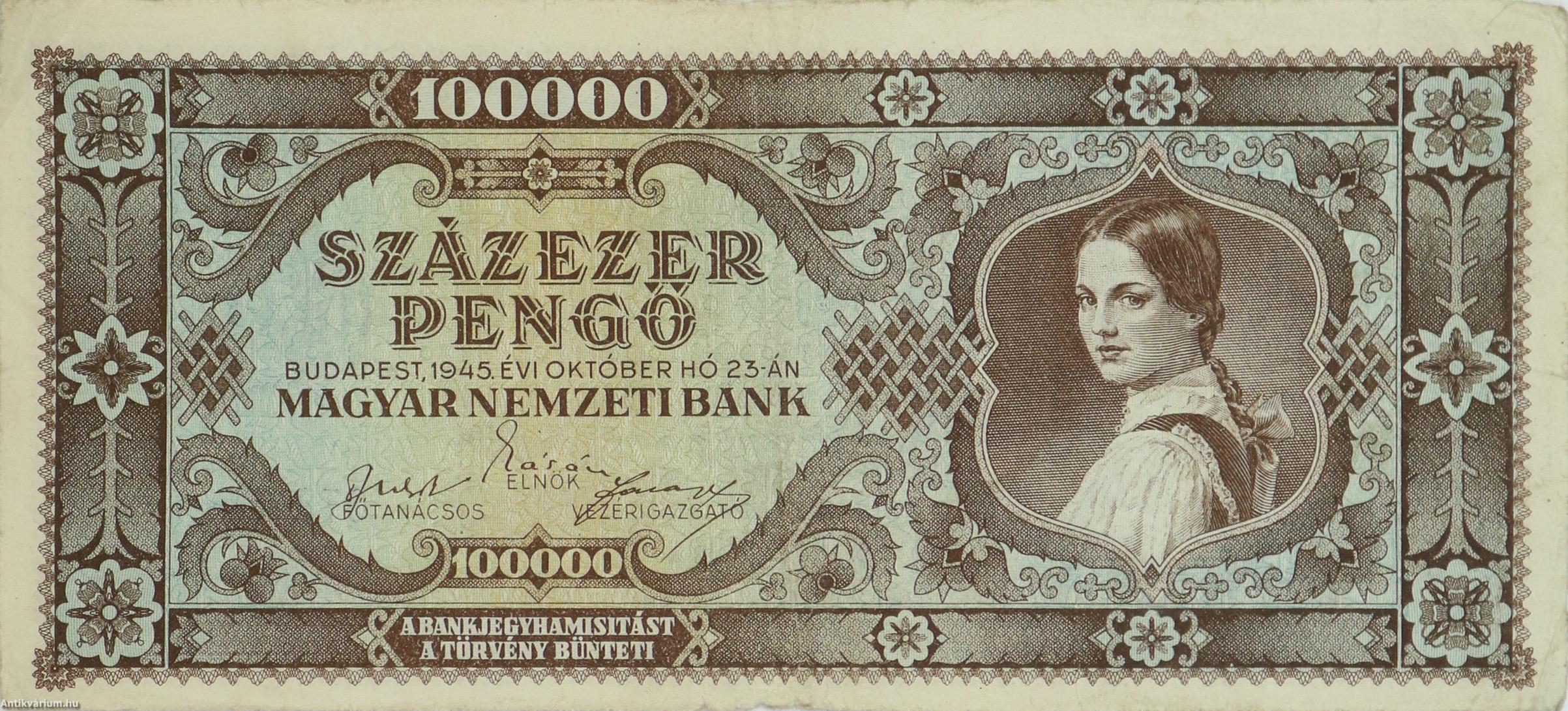 - 100.000 pengő névértékű forgalmi bankjegy. - 2 példányban. Kibocsátotta: Magyar Nemzeti Bank. Kibocsátás ideje: Budapest, 1945. évi október hó 23-án. Mérete: 177 mm x 81 mm.