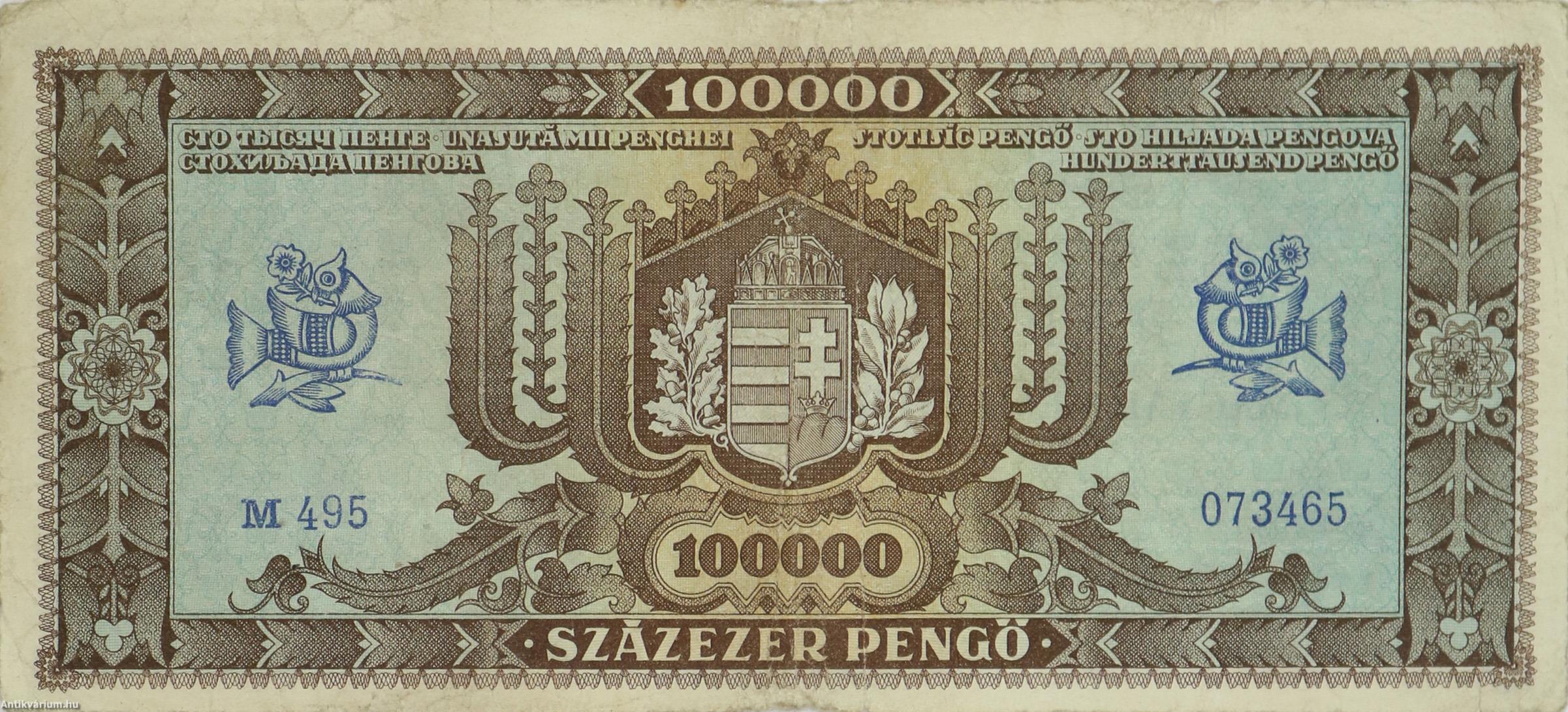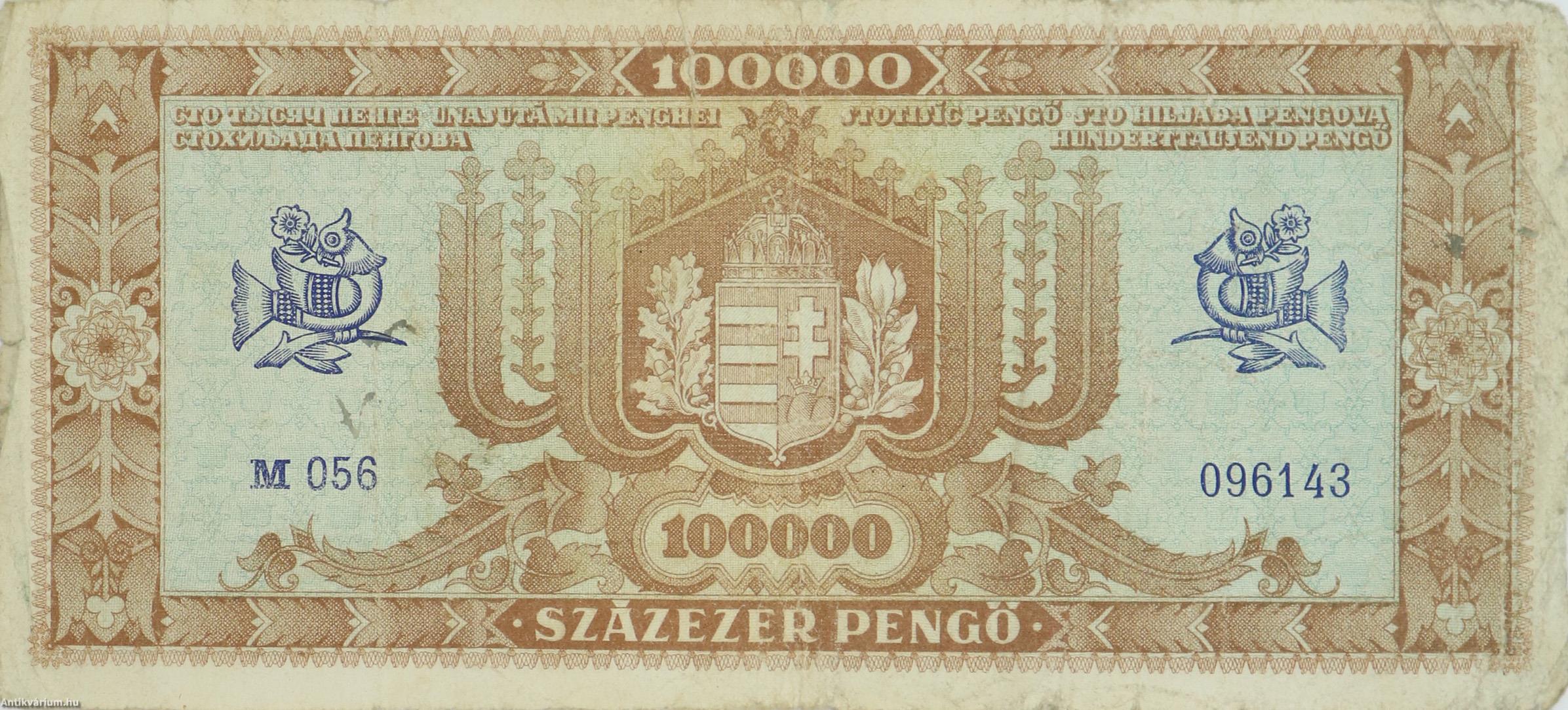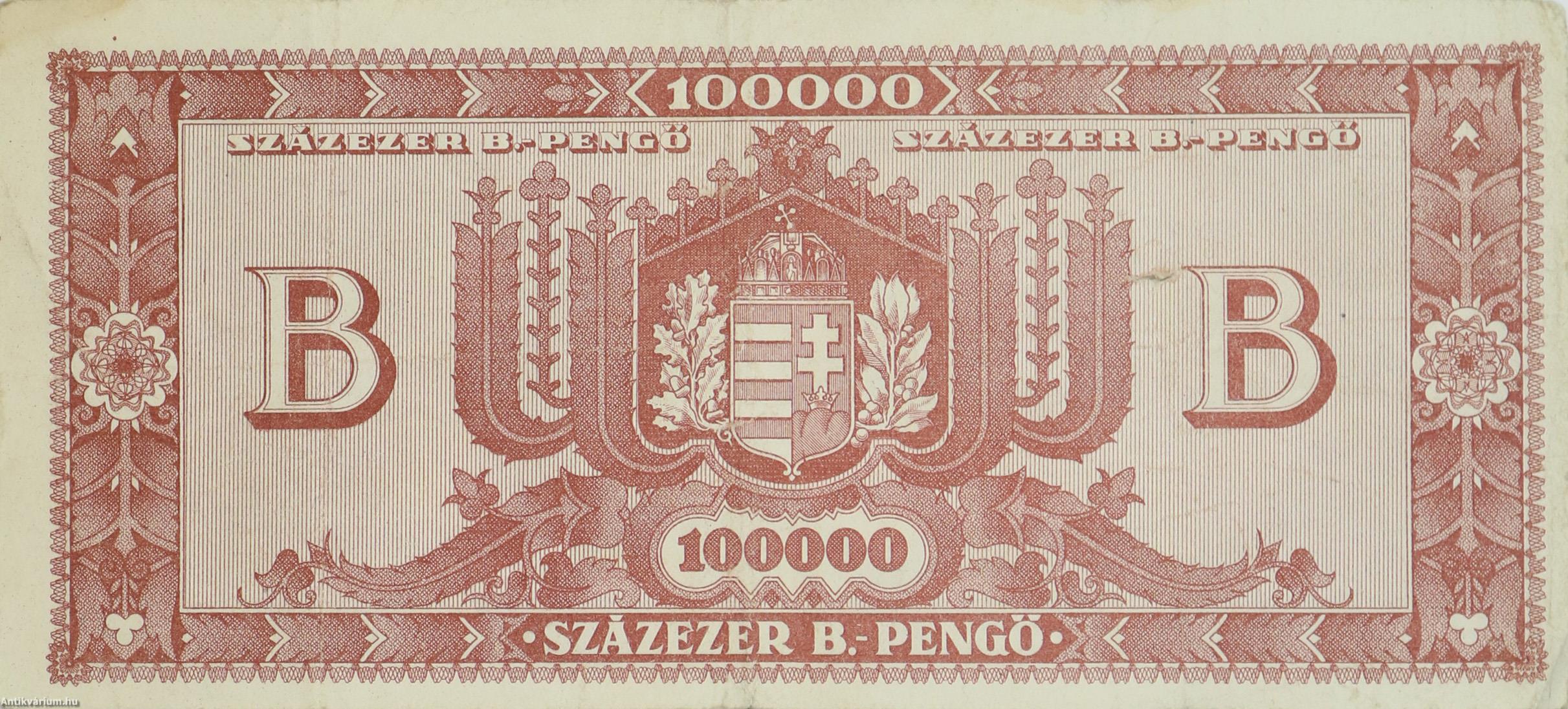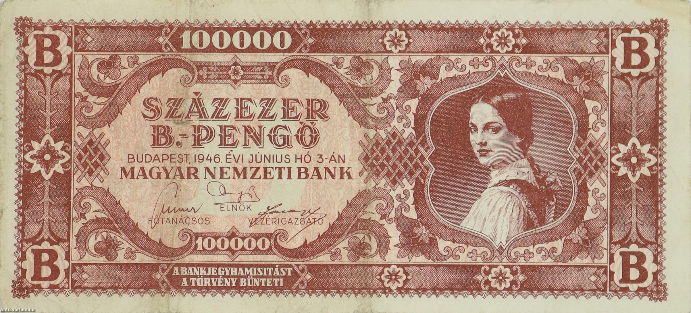 - 100.000 pengő névértékű forgalmi bankjegy. Kibocsátotta: Magyar Nemzeti Bank. Kibocsátás ideje: Budapest, 1946. évi június hó 3-án. Mérete: 177 mm x 81 mm.