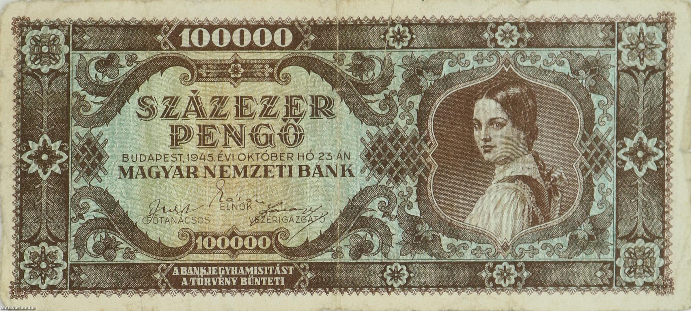- 100.000 pengő névértékű forgalmi bankjegy. Kibocsátotta: Magyar Nemzeti Bank. Kibocsátás ideje: Budapest, 1946. évi április hó 29-én. Mérete: 177 mm x 81 mm.
