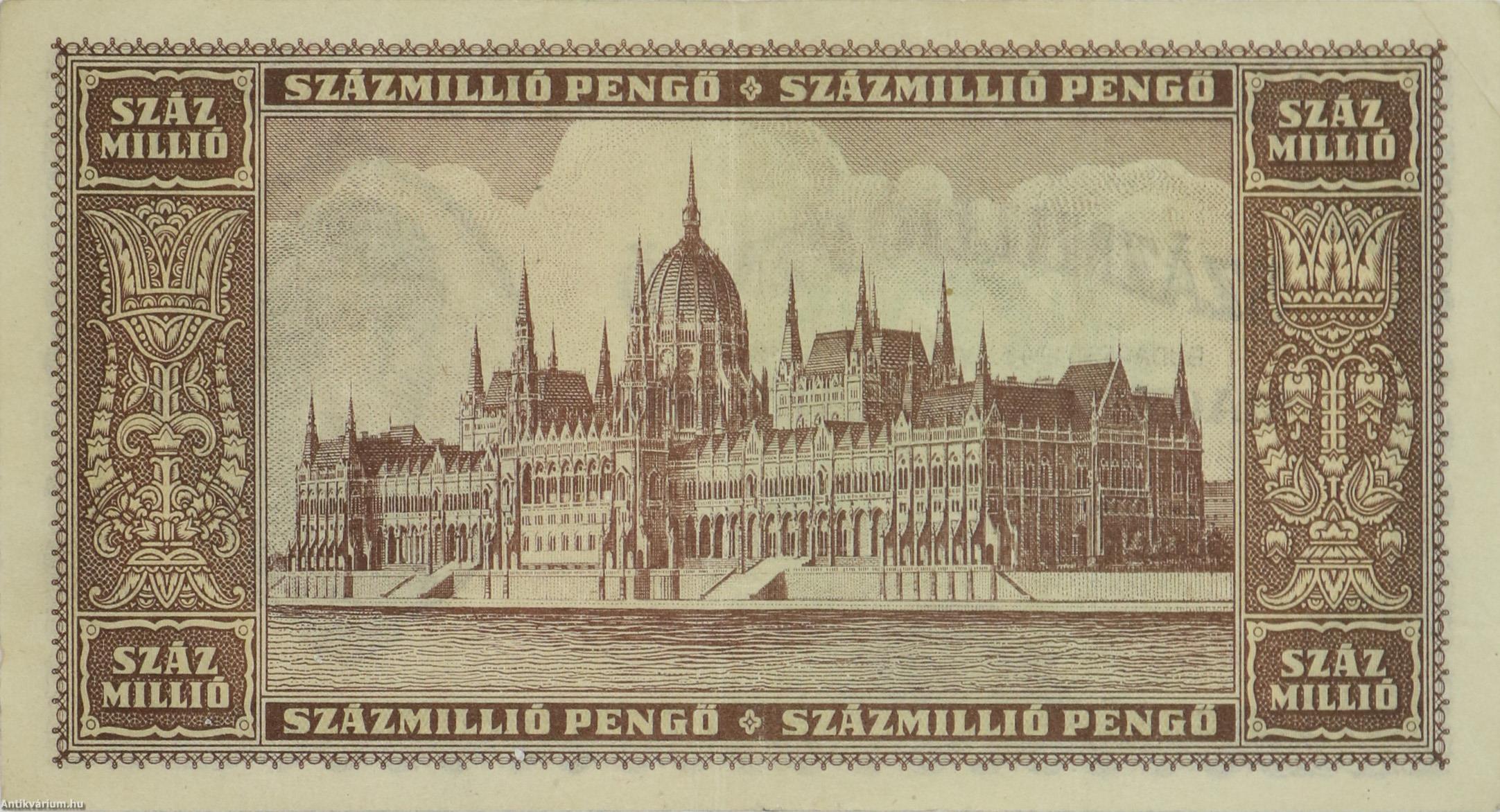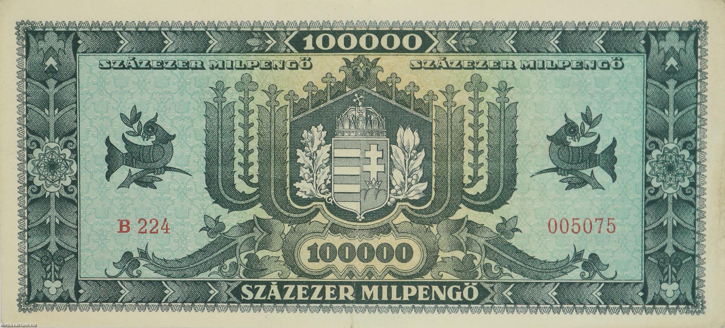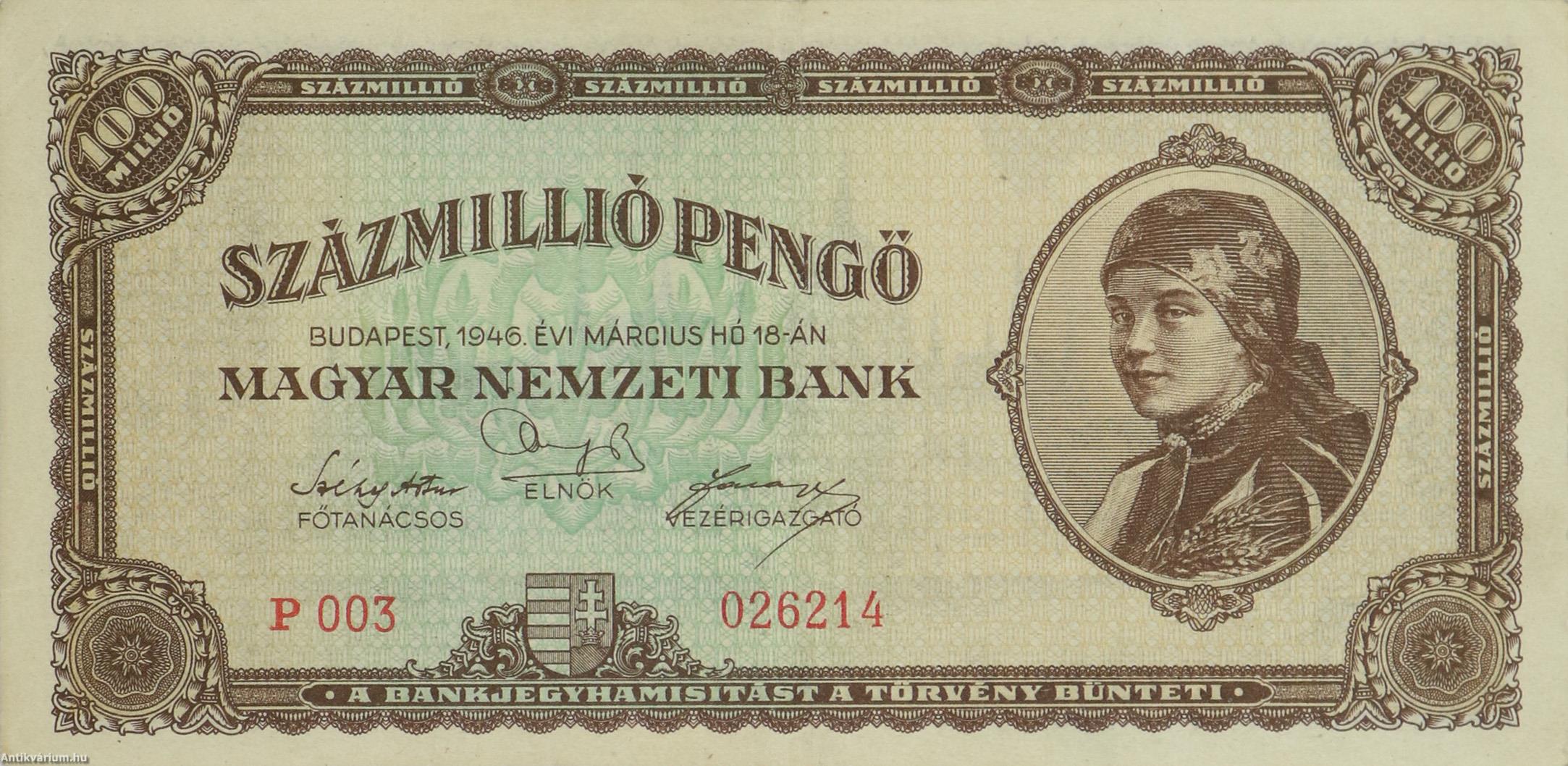 - 100.000.000 pengő névértékű forgalmi bankjegy. Kibocsátotta: Magyar Nemzeti Bank. Kibocsátás ideje: Budapest, 1946. évi március hó 18-án. Tervezte: Helbing Ferenc. Mérete: 159 mm x 79 mm.