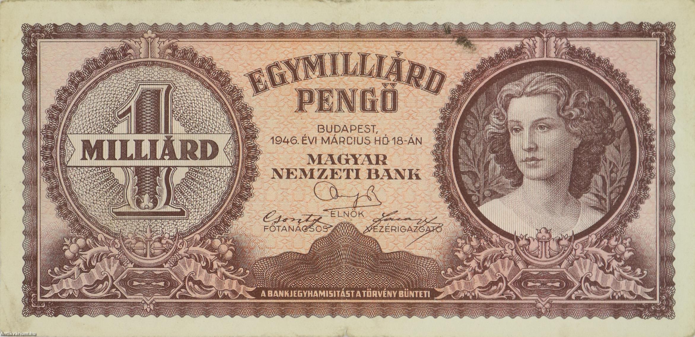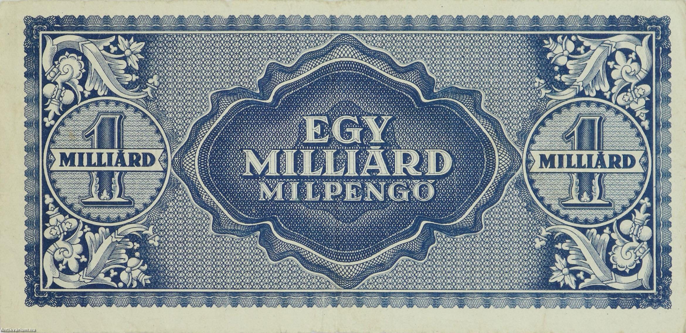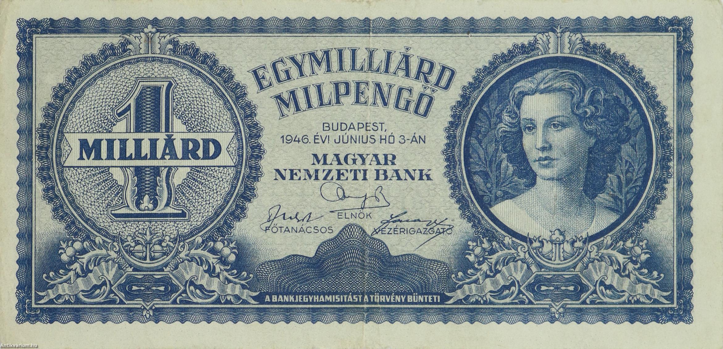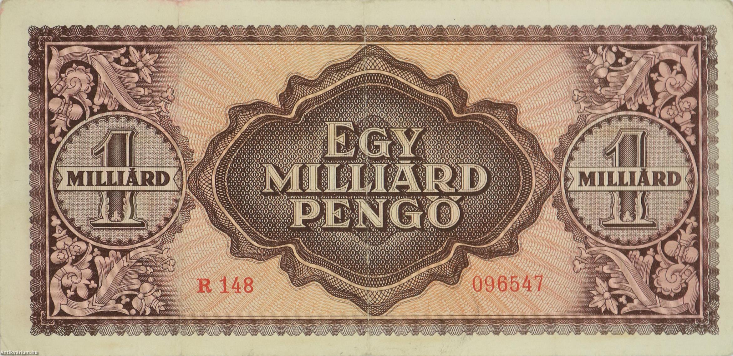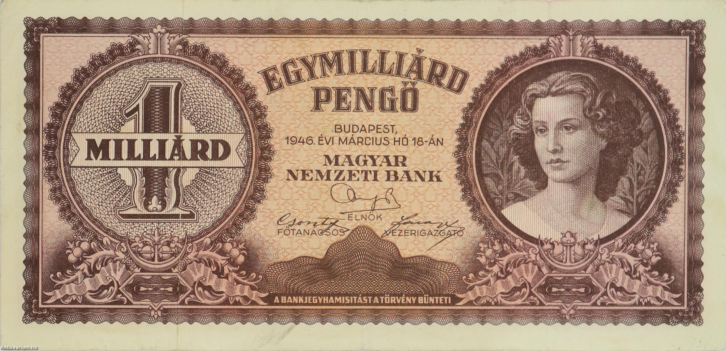 - 1.000.000.000 pengő névértékű forgalmi bankjegy. Kibocsátotta: Magyar Nemzeti Bank. Kibocsátás ideje: Budapest, 1946. évi június hó 3-án. Tervezte: Horváth Endre. Mérete: 174 mm x 84 mm.
