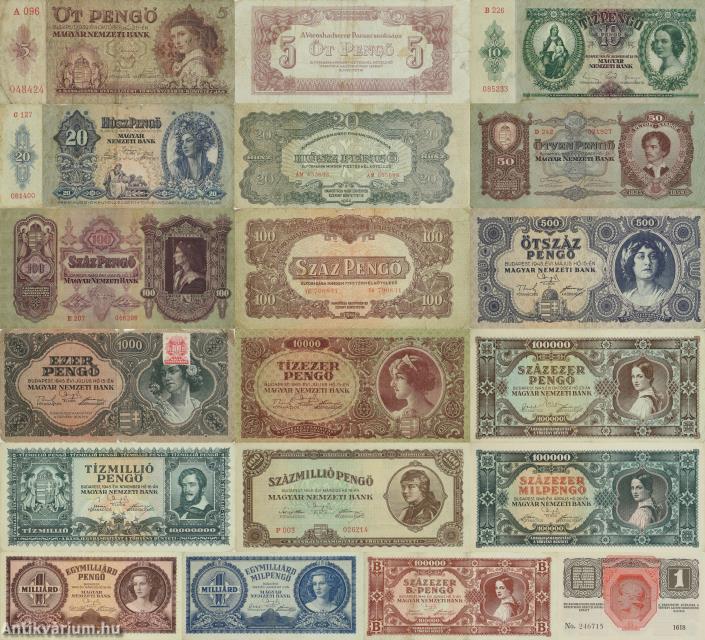 addig használatban levő pengővel. A papírpénzek közül 3 db (1 db 1000 pengős és 2 db 10.000 pengős) Vagyondézsma bélyeggel lett ellátva. A II. világháborút követő infláció miatt az állam bevételeinek növelése érdekében megadóztatták a forgalomban lévő papírpénzek egyes címleteit. Ilyenek volt az 1000, a 10000 és a 100000 pengős bankjegyek, melyek névértéke nem változott, de forgalomban maradásukat csak úgy lehetett biztosítani, hogy egy a névértékük 3-szorosáért vásárolt bélyeget (vagyondézsma bélyeg) ragasztottak fel rájuk. Ezek egyforma mintájúak, de címletenként eltérő színűek voltak. A gyűjtemény tartalma: