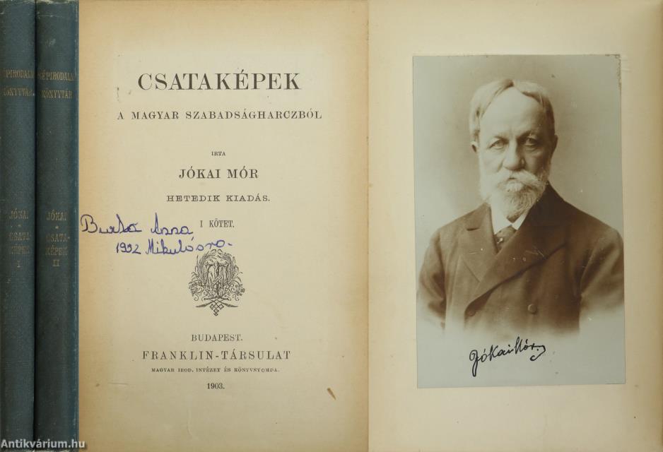 A szerző aláírt fényképével ellátott példány. Csataképek a magyar szabadságharczból I-II. (különálló egységes kötetekben) Írta: Jókai Mór. Az első kötet címlapjának hátoldalán, a szerző beragasztott fényképén Jókai Mór tollal beírt, jól olvasható aláírása látható. Hetedik kiadás. Tartalomjegyzékkel ellátott kötet. A címfedelek belső oldalán Nágel József Ex-librise látható, melynek grafikáját Egry József (1883-1951) festő készítette. Nyomtatta a Franklin-Társulat Nyomdája Budapesten. Kiadói egészvászon kötésben lévő kötetek, dombornyomott feliratozással és díszes keretezéssel ellátott címfedéllel, aranyozott feliratozású könyvgerinccel, a dombornyomott keretezéssel ellátott hátlapon a kötészet feltüntetésével, kiadói előzéklapokkal, mintázott lapélekkel, hiánytalan állapotban. A szerző, Jókai Mór (Komárom, 1825. február 18. – Budapest, 1904. május 5.) író, újságíró, politikus, a "Márciusi Ifjak" egyike. Első regényének a "Hétköznapok"-nak a sikere után az írásnak szentelte az egész életét. A "Pesti Füzetek", majd az "Életképek" szerkesztője volt. Az "Életképek" az idők folyamán egyértelműen politikai lappá alakul át. Jókai ebben cikkeivel a nemzeti politikát támogatja a "Szabadság, egyenlőség, testvériség" eszméjének jegyében. Az "Életképek" után a "Pesti Hírlap" szerkesztését vállalta el, majd megindította az "Esti Lapokat", a radikálisok főorgánumát. A forradalom bukása után Jókai tevékenységét többnyire a "Vasárnapi Újságnak" szentelte, ami ugyan eszmeiségben megegyezett a nagy író gondolataival, de a lapnak politikai okokból a szerkesztője nem lehetett. A 19. századi magyar irodalom rendkívüli népszerűséget elérő, nagy regényírója volt, gazdag és tartalmas életművet hagyott hátra. Regényeinek befogadását, értelmezését a keletkezésüktől az utóbbi évtizedekig a realista és a romantikus stílus kettőssége határozta meg; e két irodalmi stílus ötvözése tette Jókait "a magyar nemzet íróóriásává".