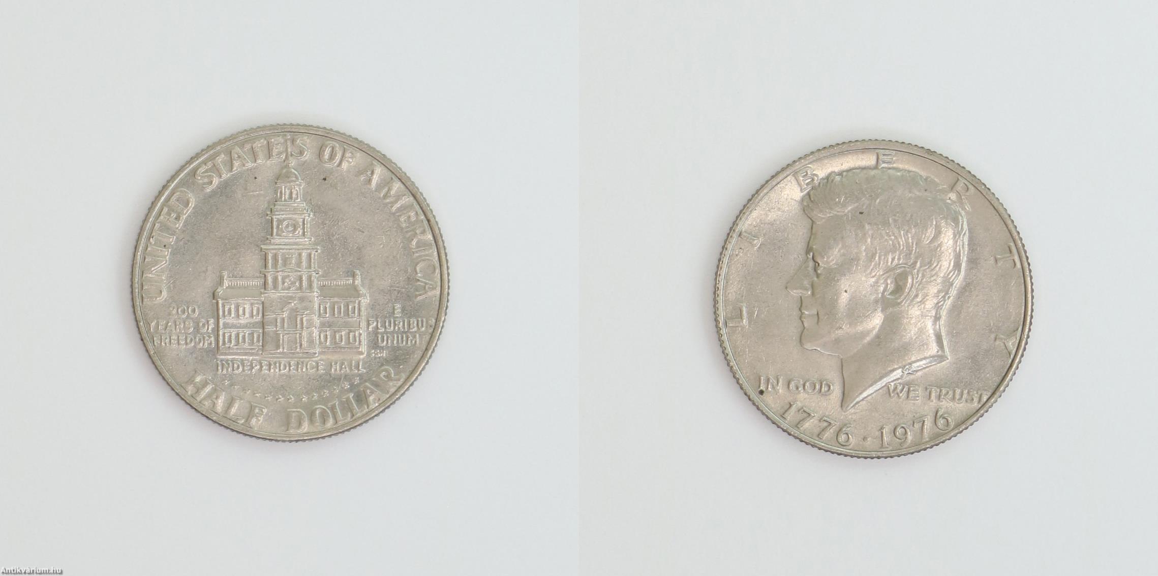 - 1/2 dollár névértékű, John F. Kennedy amerikai elnököt ábrázoló, Az ÜSA függetlenségének 200. évforulója alkalmából, 1976-ban kibocsátott emlékérme (1 db). Összetétele: Réz-nikkellel bevont réz. Súly: 11,34 g. Átmérő: 30,61 mm.