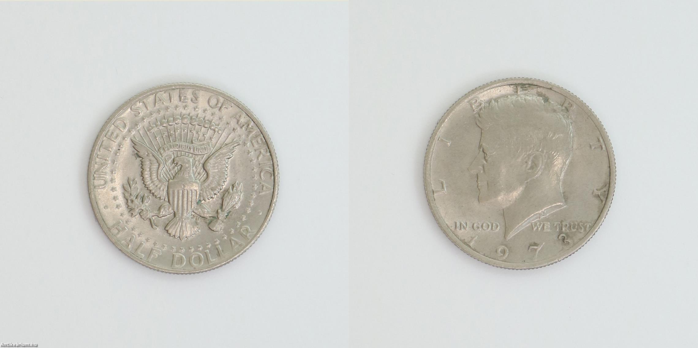 - 1/2 dollár névértékű, John F. Kennedy amerikai elnököt ábrázoló, 1973-ban kibocsátott forgalmi érme (1 db). Összetétele: Réz-nikkellel bevont réz. Súly: 11,34 g. Átmérő: 30,61 mm.