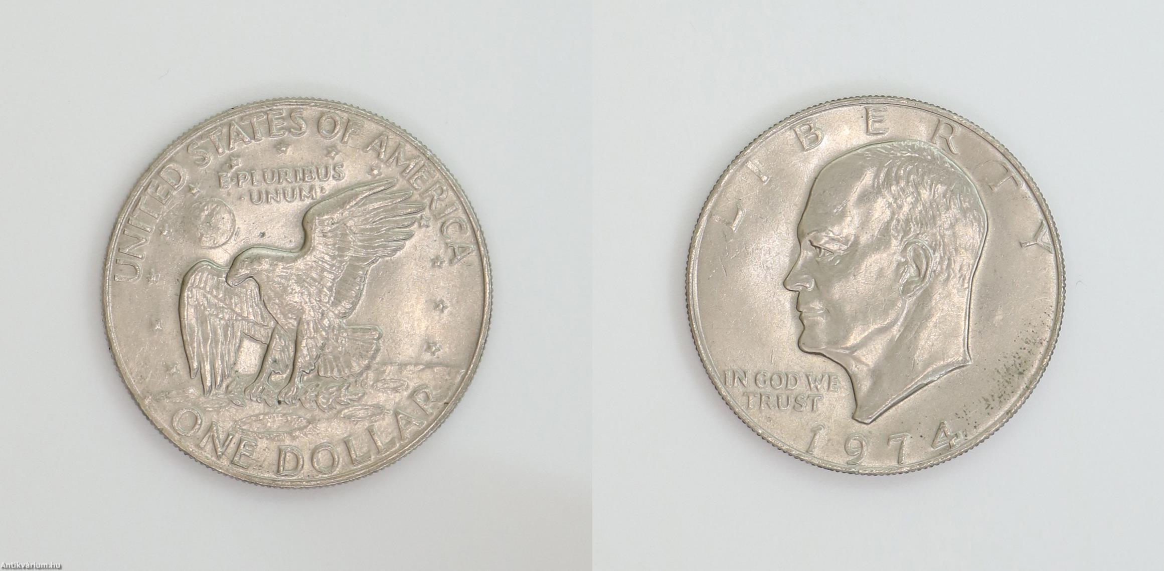 - 1 dollár névértékű, Dwight D. Eisenhower amerikai elnököt ábrázoló, 1974-ben kibocsátott forgalmi érme (1 db). Összetétele: Réz-nikkellel bevont réz. Súly: 22,68 g. Átmérő: 38,1 mm.
