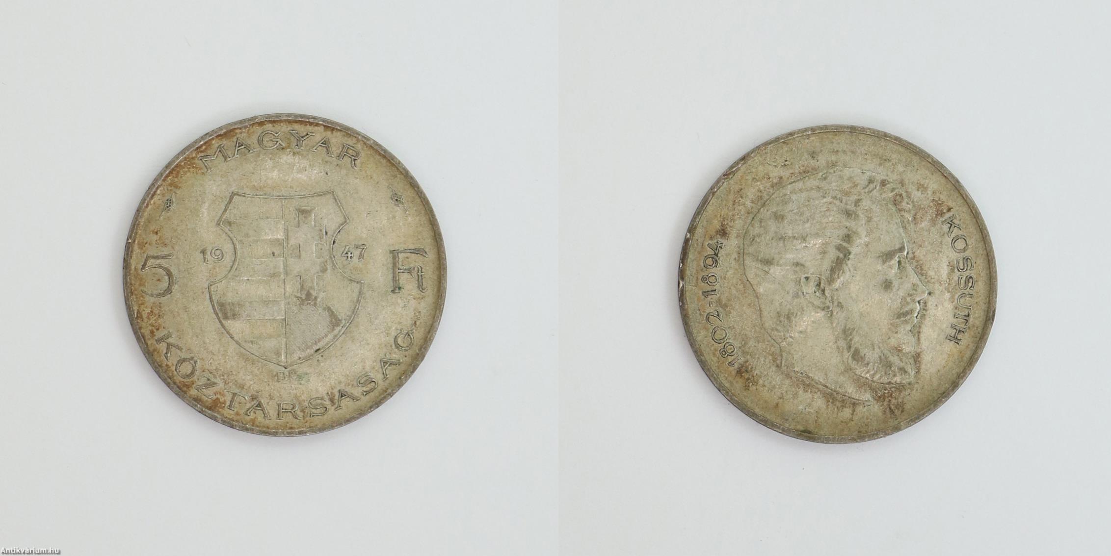 - 5 forint névértékű, Kosssuth Lajost ábrázoló, 1947-ben kibocsátott forgalmi érme (1 db). Összetétele: Ezüst 0.500 (50 % tisztaságú ezüst). Súly: 12 g. Átmérő: 32 mm.