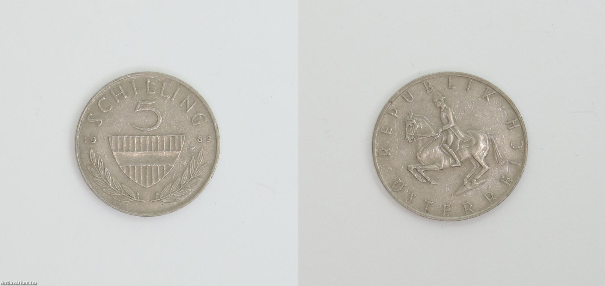 - 5 schilling névértékű, 1969-ben kibocsátott forgalmi érme (1 db). Összetétele: Réz-nikkel ötvözet. Súly: 4,8 g. Átmérő: 23,5 mm.