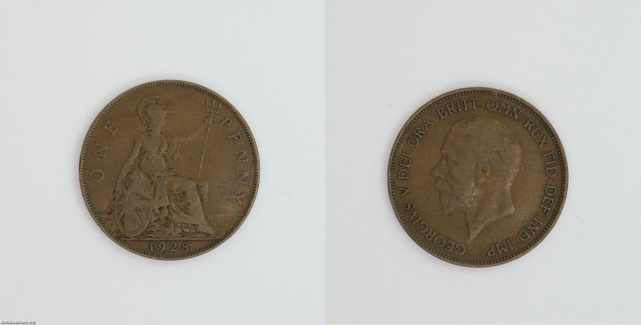 - 1 penny névértékű, 1928-ban kibocsátott forgalmi érme (1 db). Összetétele: Bronz. Súly: 9,45 g. Átmérő: 30,8 mm.