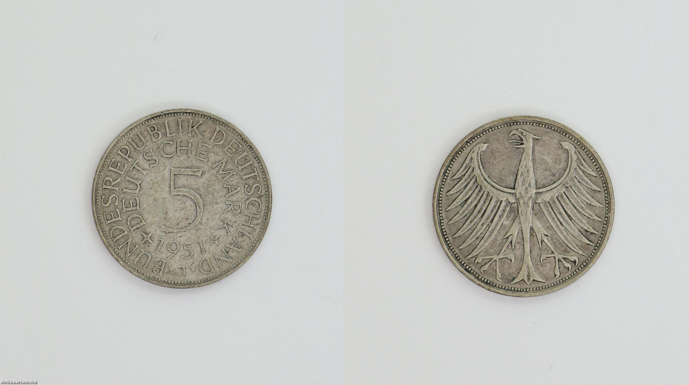 - 5 márka névértékű, 1951-ben kibocsátott forgalmi érme (1 db). Összetétele: Ezüst 0.625 (62,5 % tisztaságú ezüst). Súly: 11,2 g. Átmérő: 29 mm.
