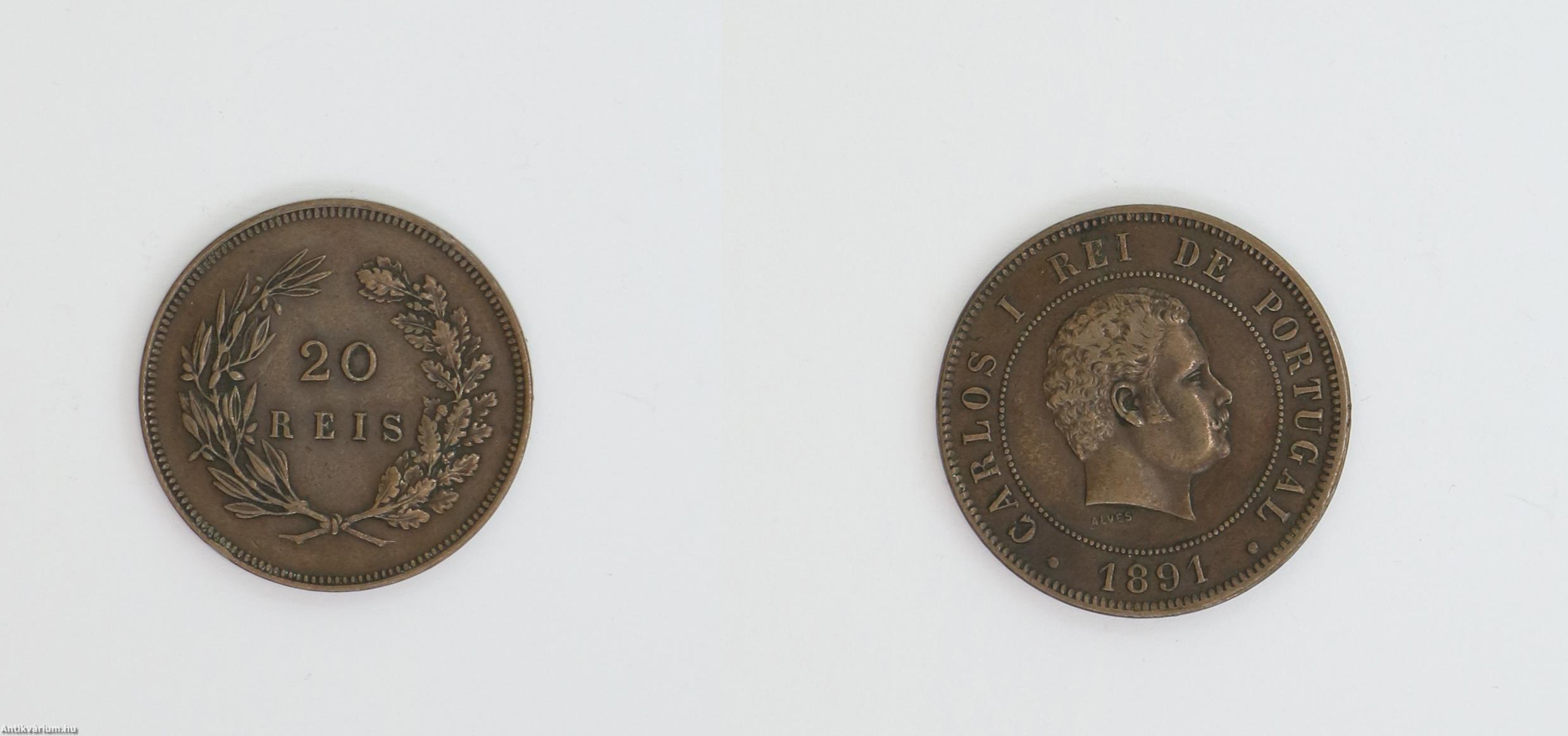 - 20 reis névértékű, 1891-ben kibocsátott forgalmi érme (1 db). Összetétele: Bronz. Súly: 12 g. Átmérő: 30 mm.