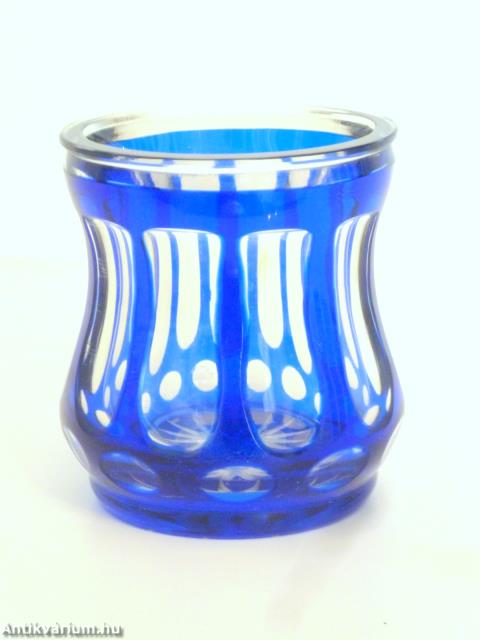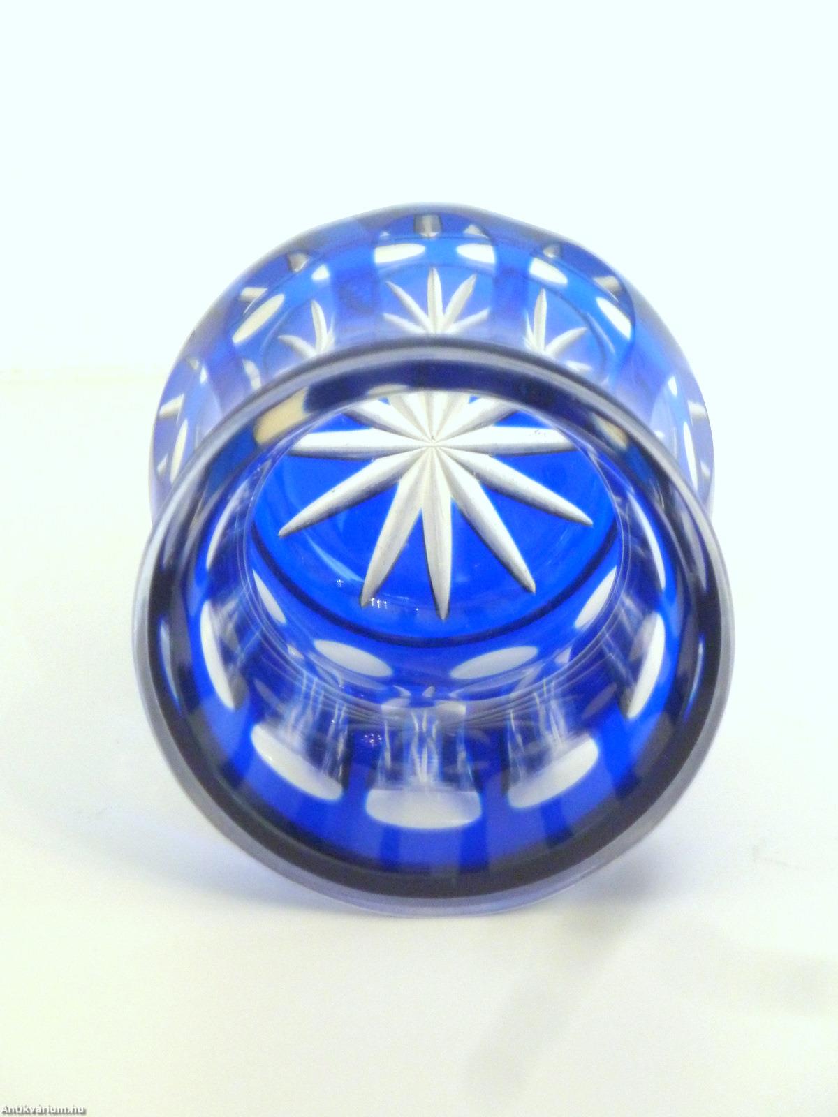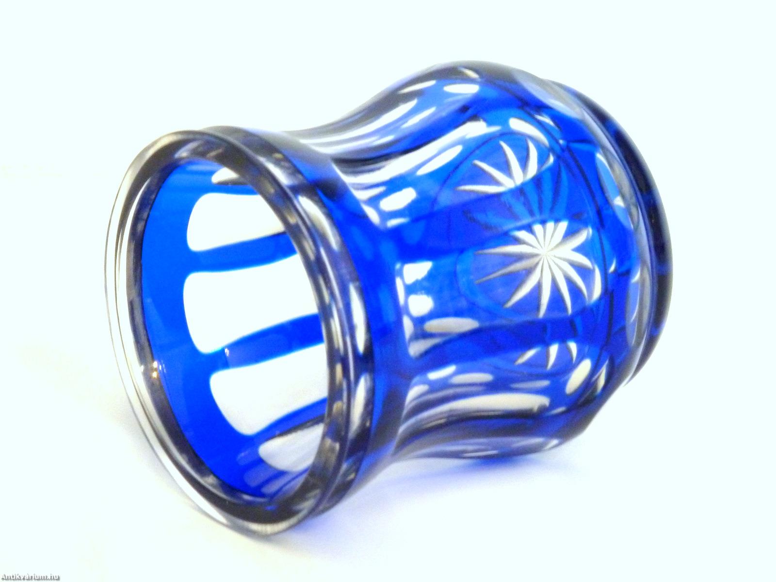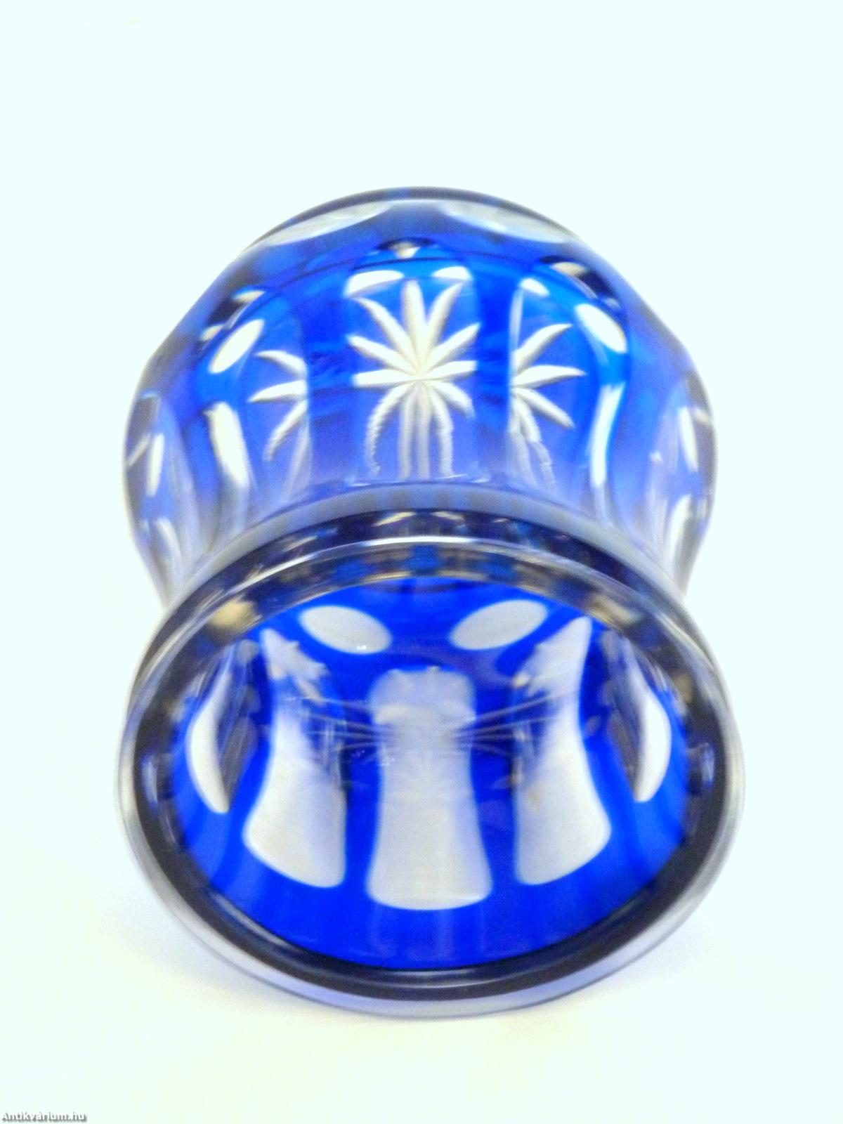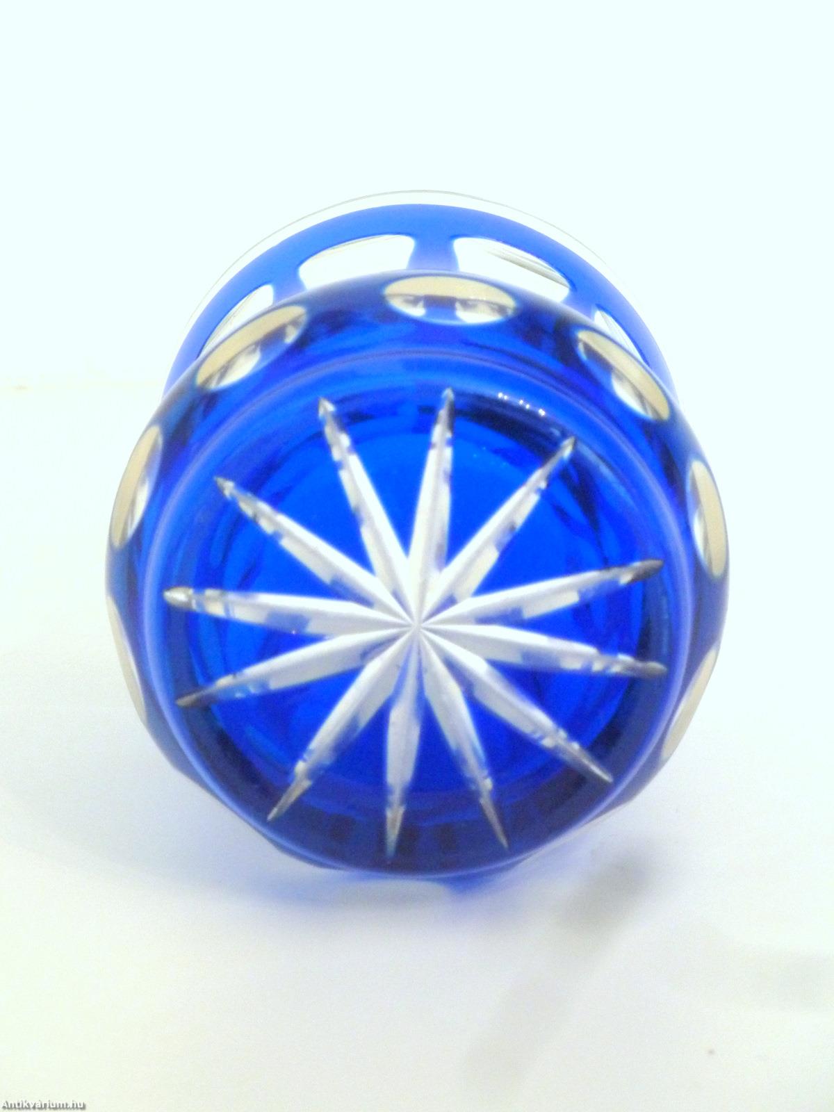 Hibátlan állapotú, fújt és kézzel formázott, finom csiszolású Haida art deco kristály üveg váza a 20. század elejéből. A vastagfalú, többrétegű üveg mélyen és egyenletesen vágott, kifinomult csiszolásokkal díszített, amelyek megjelennek az egész felületen. A külső üvegrétege kék színű, benne színtelen üvegrétegű geometriai formákat ábrázoló visszacsiszolások láthatóak. A szabályosan megjelenő, ismétlődő motívumnak kiváló hátteret ad az üveg váza, hengeres alakja, amelynek felületén szinte megsokszorozódik az überfang csiszolás optikai képe. Az osztott mintázat csiszolt, vágott perem részben végződik. Talpát csillag formájú, mély bemetszés díszíti. Különleges igényességgel készített jellegzetes art deco művészi üveg váza.