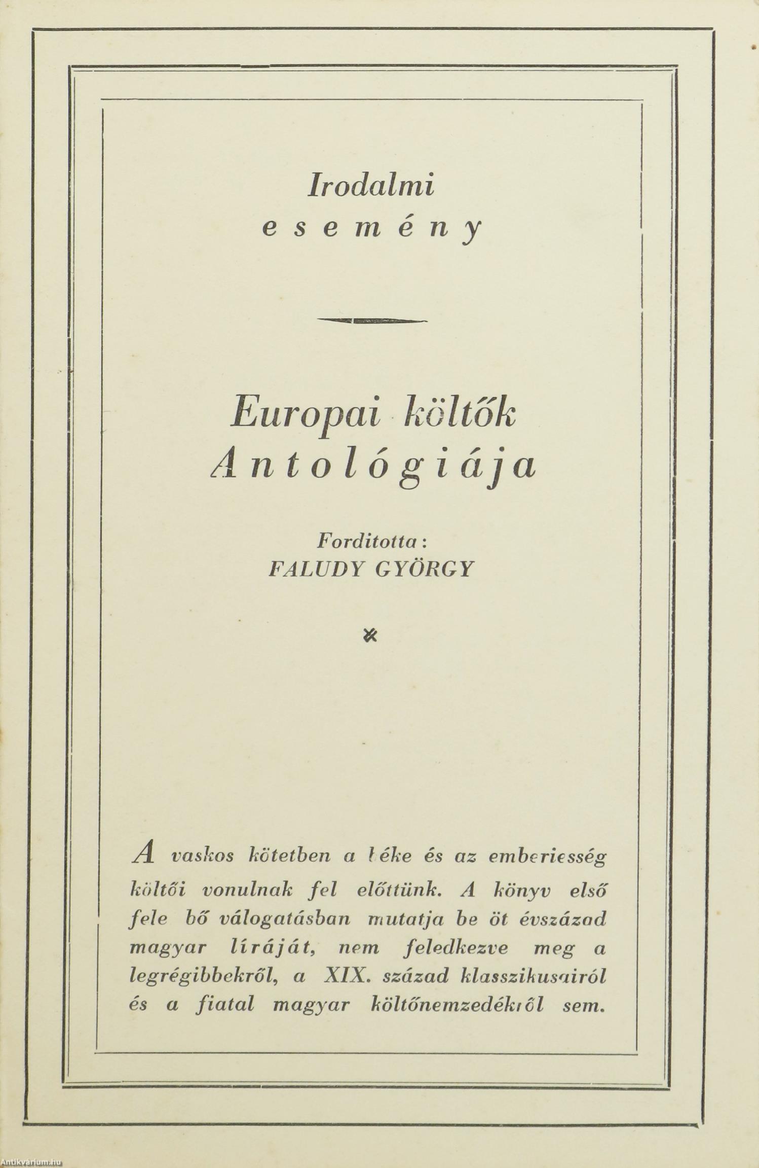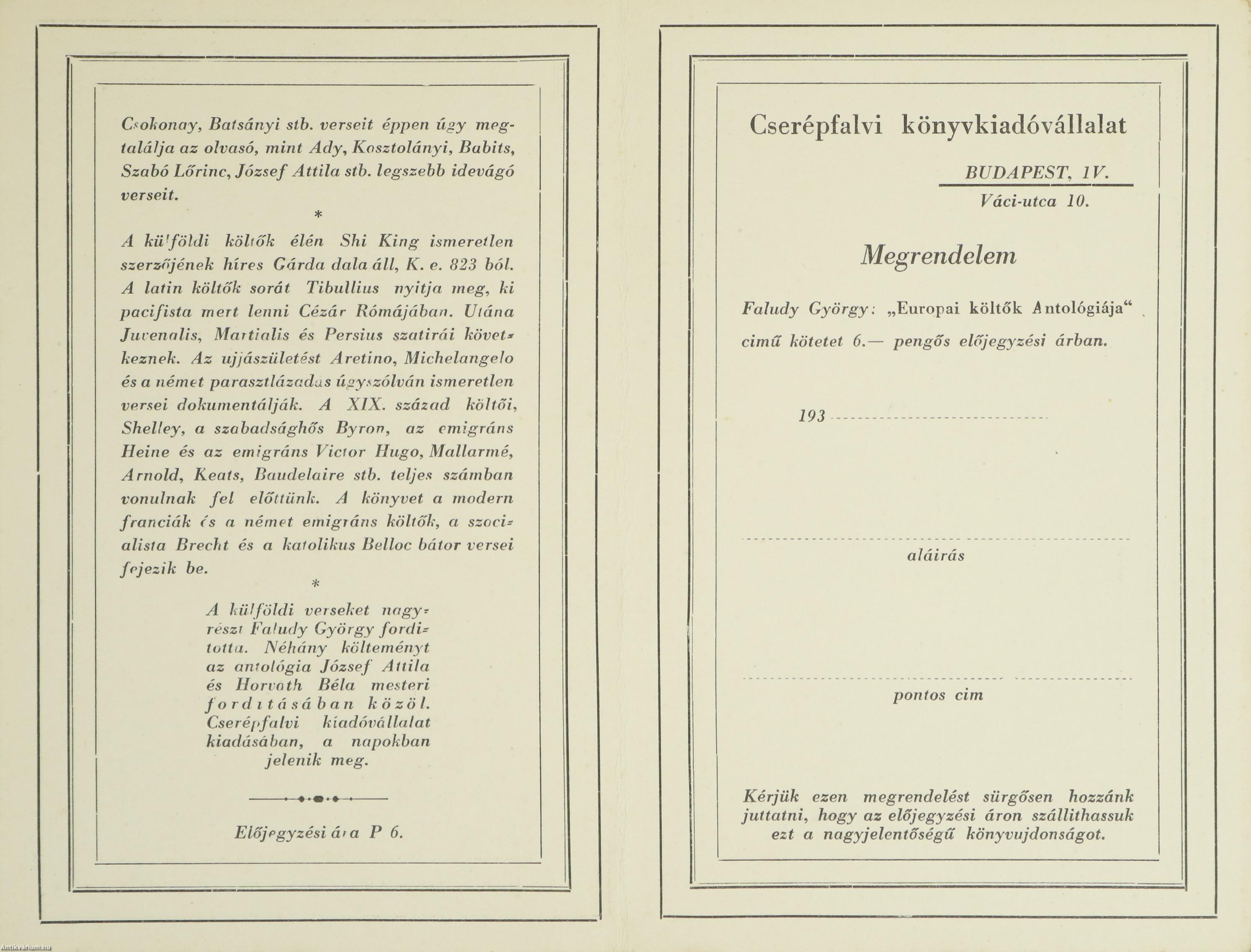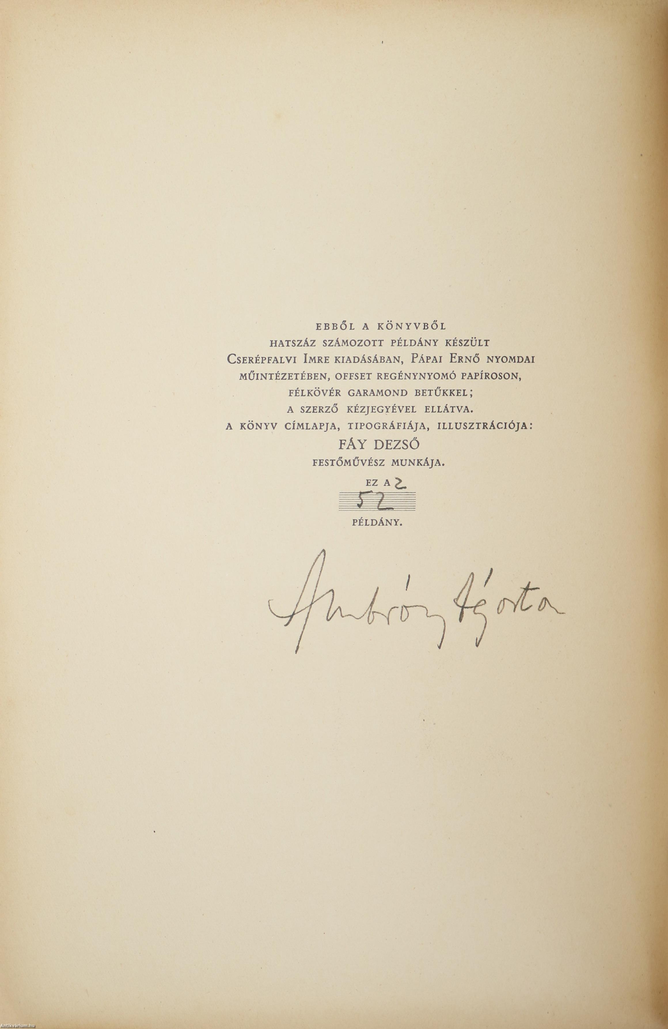 Szerző által aláírt példány.Első, számozott, bibliofil kiadás. Madár. Versek. Írta: Ambrózy Ágoston. A címlap verzóján, a számozás alatt a szerző, Ambrózy Ágoston tollal beírt aláírása látható. "Ebből a könyvből hatszáz számozott példány készült Cserépfalvi Imre kiadásában, Pápai Ernő Nyomdai Műintézetében, offset regénynyomó papíroson, félkövér Garamond betűkkel; a szerző kézjegyével ellátva. A könyv címlapja, tipográfiája, illusztrációja: Fáy Dezső festőművész munkája. Ez az 52. példány." Kötetvégi tartalomjegyzékkel. Kiadói tűzött papírkötésben lévő példány feliratozatlan címfedéllel és hátlappal, tiszta belívekkel, hiánytalan állapotban, a gerinc mentén a könyvtesthez rögzített, színes, feliratos, kiadói emblémás borítófedélben. Különálló, egyedi melléklet: A Cserépfalvi Könyvkiadóvállalat kitöltetlen megrendelőlappal ellátott, korabeli könyvreklámja a Faludy György fordításában megjelent Európai költők antológiája c. kötethez (4 p. terjedelemben).