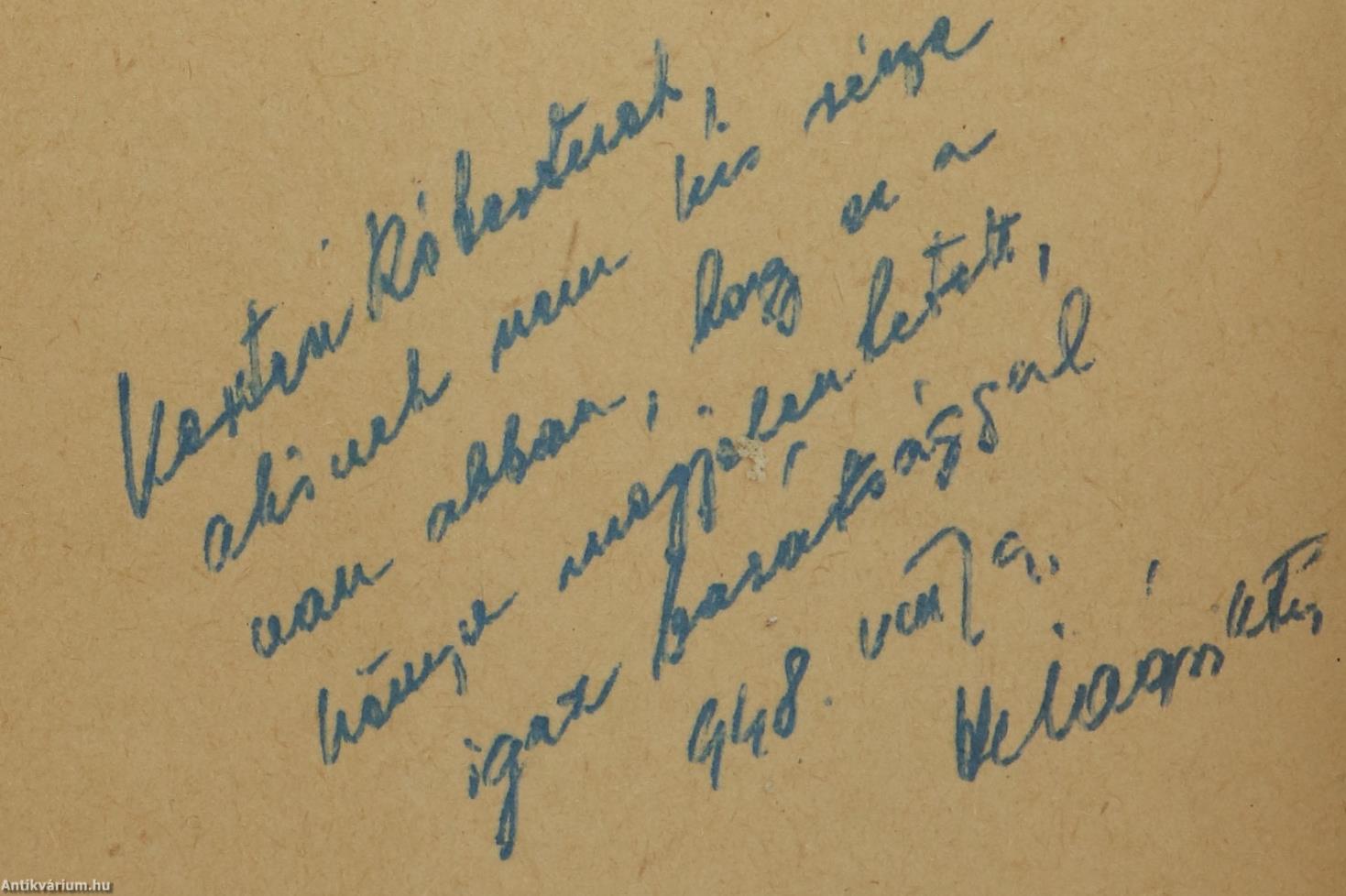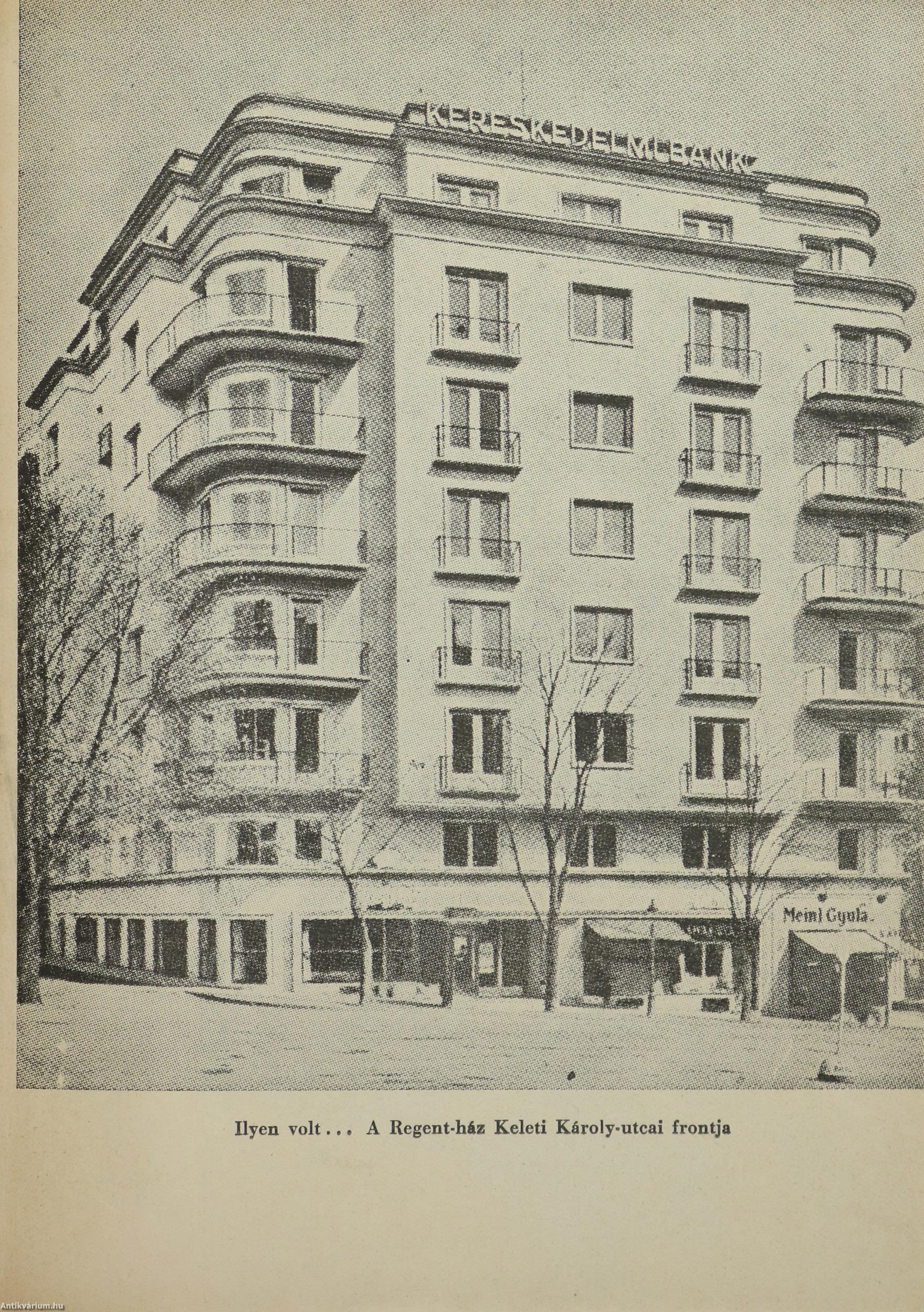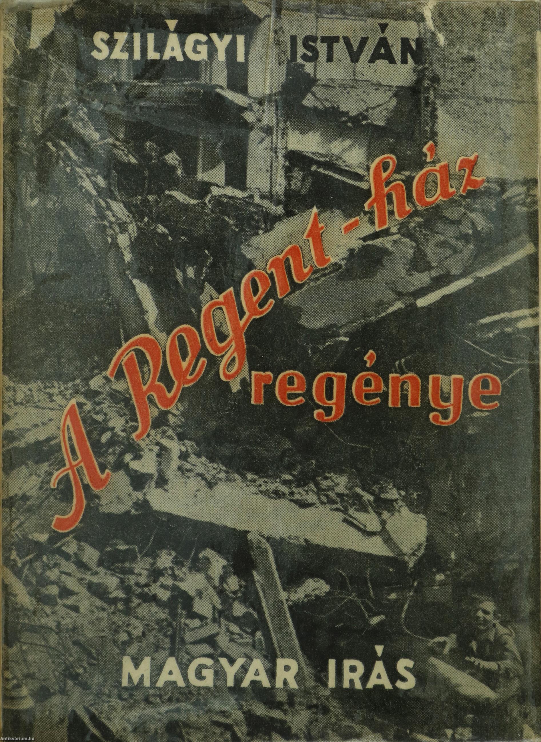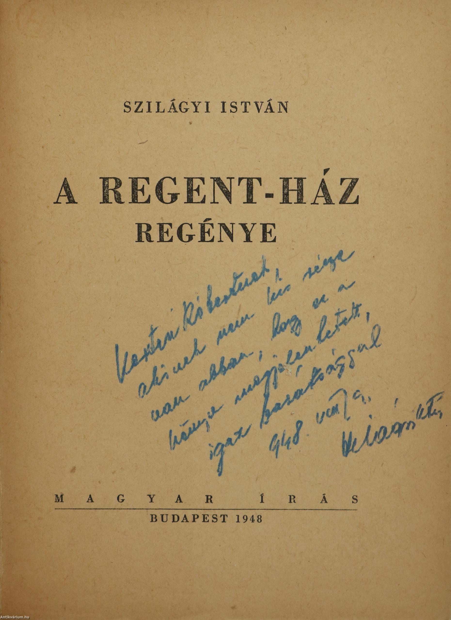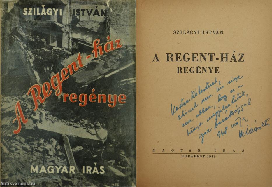Szerző által dedikált példány.Első kiadás. A Regent-ház regénye. Írta: Szilágyi István. A címlapon a szerző, Szilágyi István tollal beírt, névre szóló dedikációja olvasható: "K. R.-nek, akinek nem kis része van abban, hogy ez a könyv megjelenhetett, igaz barátsággal 948. VIII. 9. Szilágyi István" 8 képtáblán fekete-fehér fotókkal illusztrált, tartalomjegyzékkel ellátott kötet. Nyomtatta a Független Nyomda, Budapesten. A Regent-ház fényképét Seidner Zoltán, a bontásról készült felvételeket a MAFIRT bocsátotta rendelkezésre. Kiadói varrott papírkötésben lévő példány feliratozatlan címfedéllel, könyvgerinccel és hátlappal, tiszta belívekkel, hiánytalan állapotban, fekete-fehér fotóval illusztrált, fülszöveges, megerősített kiadói borítófedélben.