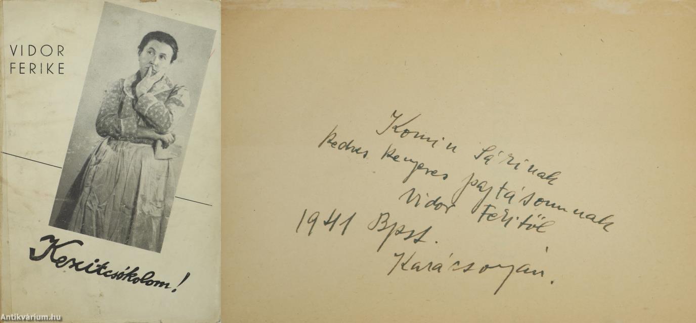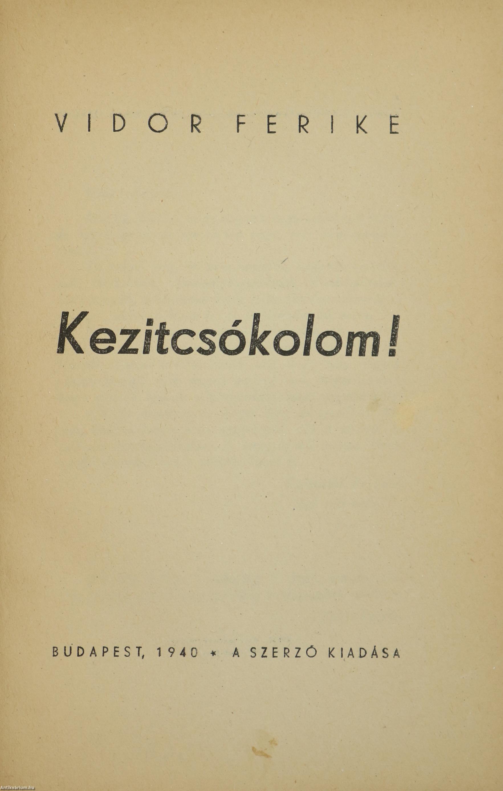 Szerző által dedikált példány.Első kiadás. Kezitcsókolom! Írta: Vidor Ferike [Wechselmann Franciska]. Az előlapon a szerző, Vidor Ferike tollal beírt, névre szóló dedikációja olvasható: "K. S.-nak kedves kenyeres pajtásomnak Vidor Feritől 1941 Bpst. Karácsonyán." Előszó gyanánt Tersánszky Józsi Jenő a szerzőhöz írt levelével. Nyomtatta a Révai Nyomda, Budapesten. A borítón levő fénykép Foto Marian műtermében készült. Kiadói varrott papírkötésben lévő példány feliratozatlan címfedéllel és hátlappal, tiszta belívekkel, hiánytalan állapotban, a gerinc mentén a könyvtesthez rögzített, a szerző fotójával illusztrált kiadói borítófedélben.
