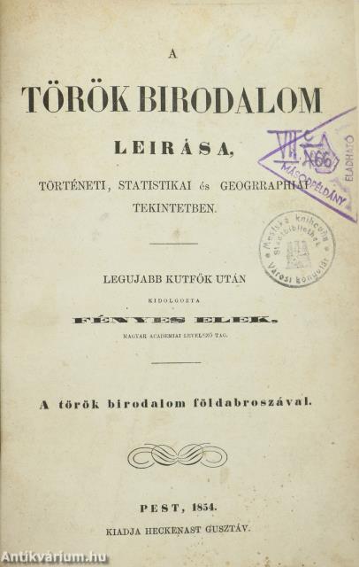 Első kiadás. A török birodalom leirása, történeti, statistikai és geographiai tekintetben. Legujabb kutfők után kidolgozta: Fényes Elek magyar academiai levelező tag.