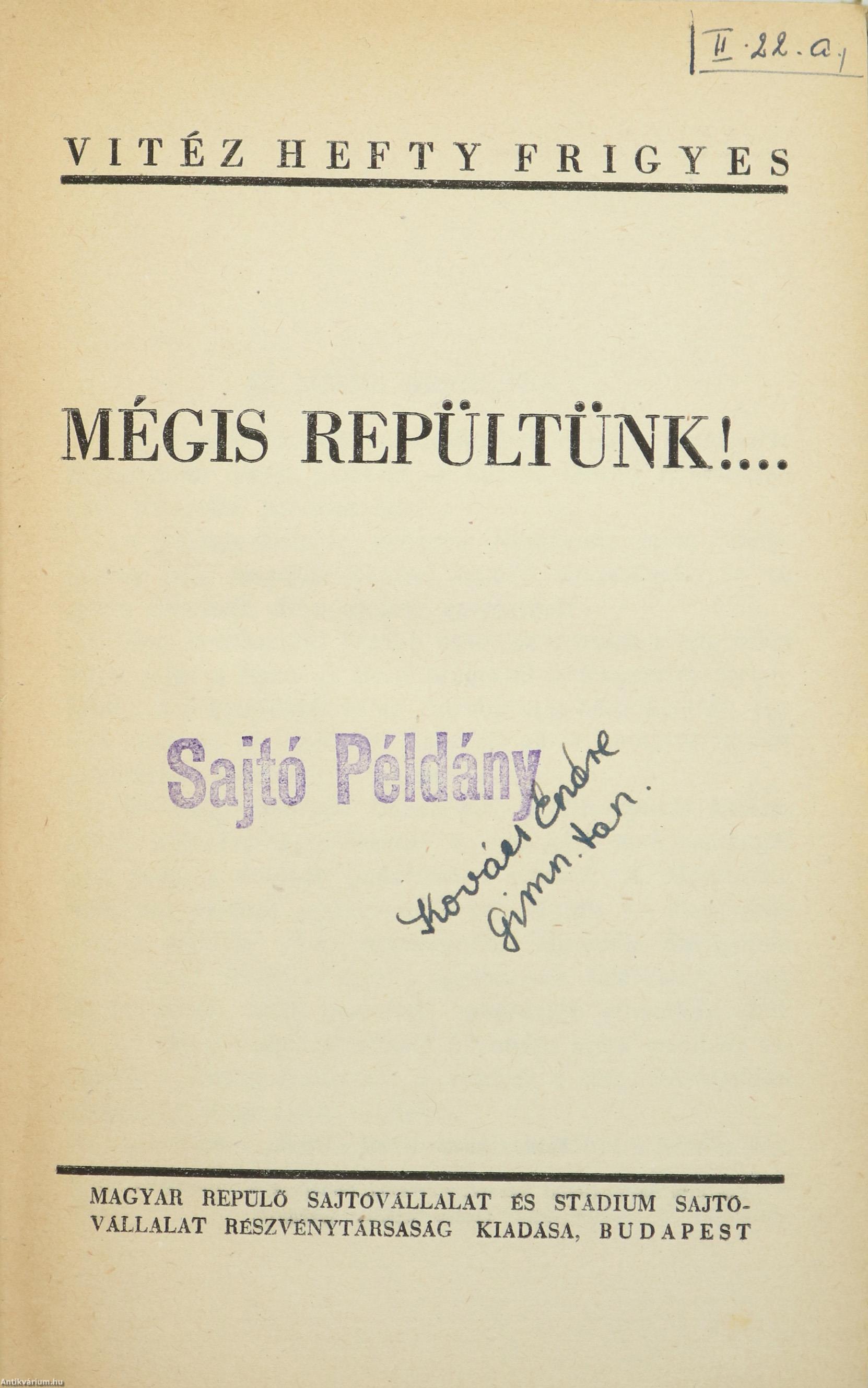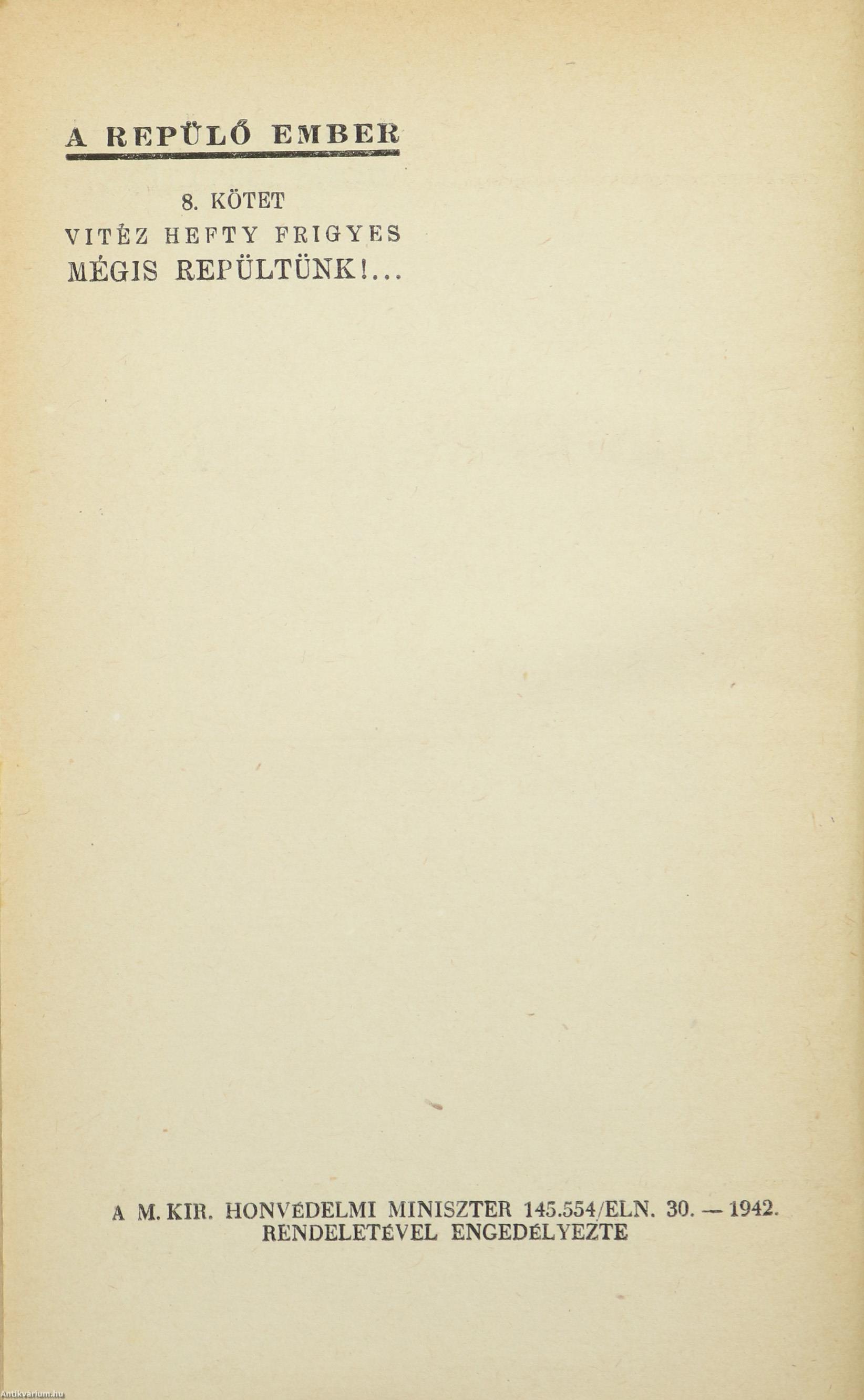Első kiadás. A Repülő Ember. No.: 8. sz. Mégis repültünk!... Írta: vitéz Hefty Frigyes. A Magy. Kir. Honvédelmi Miniszter 145.554/ELN.30-1942 sz. rendeletével engedélyezte. Fekete-fehér, feliratos eredeti fényképekkel (8 t.) illusztrált, valamint bevezetővel és részletes tartalomjegyzékkel kiegészített kötet. A címlapon tollal írt tulajdonosi bejegyzés és "Sajtó példány" bélyegzés látható. Nyomtatta a Stádium Sajtóvállalat Részvénytársaság, Budapesten. Kiadói félvászon kötésben lévő példány feliratozatlan, repülős emblémával ellátott, dupla keretes címfedéllel, feliratos könyvgerinccel, kiadói előzéklapokkal, hiánytalan, jó állapotban. A szerző, Vitéz Hefty Frigyes Sándor (Pozsony, 1894. december 13. – Detroit, 1965. január 10.) vadászpilóta, szakíró. Az első világháború kitörésekor önként jelentkezett a hadseregbe és alapkiképzést követően elvégezte a katonai pilóta tanfolyamot. Az olasz fronton harcoló, Sankt Veit bázisú 12. repülőszázadhoz került. Tábori pilóta jelvényt szerzett. Az Osztrák–Magyar Légjáró Csapatok egyik 5 igazolt légi győzelmet arató vadászpilótája lett. Ő volt az első olyan pilóta, akinek lelőtték a gépét és az ejtőernyő mentette meg az életét. 1917 áprilisában a román frontra került, itt aratta első igazolt légi győzelmét. Századánál összebarátkozott a kiváló pilóta Risztics Jánossal és Udvardy Nándorral. Miután mindhármukat kitüntették az Arany Vitézségi Éremmel, csapatukat az "arany triumvirátus" néven emlegették. Az első világháborúban összesen 383 bevetésen vett részt. A fegyverszünet után visszatért Magyarországra és a Tanácsköztársaság Vörös Légierejének 8. repülőszázadában harcolt a szomszédos országok intervenciós haderői ellen. A harcok elmúltával a szegedi postajárat pilótája volt, majd külföldön dolgozott. A második világháborúban visszatért a fegyveres erőkhöz, 1942. március 1-én a légierő zászlósává, július 1-én hadnaggyá léptették elő. A Honvédelmi Minisztérium tisztviselőjeként, a szertár állományában, majd haditudósítóként dolgozott. Főhadnagyként esett amerikai fogságba. 1950-ben a magyarországi kommunista hatalomátvétel után az Egyesült Államokba emigrált. Detroitban élt egészen 1965. január 10-i haláláig.