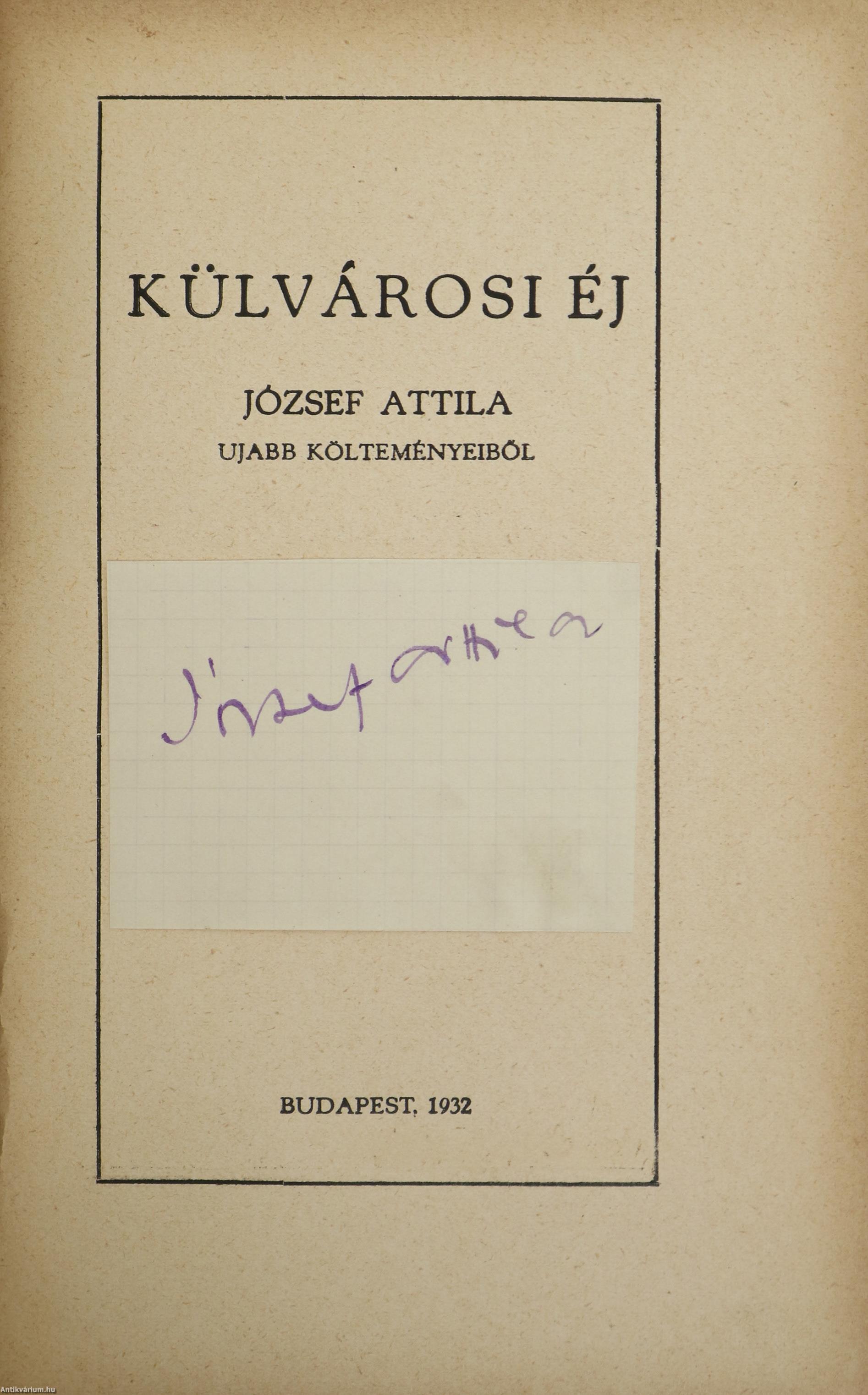 A szerző aláírásával ellátott példány. Első kiadás. Külvárosi éj. József Attila ujabb költeményeiből. Írta: József Attila.