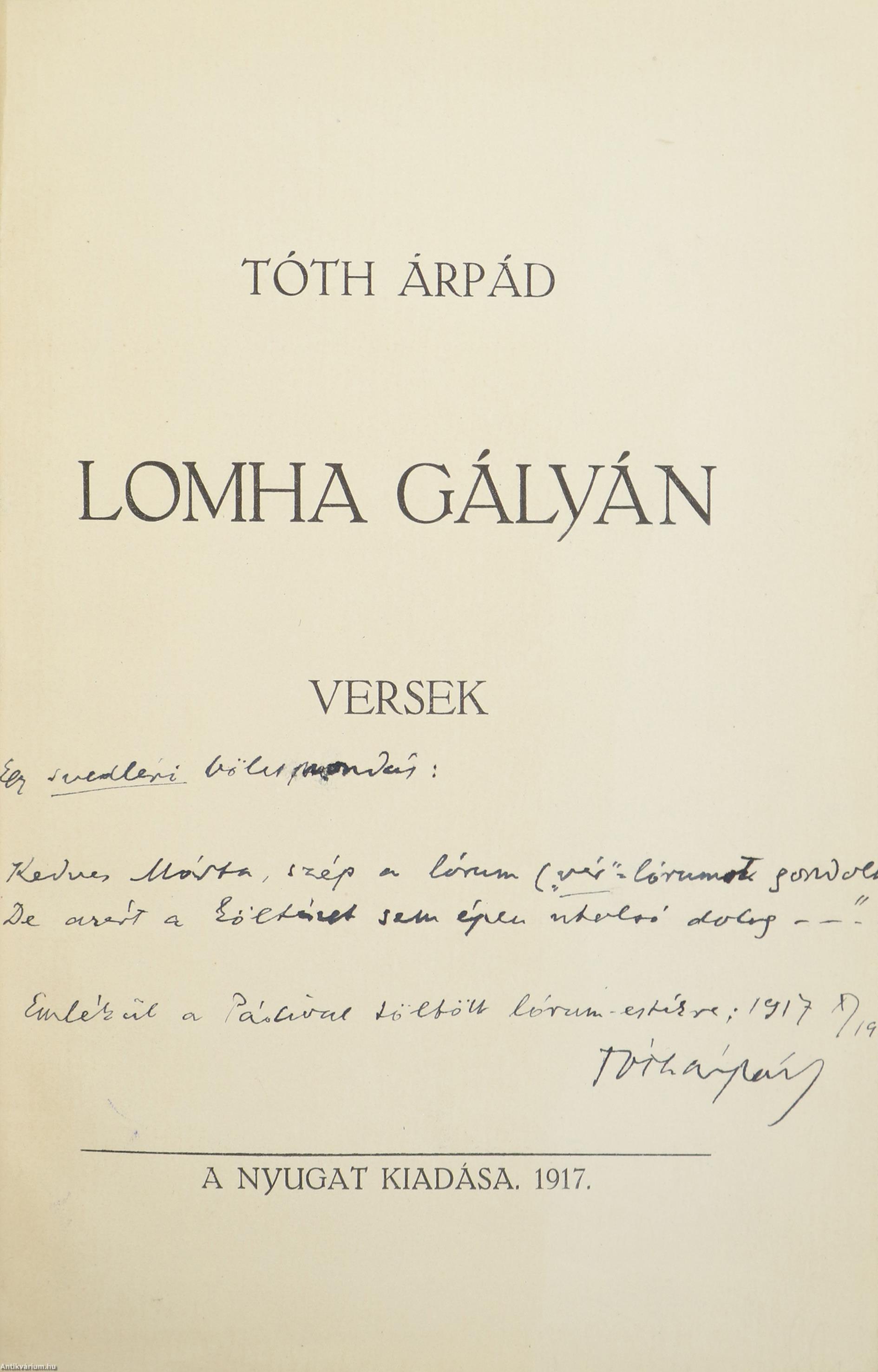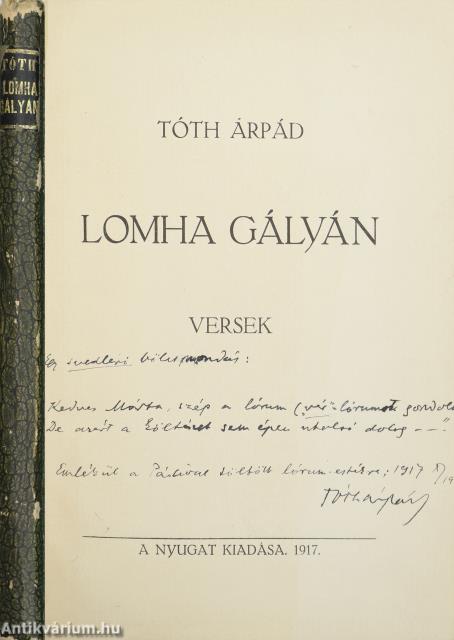 A Lomha gályán 1917 áprilisában jelent meg (Corvina, 1917. ápr. 10. 45.), most előkerült példányába a költő ezt a kétsoros kis alkalmi verssel „megfejelt” dedikációt írta: